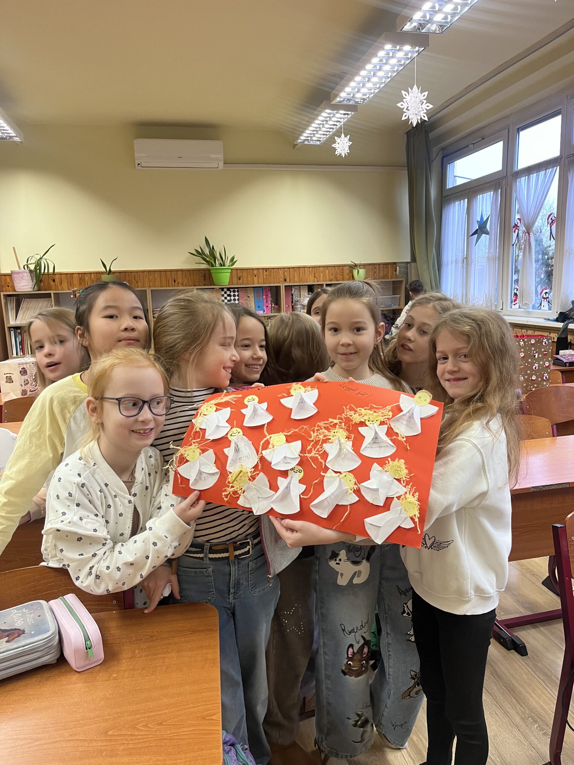 Majd a gyerekek kartonra ragasztott angyalkákat készítettek, amelyekbe az óra elején megbeszélt jókívánságokat, kedves üzeneteket írták vagy rajzolták. Az elkészült angyalkák egy közös felületre kerültek, így az osztály egy ünnephez is illeszkedő alkotást hozott létre.