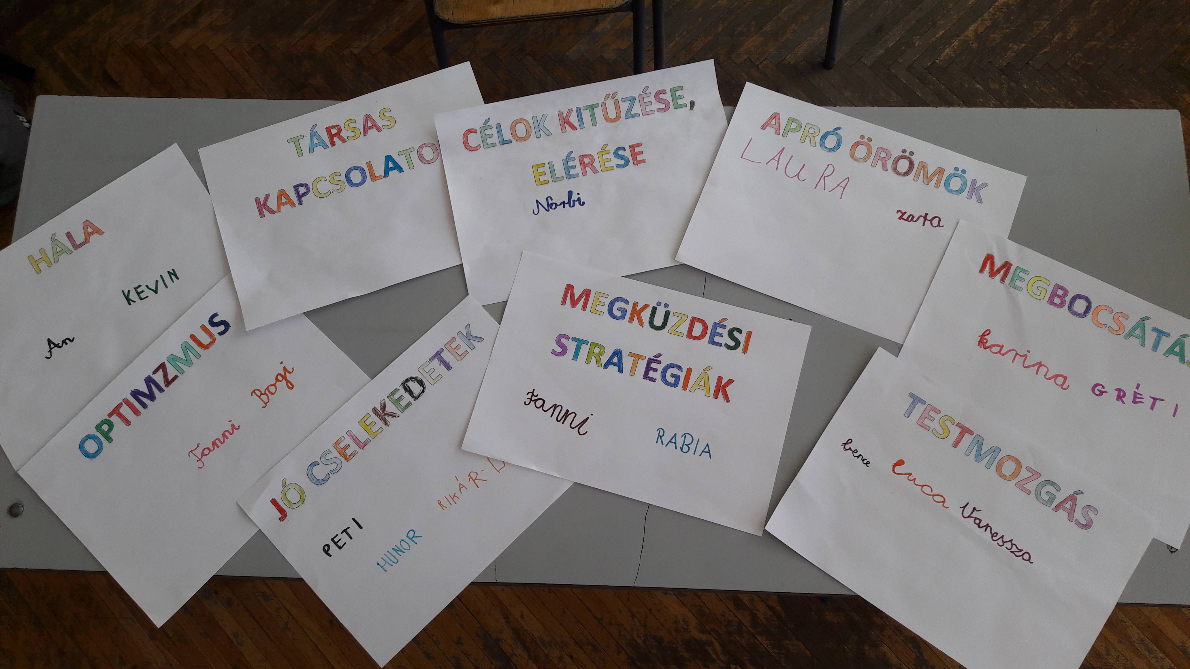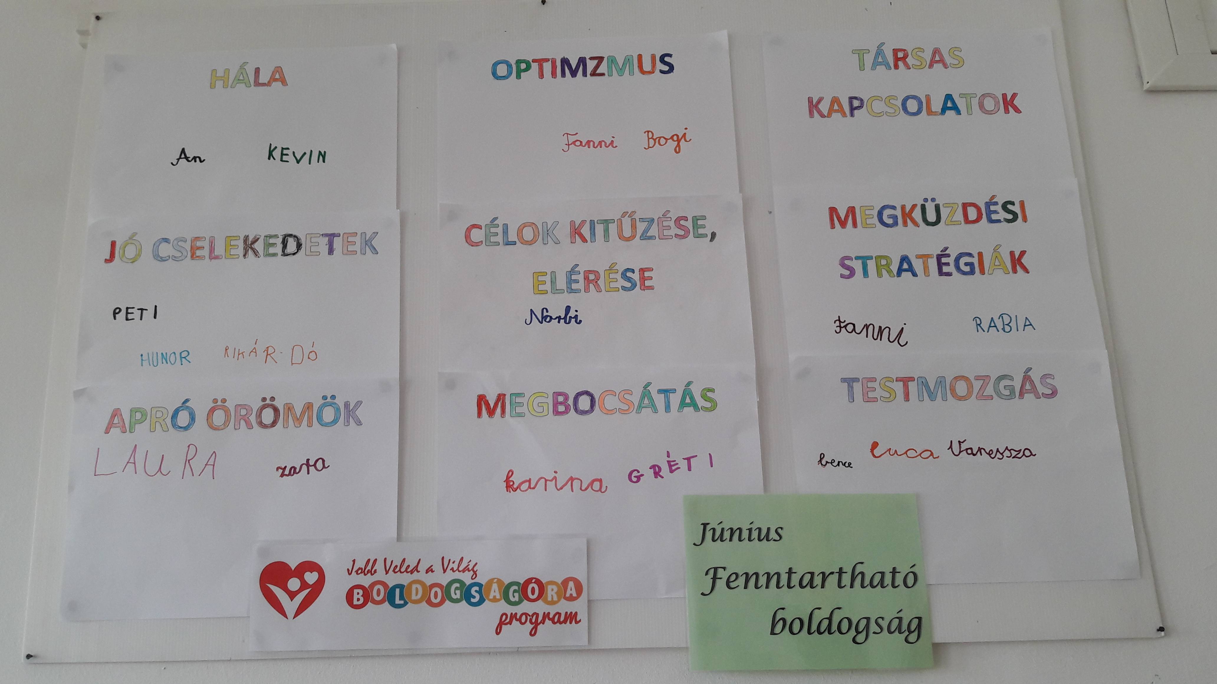 A tanév utolsó napjain sokat játszottunk a Pozitivity társasjátékkal. Nagy sikere volt a gyerekeknél. Összegyűjtöttük az év témáit, és mindenki kiválaszthatta a számára legkedvesebbet. Az év végi plakátunkra pedig legnagyobb örömünkre már mindenki saját maga írta fel a nevét a megfelelő helyre.
