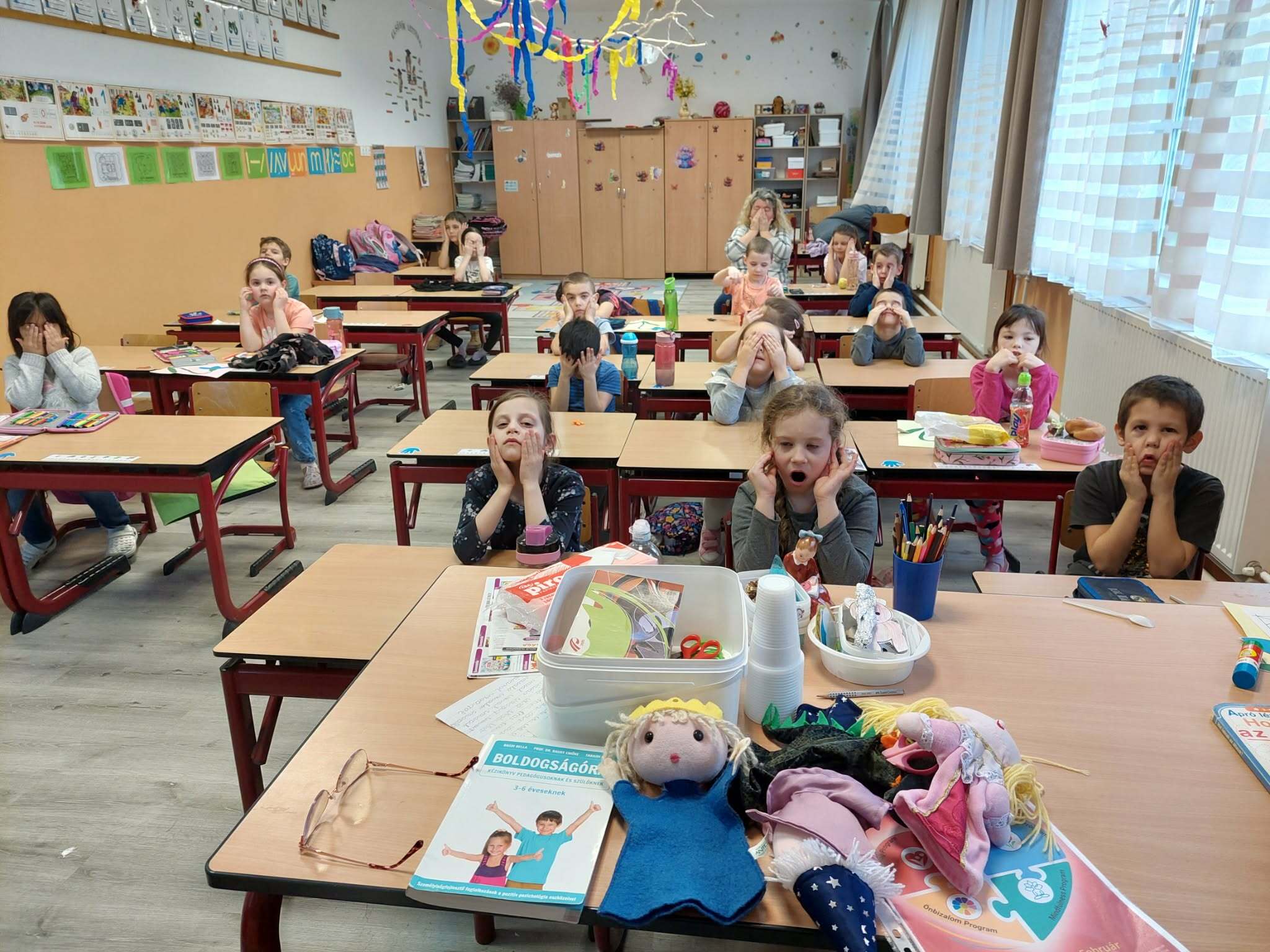 Az első osztályosoknak nagycsoportban én voltam az óvónénijük. A Boldogságórákat már kiscsoport óta tartom számukra. Az óvoda-iskola átmenet Boldogságórákkal, amely a mesterprogramom fő célja, a gyermekek beilleszkedését segíti az iskolába. A Boldogságórát hatodik alkalommal tartottam az osztályban.