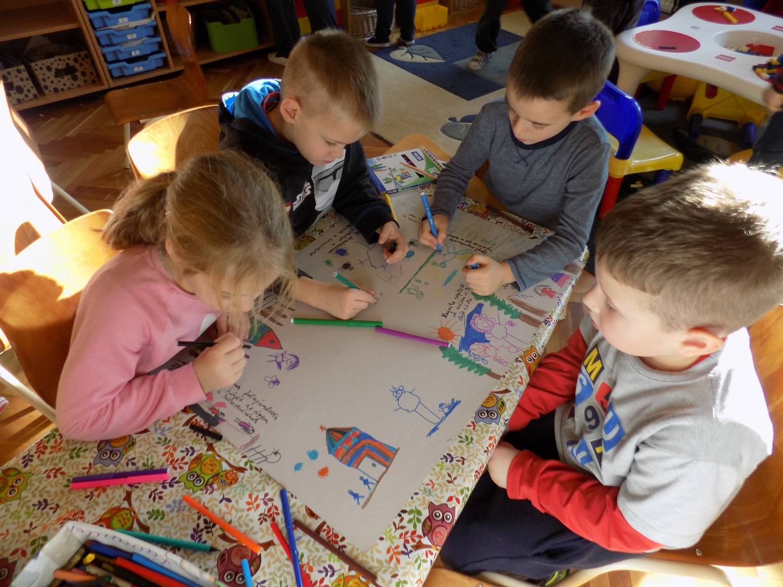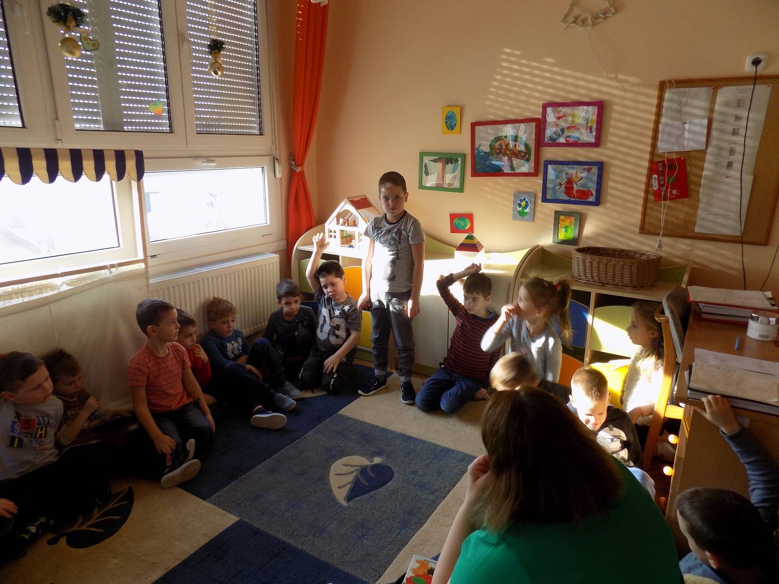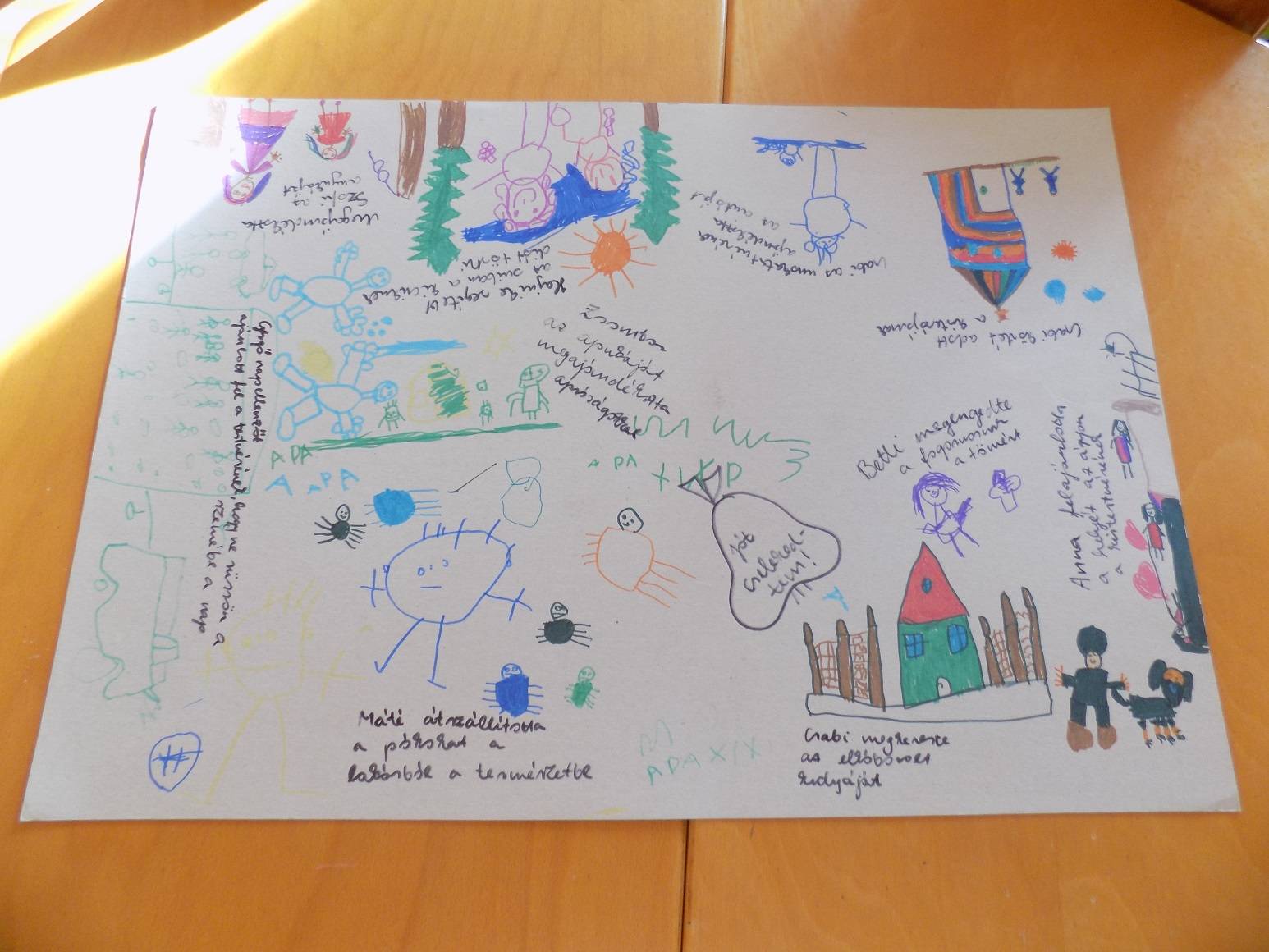 E havi élményeink a rászorulóknak történő könyvek gyűjtésével és ezzel kapcsolatos gondolatok, érzelmek megbeszélésével kezdődött. A következő kérdések fogalmazódtak meg a gyerekek fejében: Miért is gyűjtjük a könyveket? Ezzel segítünk másoknak? -ha igen, akkor jót cselekszünk? Miért érdemes jót tenni? Ki, milyen jó cselekedetet hajtott már végre. Karácsony közeledtével elmeséltem a gyerekeknek Az ezüst hajú angyalka című mesét, amelyben az angyalka egy este leforgása alatt nagyon sok jót cselekedett. Később -egy spontánul kialakult beszélgetőkör keretében- arról beszélgettünk a gyerekekkel, hogy nekik ezzel a témával kapcsolatban milyen élményeik voltak korábban. Majd közös alkotás keretében létrehoztunk egy nagy képet, melyen aki szerette volna, megoszthatta a többiekkel a jó cselekedeteit. Alkotás közben \”nagy\” beszélgetések alakultak ki a témával kapcsolatban, amely szintén új élményforrást, a közösség megélését, jelentette a gyerekeknek. Köszönjük Boldogságóra!