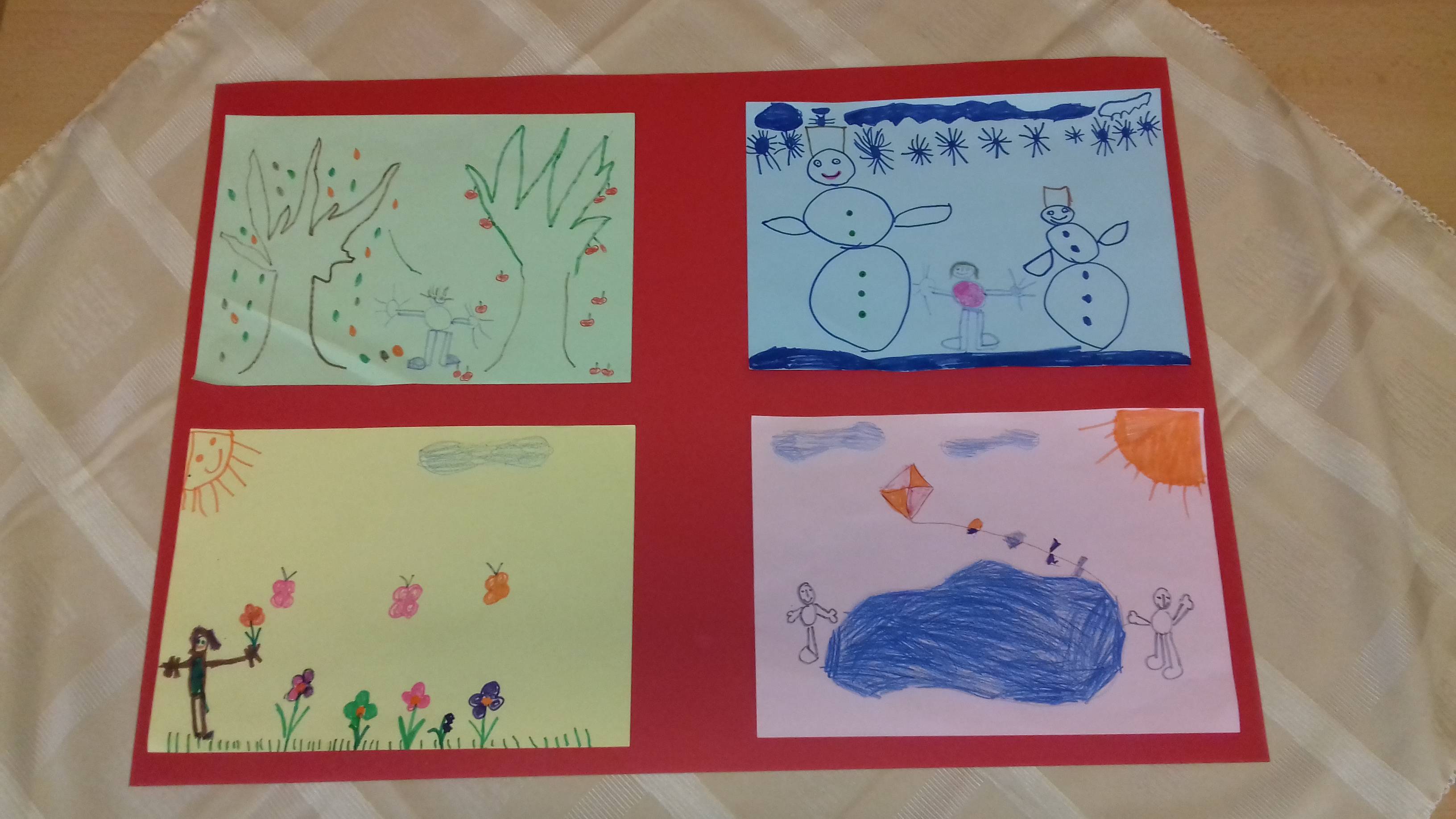 A gyermekek által rajzolt képek a négy évszakhoz kapcsolódó számukra fontos örömforrásokat jeleníti meg.