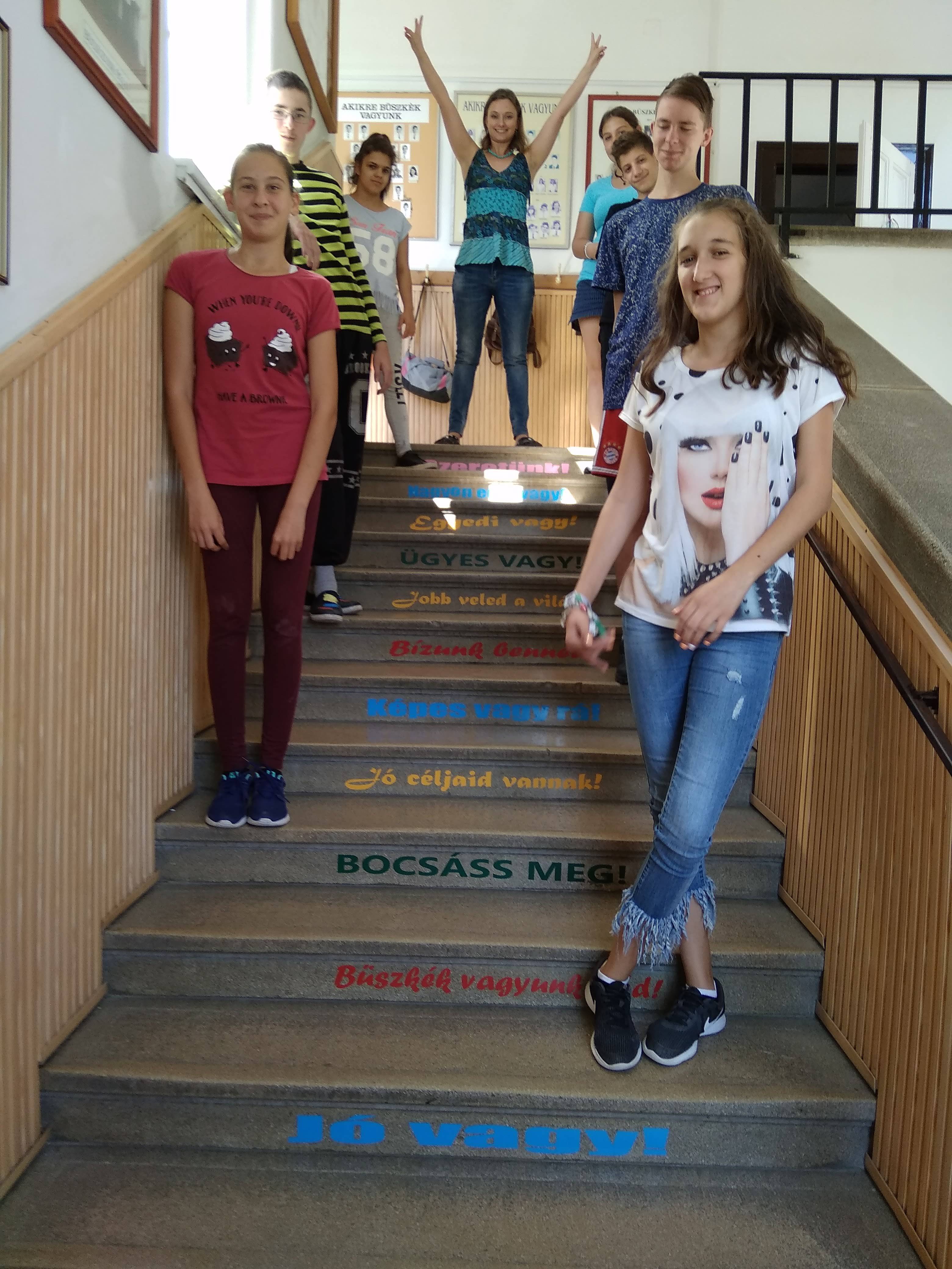 Szeretnénk megmutatni nektek az iskola új lépcsőjét! Boldogan futkározunk rajta, és örömmel olvasgatjuk naponta többször is pozitív mondatokat! Köszönjük!!