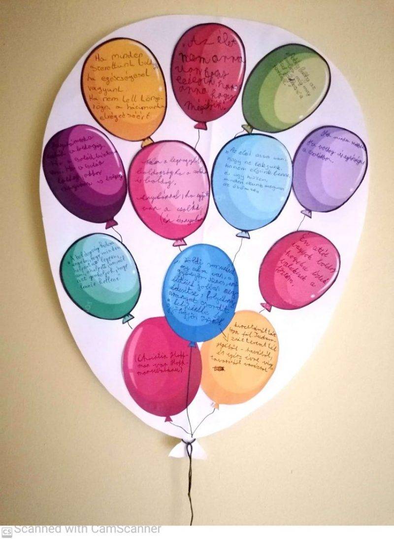 A fenntartható boldogság témakörben a gyerekek idézeteket vagy saját gondolataikat gyűjtötték össze. Ezeket egy lufiba helyeztük el, így ezzel is felfelé tart a boldogságunk.