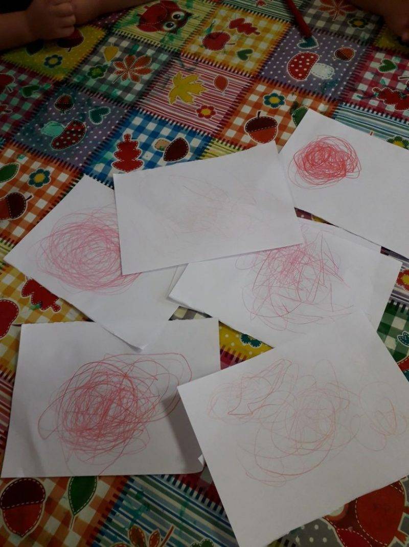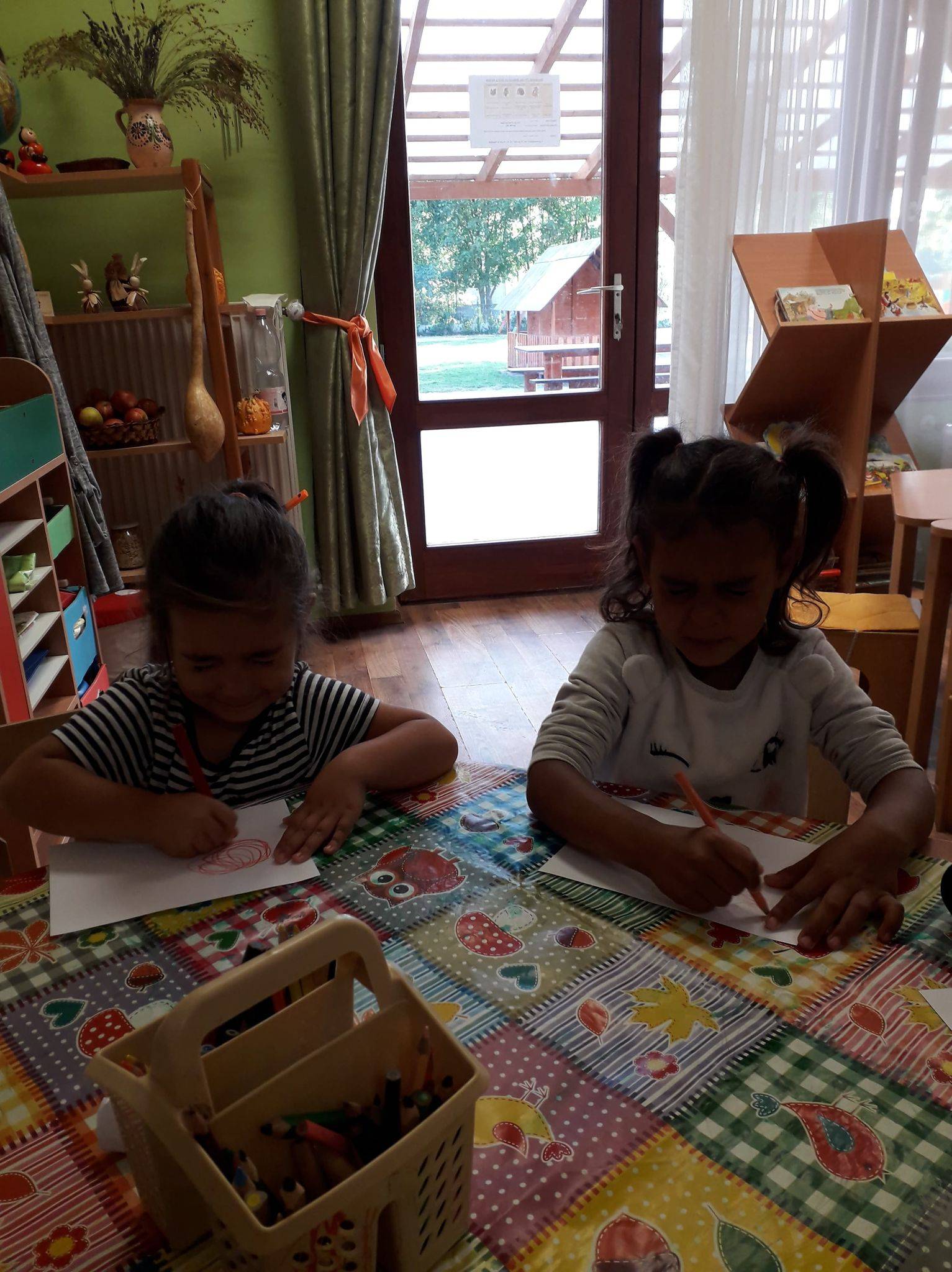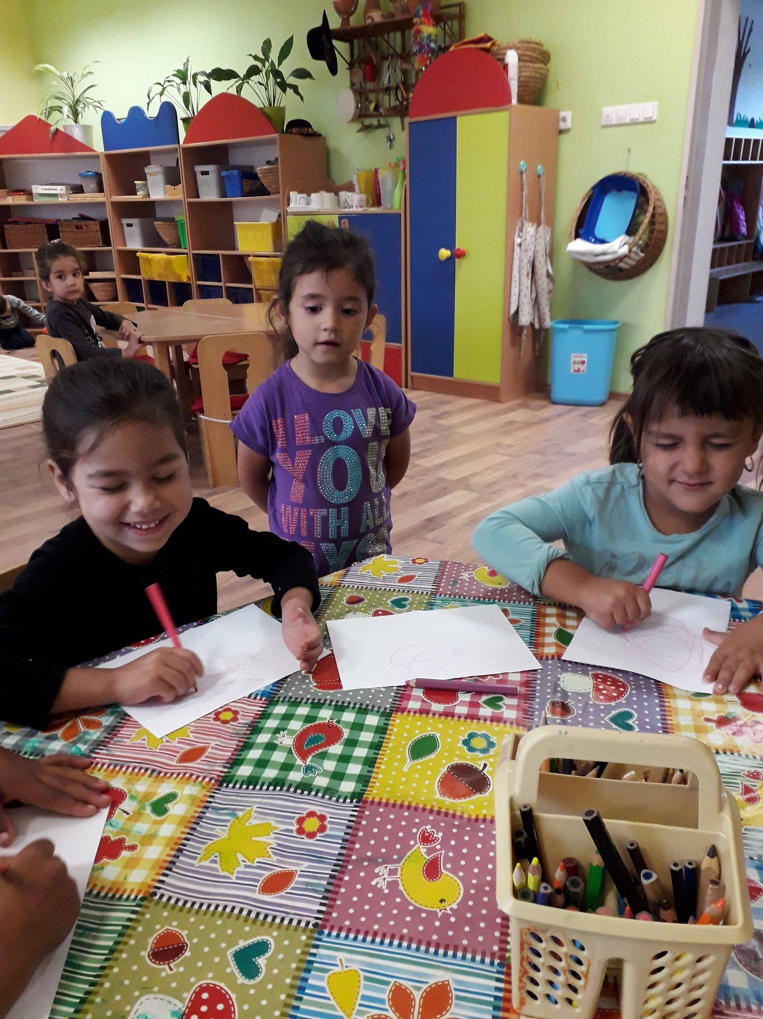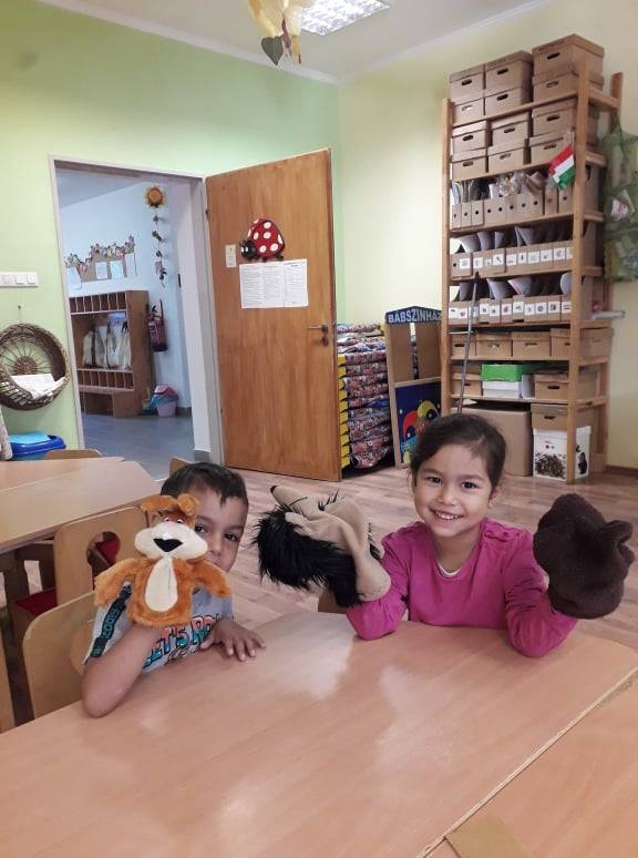 Boldogságóránk szeptemberi témája a hála volt. Kíváncsian vártam, hogy a gyerekek mennyire lesznek befogadóak ebben az új program nyújtotta lehetőségekben. Relaxációs gyakorlatnak a firkálásra esett a választásom. Könnyed, ugyanakkor mókás. Jól sejtettem, hogy szeretni fogják azt, hogy becsukott szemmel kell szabadon firkálgatniuk. Azt tapasztaltam, hogy első körben nehezebben engedik el magukat, ki-ki pislognak a feladatból, nézik, hogy a társuk valóban behunyt szemmel rajzol-e. De többszöri elvégzés során belejöttek és átengedték magukat a relaxációnak. A munkákból látható, hogy maradtak zömmel a papír közepén, nem „mertek” lazább mozgásokat csinálni. Ezt a relaxációs gyakorlatot máskor is beillesztem a mindennapokba és nagyobb papírt fogok biztosítani számukra, hogy érezzék, szabadabban tudnak firkálni. Szeretik a gyerekek a bábozást, így arra gondoltam, hogy a Maci bajban van, mesét választom feldolgozásnak. Először elmeséltem alvásidőben, majd másnap elbáboztam nekik. Természetesen ők is szerették volna a bábokat felvenni a kezükre, így amelyiket választották, azt meg is próbálták eljátszani. Egy felvételt készítettem, de a szerepek körbejártak a gyerekek között. Miután a mesén keresztül érthetővé vált számukra a hála jelentése, ők maguk is elmondták, hogy miért hálásak. Nagyon kedves dolgokat mondtak és megható volt végighallgatni. Pl.