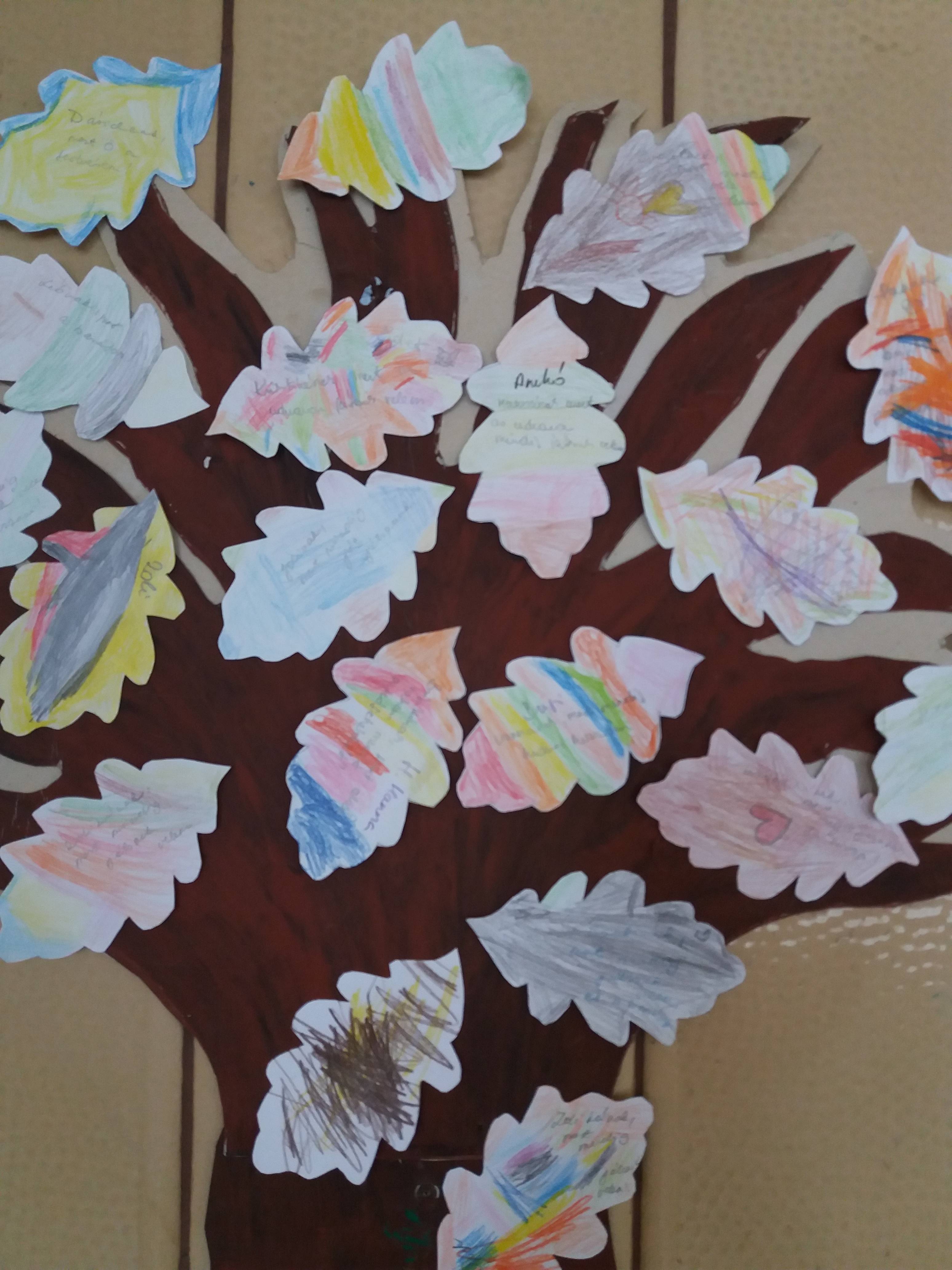 A Boldogságprogram szeptemberi témájának feldolgozását Ferenczei Éva bábjátékával indítottuk, melynek címe: “ Maci bajban van”. A mese előadása után beszélgettünk annak mondanivalójáról, a mese szereplőiről, azok tulajdonságairól. Ezután beszélgetőkörben megismerhettük, hogy mit is gondolnak a gyerekek a hála fogalmáról. Megtudhattuk, hogy a legtöbb esetben a gyerekek azért hálásak, ha valaki játszik velük. A nagyobbak már megfogalmazták, hogy a hála egyben köszönetet is jelent valamiért. A foglalkozás levezetéseként, zárásaként hála faleveleket szinezhettek a gyerekek, melynek elkészültekor átadták egymásnak, és elmondták, hogy kinek és miért hálásak Az elkészült falevelekből elkészítettük csoportunk “Hálafáját”, mely azóta is csoportunk falát díszíti.