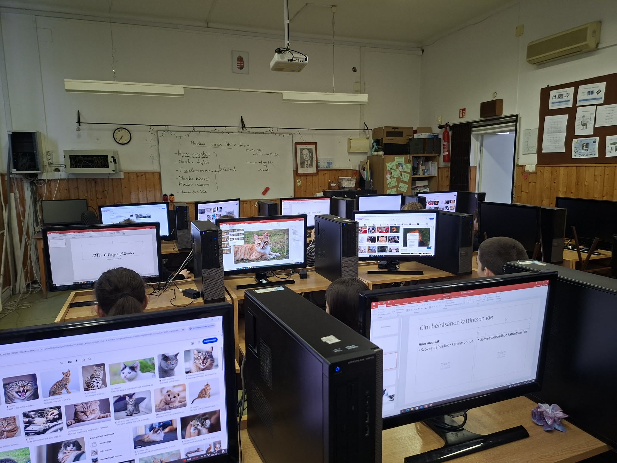 Digitális kultúra órán PowerPoint-bemutatók készültek macska témában. A szerkesztési nehézségek, technikai kihívások jó alkalmat teremtettek a problémaközpontú megküzdés gyakorlására: a tanulók megoldásokat kerestek, kipróbáltak, javítottak, egymástól tanultak. Kiemeltük, hogy a hibázás a tanulási folyamat természetes része.