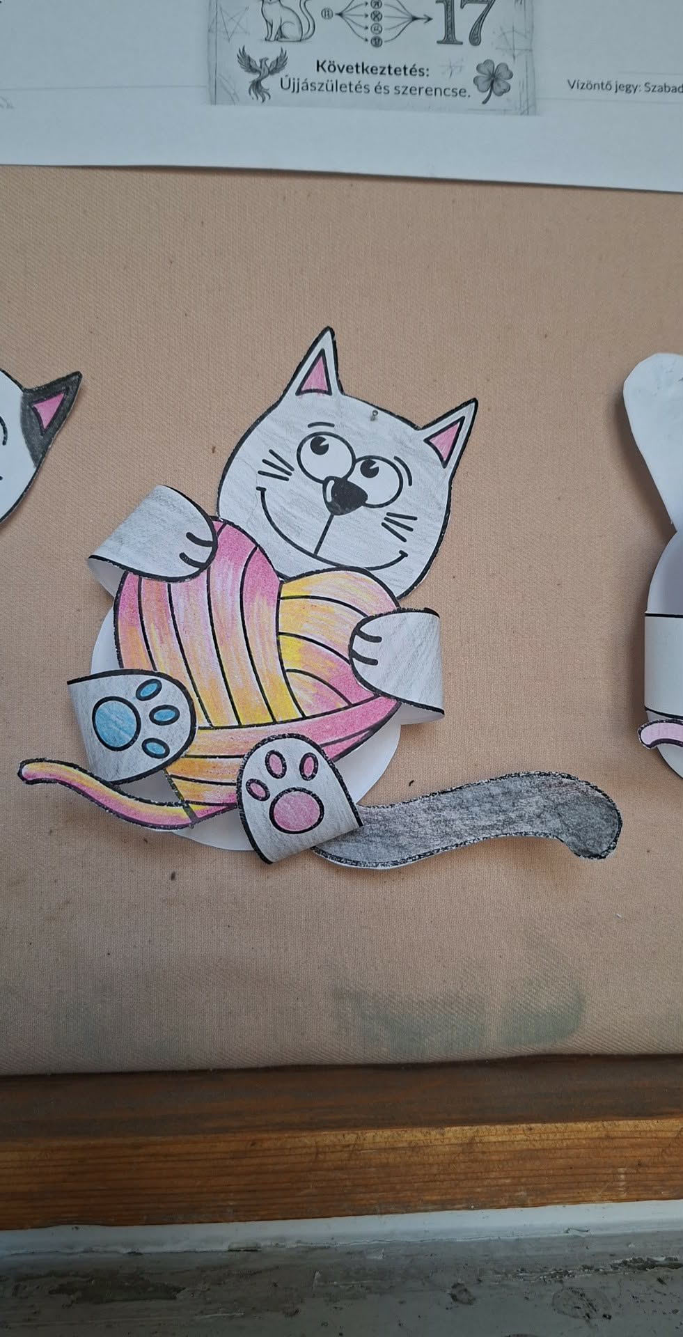 A technika órán papírból cicákat készítettünk. Az alkotómunka során a finommotorikus készségek fejlesztése mellett a türelem és a kitartás is hangsúlyt kapott.