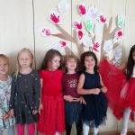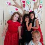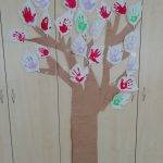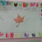 Első boldogságóránk egy nehezen megfogalmazható és érzékenyíthető témával: a hála gyakorlásával indult. A foglalkozást Bagdi Emőke: Lemegy a nap, lankad a kar… relaxációs gyakorlatával kezdtük, majd körben ülve a szőnyegen egy „Vándorjáték” c. drámajátékkal folytattuk, mely során körbe járt először egy képzeletbeli kisveréb, majd puszi, simogatás. A gyerekek teljesen átszellemültek ezektől a pozitív érzésektől. Ezután az „Azt szeretem benned” játék következett, mely során mindenki mondhatott társáról egy pozitív dolgot. Jó volt látnom a gyerekek örömtől mosolygó arcát, mikor valamelyiküktől dícséretet kaptak. A következőkben a Hálafa történetét meséltem el nekik, és beszélgetést kezdeményeztem a meséről, annak szereplőiről, érzéseikről. „Mi mi mindenért lehetünk hálásak?” -tettem fel ezt a kérdést és a gyerekek válaszoltak rá- sok érdekes és megható dolog napvilágra került. Később az asztalokhoz ülve mindenki készíthetett egy képeslapot szüleinek, melyre egy préselt levelet ragasztottak fel, kidíszítették a lapot és ráírtam „az üzenetet”, ki mit köszön szüleinek- ezt természetesen mindenki haza vitte, a csoportszoba papírfájára pedig falevél formára kézlenyomatokat készítettünk, erre is ráírtam, ki miért hálás, így lett egy saját hálafánk. A tevékenység lezárásaként Bagdi Bella: Jól érzem magam c. dalát hallgattuk meg és mozogtunk, táncoltunk rá együtt.