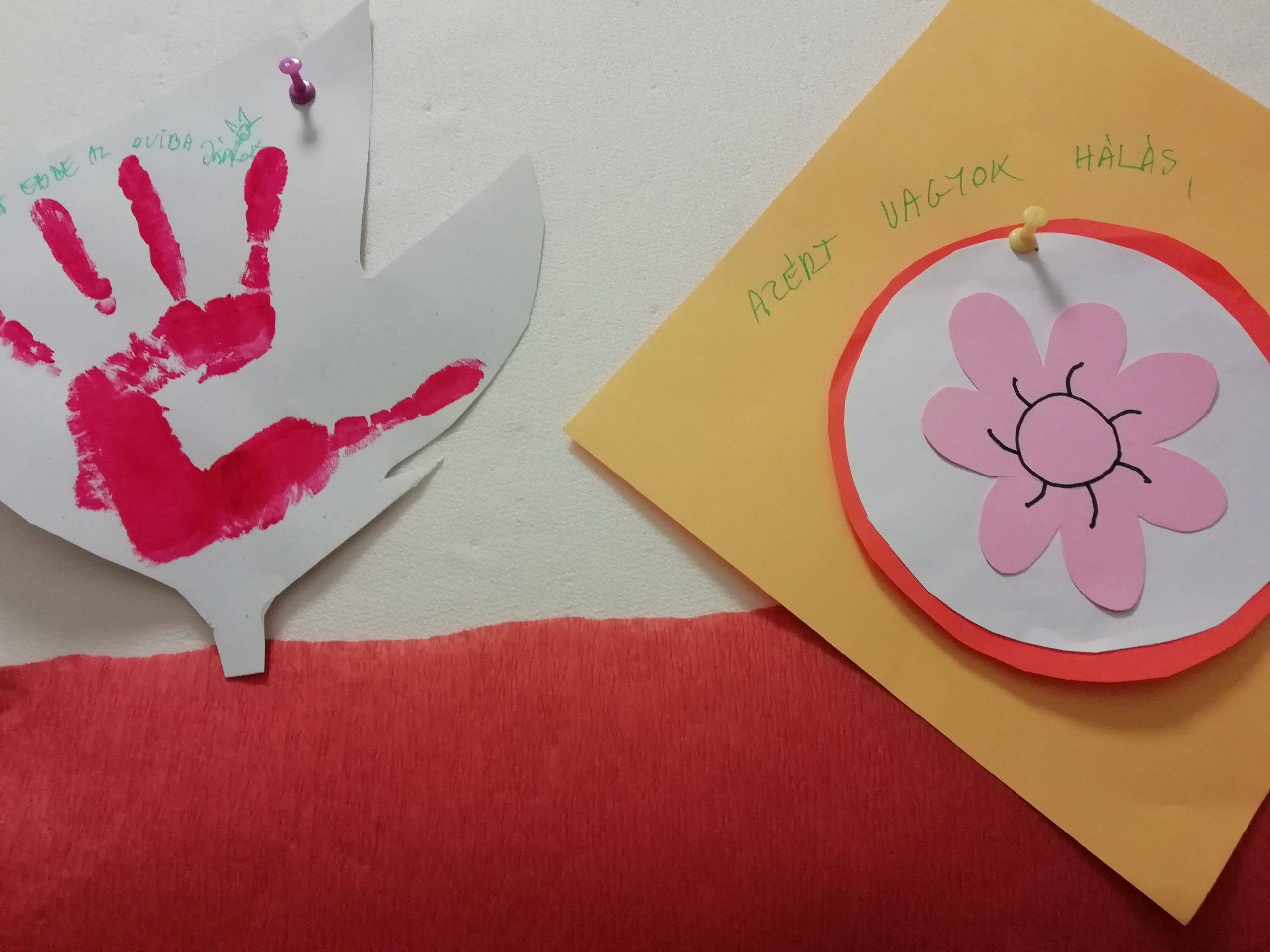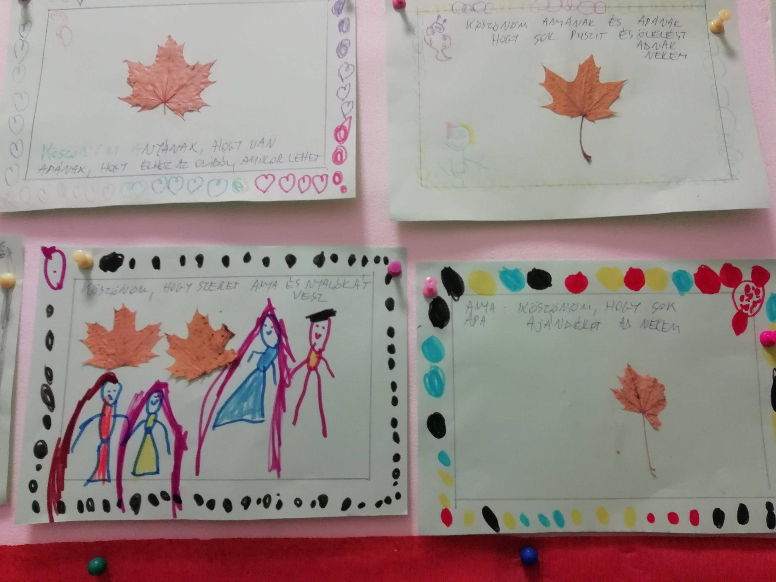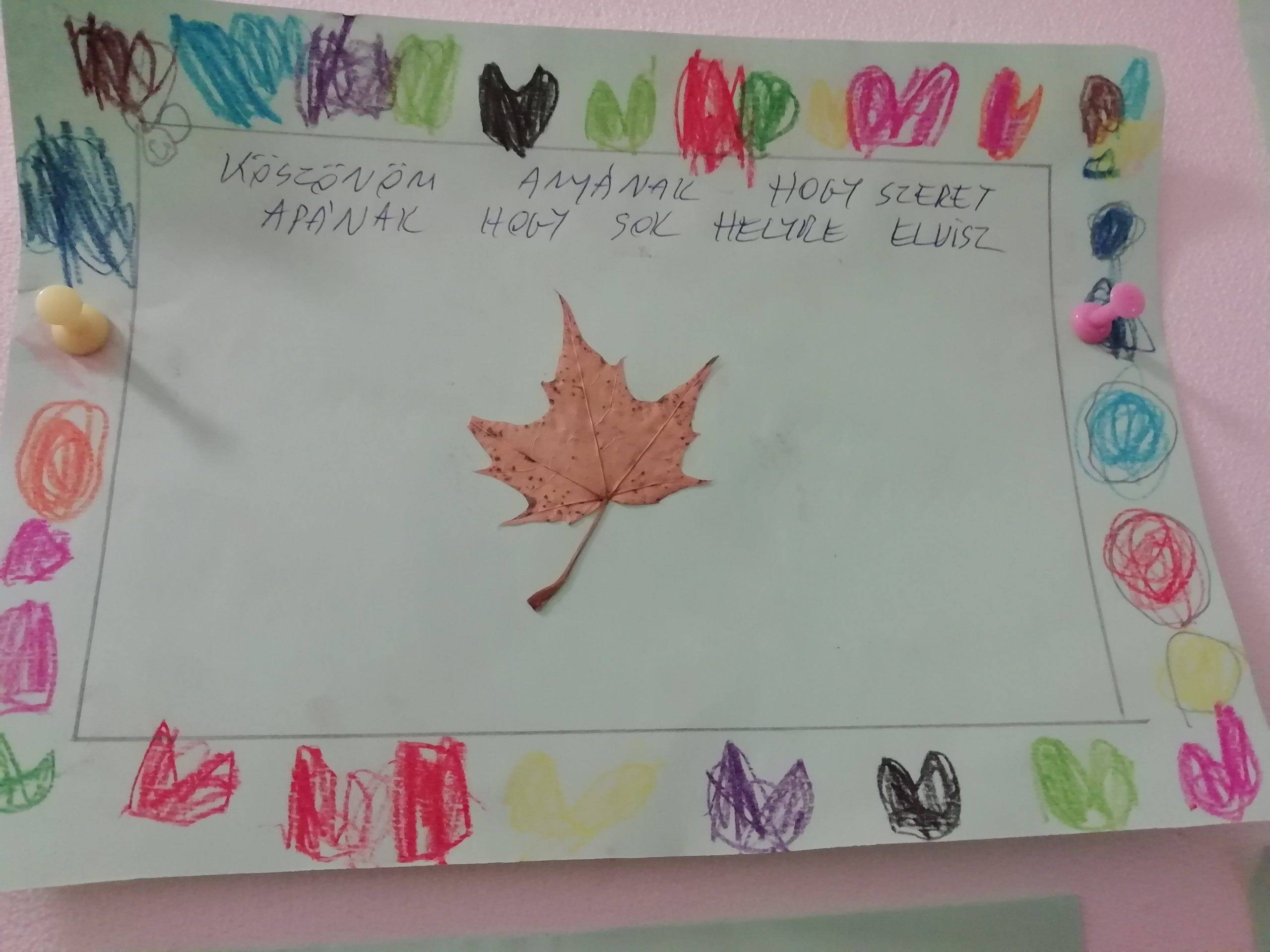 Első boldogságóránk egy nehezen megfogalmazható és érzékenyíthető témával: a hála gyakorlásával indult. A foglalkozást Bagdi Emőke: Lemegy a nap, lankad a kar… relaxációs gyakorlatával kezdtük, majd körben ülve a szőnyegen egy „Vándorjáték” c. drámajátékkal folytattuk, mely során körbe járt először egy képzeletbeli kisveréb, majd puszi, simogatás. A gyerekek teljesen átszellemültek ezektől a pozitív érzésektől. Ezután az „Azt szeretem benned” játék következett, mely során mindenki mondhatott társáról egy pozitív dolgot. Jó volt látnom a gyerekek örömtől mosolygó arcát, mikor valamelyiküktől dícséretet kaptak. A következőkben a Hálafa történetét meséltem el nekik, és beszélgetést kezdeményeztem a meséről, annak szereplőiről, érzéseikről. „Mi mi mindenért lehetünk hálásak?” -tettem fel ezt a kérdést és a gyerekek válaszoltak rá- sok érdekes és megható dolog napvilágra került. Később az asztalokhoz ülve mindenki készíthetett egy képeslapot szüleinek, melyre egy préselt levelet ragasztottak fel, kidíszítették a lapot és ráírtam „az üzenetet”, ki mit köszön szüleinek- ezt természetesen mindenki haza vitte, a csoportszoba papírfájára pedig falevél formára kézlenyomatokat készítettünk, erre is ráírtam, ki miért hálás, így lett egy saját hálafánk. A tevékenység lezárásaként Bagdi Bella: Jól érzem magam c. dalát hallgattuk meg és mozogtunk, táncoltunk rá együtt.