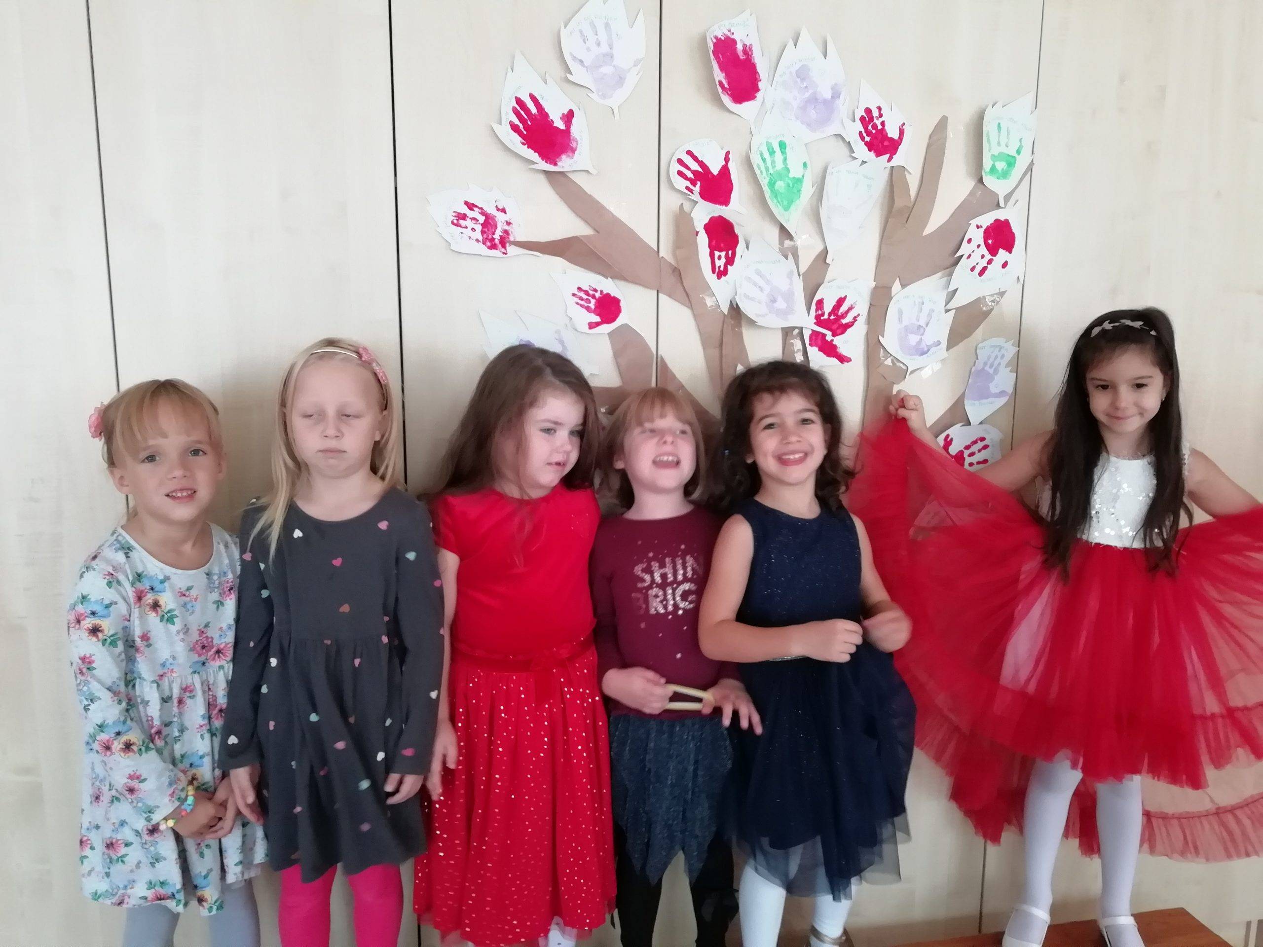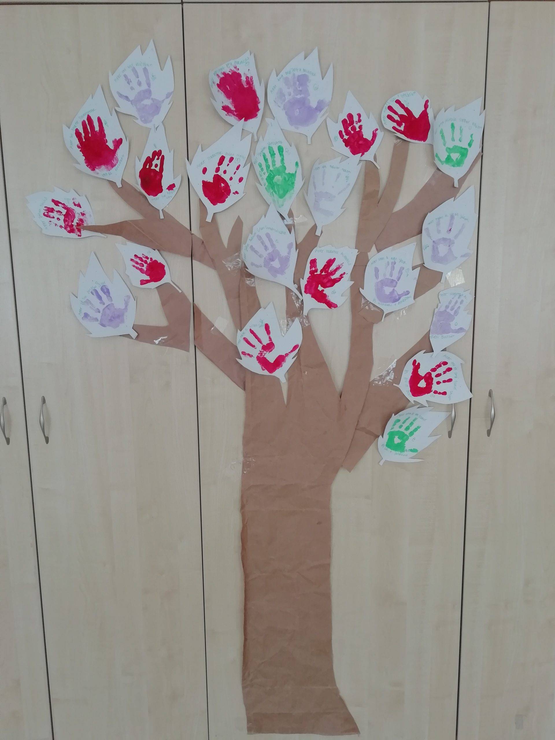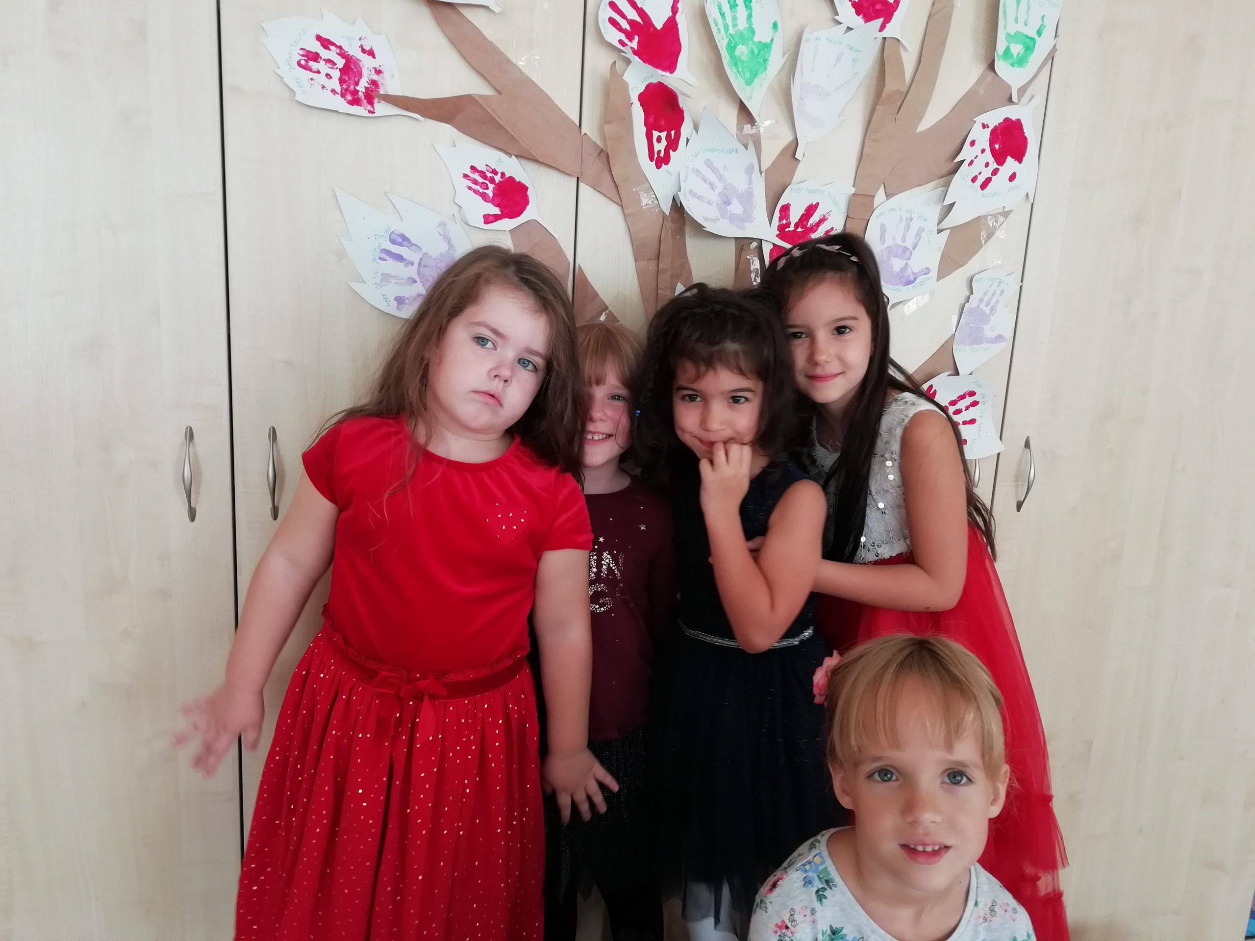 Első boldogságóránk egy nehezen megfogalmazható és érzékenyíthető témával: a hála gyakorlásával indult. A foglalkozást Bagdi Emőke: Lemegy a nap, lankad a kar… relaxációs gyakorlatával kezdtük, majd körben ülve a szőnyegen egy „Vándorjáték” c. drámajátékkal folytattuk, mely során körbe járt először egy képzeletbeli kisveréb, majd puszi, simogatás. A gyerekek teljesen átszellemültek ezektől a pozitív érzésektől. Ezután az „Azt szeretem benned” játék következett, mely során mindenki mondhatott társáról egy pozitív dolgot. Jó volt látnom a gyerekek örömtől mosolygó arcát, mikor valamelyiküktől dícséretet kaptak. A következőkben a Hálafa történetét meséltem el nekik, és beszélgetést kezdeményeztem a meséről, annak szereplőiről, érzéseikről. „Mi mi mindenért lehetünk hálásak?” -tettem fel ezt a kérdést és a gyerekek válaszoltak rá- sok érdekes és megható dolog napvilágra került. Később az asztalokhoz ülve mindenki készíthetett egy képeslapot szüleinek, melyre egy préselt levelet ragasztottak fel, kidíszítették a lapot és ráírtam „az üzenetet”, ki mit köszön szüleinek- ezt természetesen mindenki haza vitte, a csoportszoba papírfájára pedig falevél formára kézlenyomatokat készítettünk, erre is ráírtam, ki miért hálás, így lett egy saját hálafánk. A tevékenység lezárásaként Bagdi Bella: Jól érzem magam c. dalát hallgattuk meg és mozogtunk, táncoltunk rá együtt.