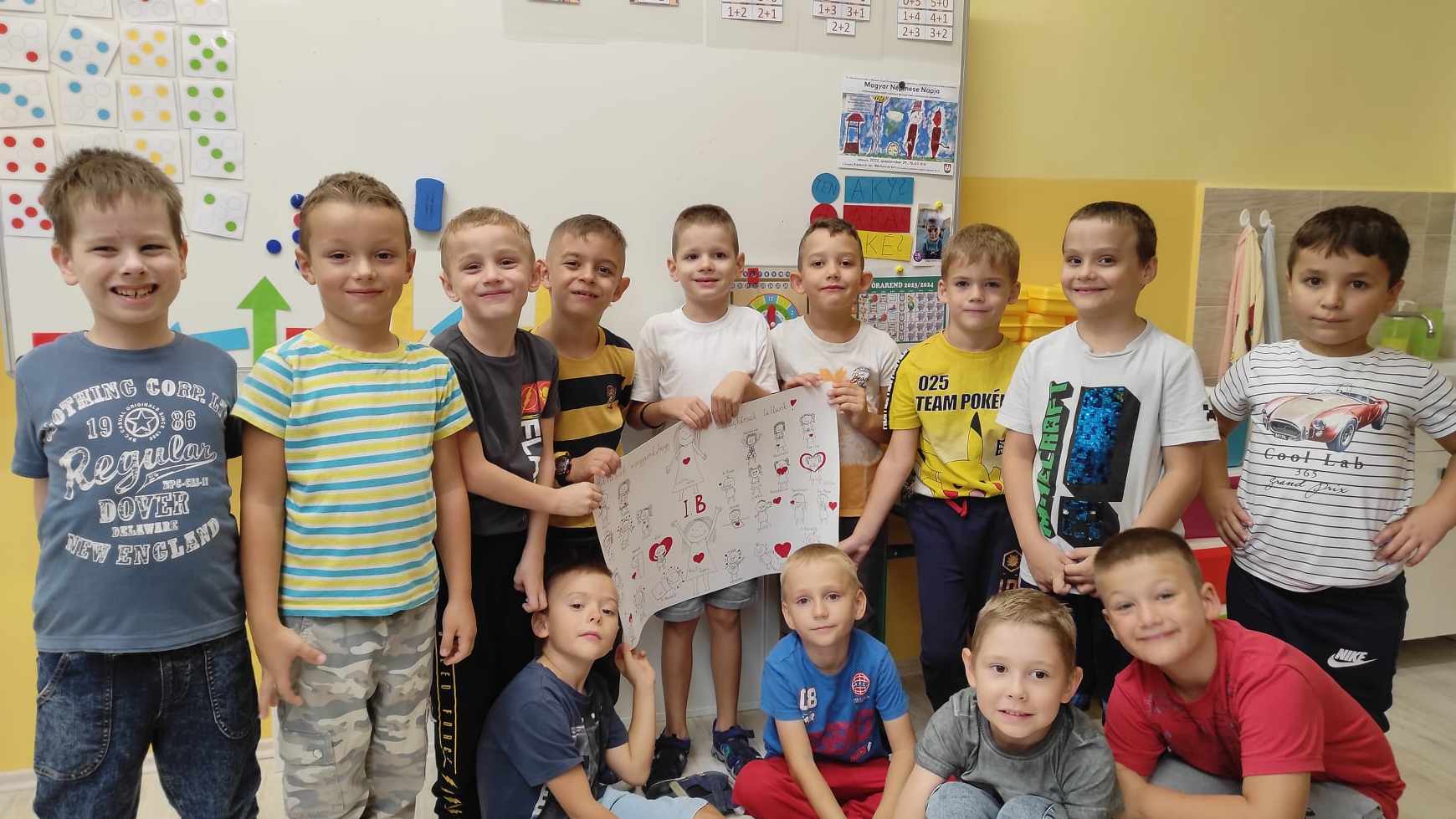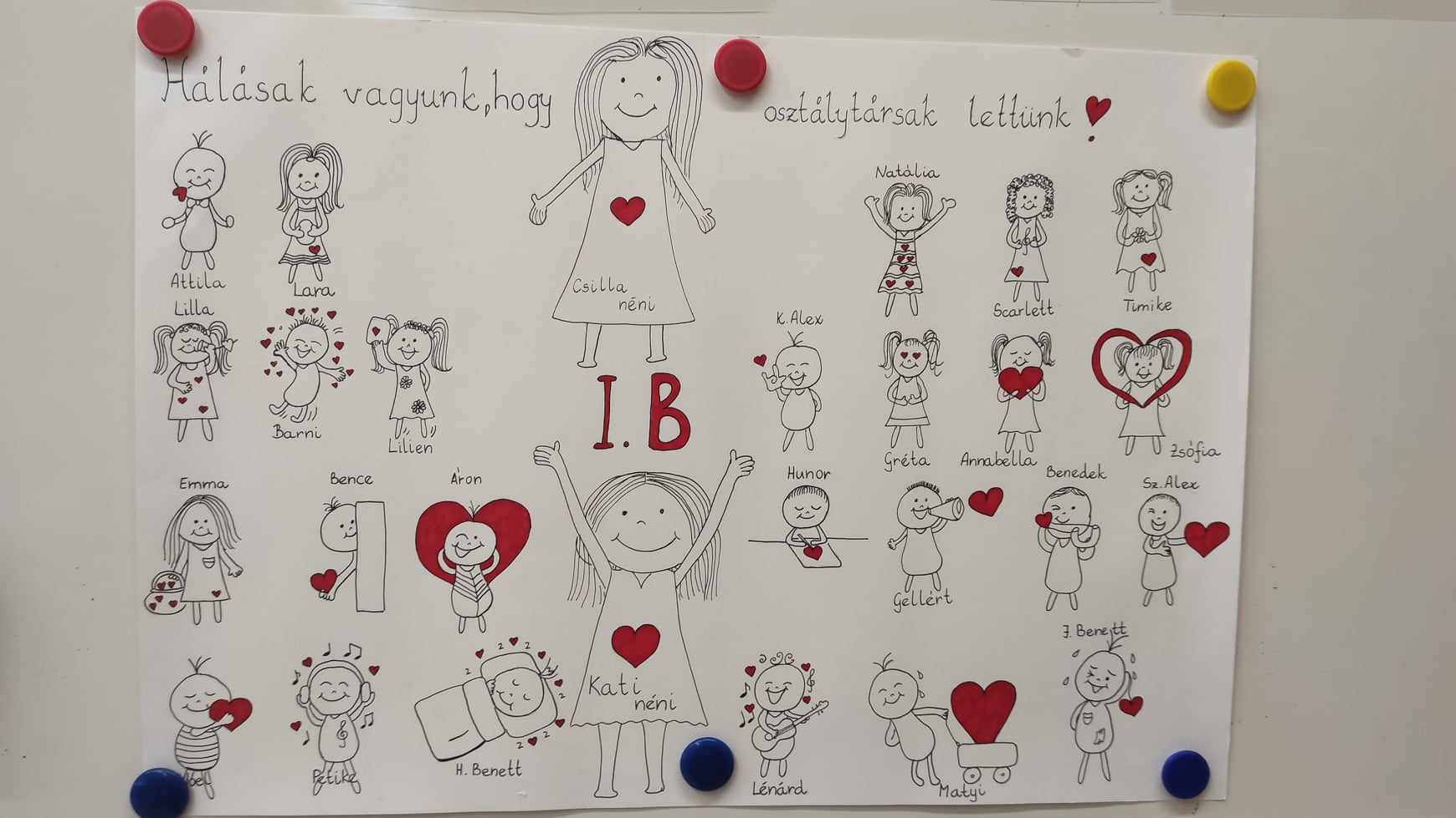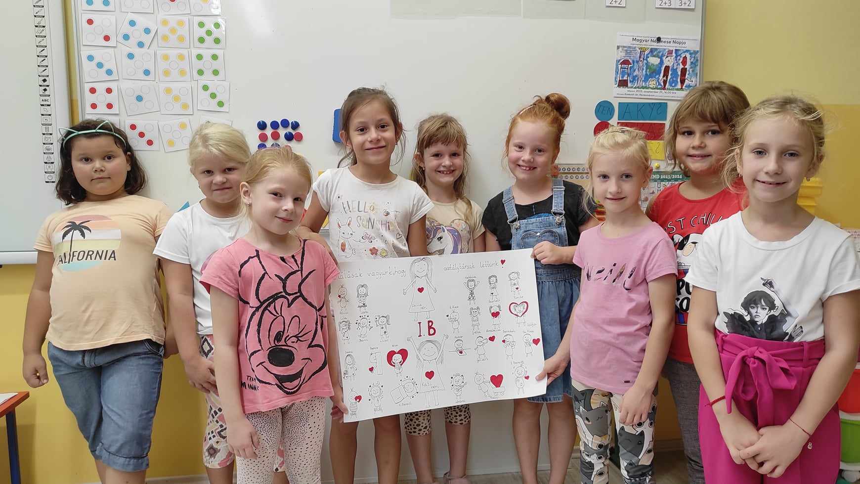 Hogy mit is jelent egy kis elsős gyerkőc számára a HÁLA kifejezés, érzés?! Elsőre nehéz diónak tűnt megfogalmazni. Az 1. B osztály 25 tanulója csupán 3 hete jár iskolába. Rengeteg új dolog, inger, tanító néni, osztálytárs toppant be az életükbe. A kölcsönös ismerkedés fázisában vagyunk, de az már most látszik, hogy egy nagyon jó kis csapat formálódik össze, amiért mindannyian HÁLÁsak vagyunk. Gyerekek, szülők, és nem utolsó sorban én, Kati néni, mint osztályfőnök, és Csilla néni, mint nevelő néni. HÁLÁsak vagyunk, hogy kalandos, izgalmas 4 év vár ránk együtt. HÁLÁsak vagyunk, hogy a szülők ránk bízták legnagyobb kincseiket és minket választottak. A gyerkőcök HÁLÁsak minden kedves biztató szóért, bátorító mosolyért. Már nagy várták, hogy iskolások legyenek, új barátokat szerezzenek. HÁLÁsak vagyunk a szülők segítő támogatásáért és a hatékony együttműködésért. Közösen megrajzoltuk osztályunk CSUPASZÍV tablóját, mellyel megkezdtünk egy új fejezetet a kis elsősök életében.