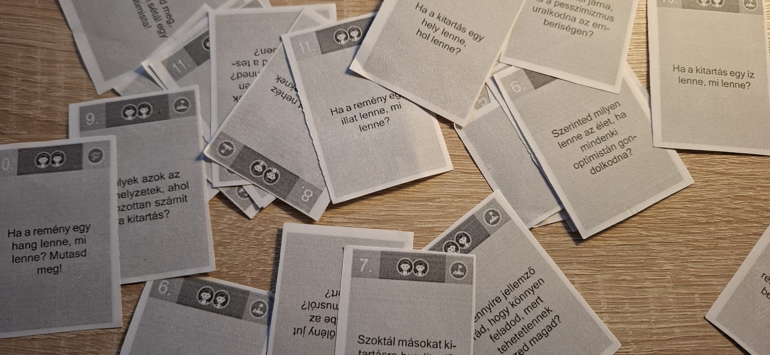 Az optimizmus hónapjában a boldogságórán mindenki húzhatott a kérdéskártyákból. Először a kártya tulajdonosa válaszolt, de hozzá lehetett szólni, így egy jó kis beszélgetés alakult ki. Ezután megkértem mindenkit, hogy írjon egy rövid élethelyzetet, történést, ami kilátástalannak, negatívnak tűnhet. Minden ilyen kis történetet megpróbáltunk optimista szemüveggel szemlélni, értékelni.