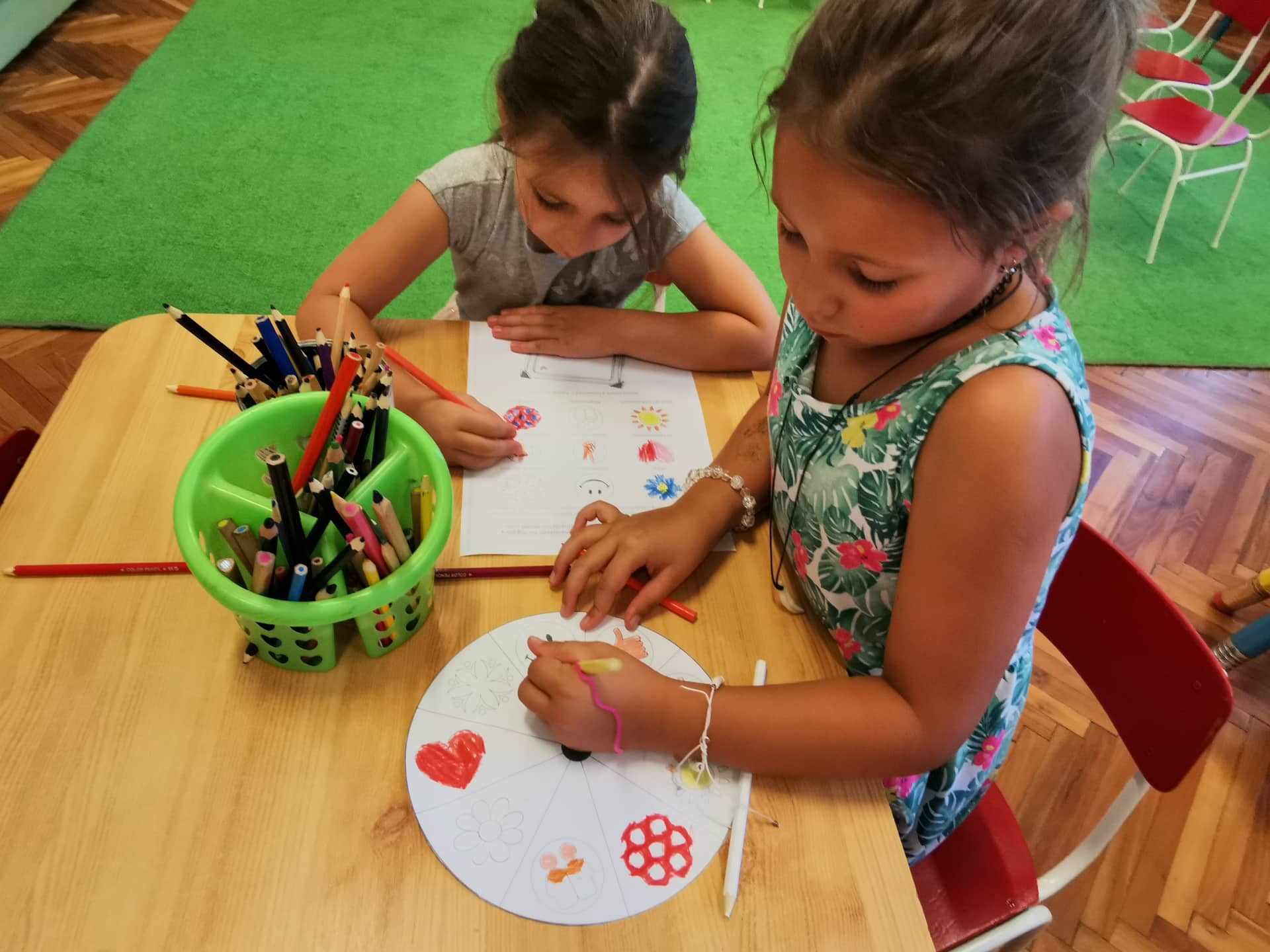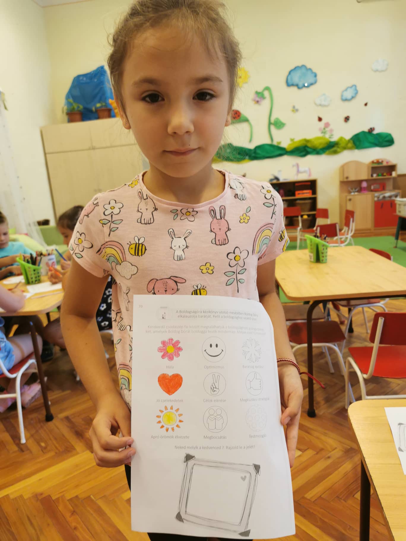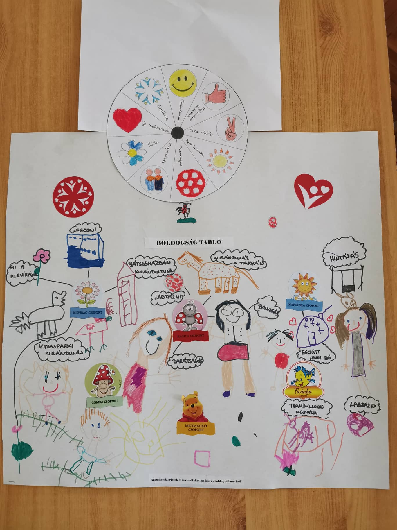 A Kisvirág csoport örült, hogy együtt játszhattunk, többen a bújócskát emelték ki. Egy kislány az érzelem kártyákról mesélt, amit Ildikó néni hozott hozzájuk játszani. Felidéztük a korábbi együtt töltött boldogságóra tartalmát is: amikor decemberben a boldogító jócselekedetek témahónapjában együtt gyakoroltuk a jószívűséget. Jó érzés volt visszagondolni, hogy ezért a munkánkért elnyertük a hónap csoportja elismerést is. Az oklevelet körbeadtuk. Az asztalnál a gyerekek választhattak a hónap témájához ajánlott színezőket. Végül játékidőben közösen készítettünk egy boldogságtablót, amire rárajzolták kedvenc élményeiket, emlékeiket. Felkerültek a kirándulások, a ballagás, kinti nyári játékok. Feliratoztuk, hogy majd a szülők is eligazodjanak rajta, illetve bővíthessék. A többi csoportot is bevontuk és kértük rajzoljanak ők is a tablóra, szívesen kapcsolódtak be. Az udvaron megépítettük az óvodánk boldogság várát homokból, közepére elhelyeztük a csoportok jelképeit, a boldogóvoda logót. Sokan a csodájára jártak, a szülők is megköszönték az egész éves különfoglalkozásokat, örömmel hallgatták a gyerekek élménybeszámolóit, szívesen olvasták a képes beszámolókat. Jó szívvel búcsúztunk egymástól. A jövő évben is folytatjuk óvodánkban a boldogságóra foglalkozásokat a Micimackó, a Gomba és a Napocska csoportokban.