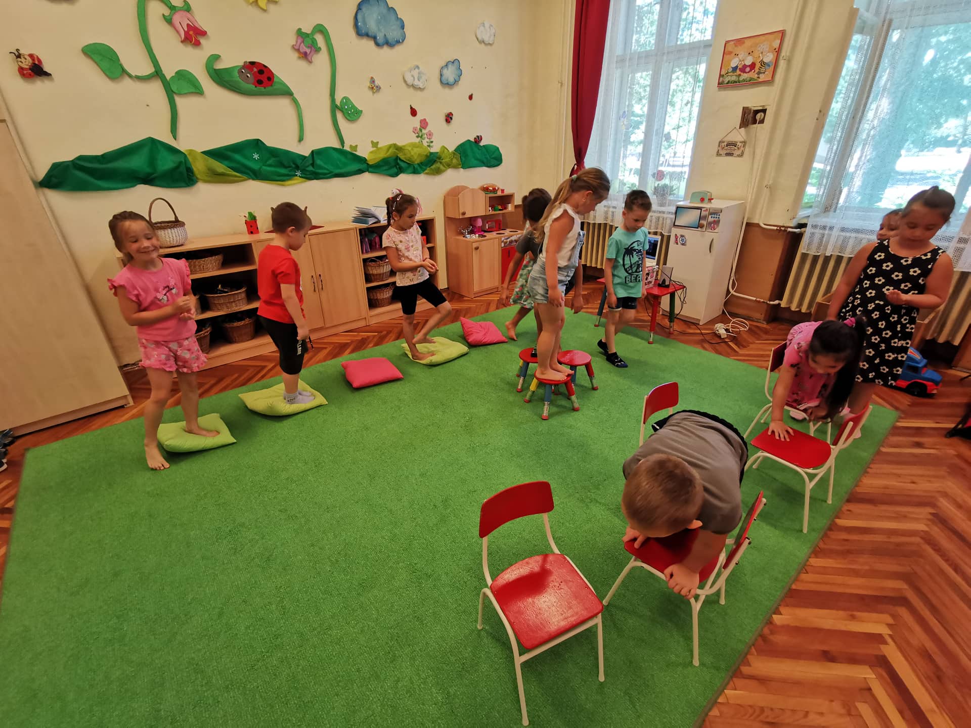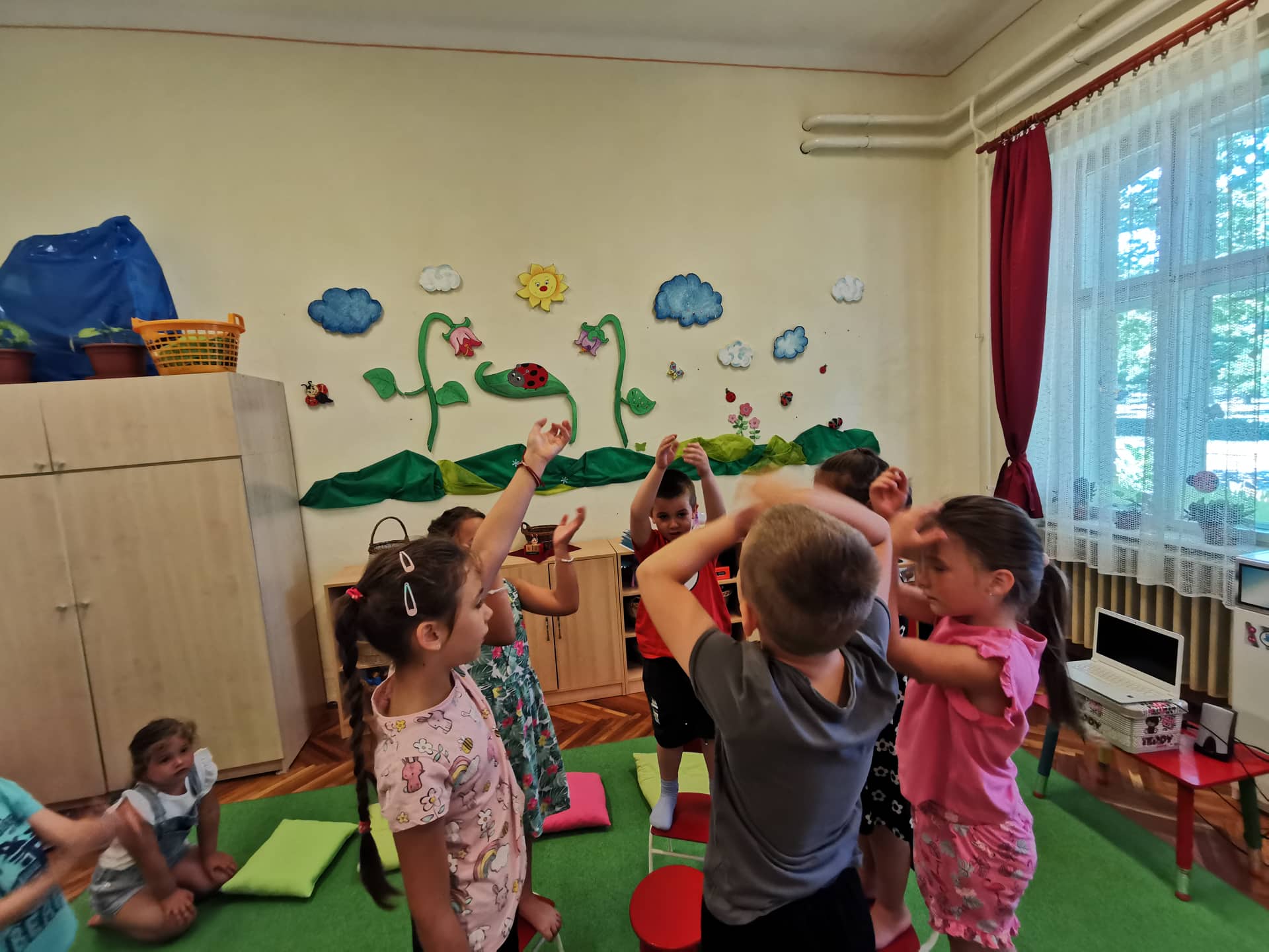 Az utolsó boldogságóra foglalkozást a lecsökkent létszám miatt, összevonva tartottuk a Kisvirág csoporttal. Könnyen összeszoktunk, hiszen a gyerekek jól ismerik egymást és a ballagásra is együtt készültünk. A fenntartható boldogság téma feldolgozását néhány közös relaxációs gyakorlat kipróbálásával kezdtük: A katicák bemutatták a kedvenc technikájukat a „Tüdőtakarítást”, ami a Kisvirágoknak is egyből megtetszett. Ezután a „Dagasztást” játszottuk el, a feszültségek levezetésére. A „Hintaszék” módszer segített az ellazulásban, a megpihenésben. Nyugodt körülmények között elsőként az ajánlott mesét: Az aranytulipánt, diafilmen megtekintették a gyerekek, méghozzá laptopról, a Virtuális Diamúzeum honlapján van erre lehetőség. Érdekesnek találták a képi világot, és csendben figyelték. Elővettük a mesetarisznyát, belepakoltuk a képzeletbeli kellékeket, a csoportszoba szőnyegére pedig kialakítottunk egy erdőt, akadályokkal. Mindenki a királyfi bőrébe bújt, s így indultunk útnak megkeresni a világ legszebb leányát. Az utunk során a javasolt mondókákkal, énekekkel színesítve haladtunk. Mindig kedvelt tevékenységük, ha akadálypályát építünk, és többször is végigmehetnek. Most is így tettünk, lassabb gyorsabb tempóban lehetett végigmenni, mindig új feladatokkal: ugrással, mászással, akadálykerüléssel. Egymás között megbeszélték, hogy ki vezesse a többieket, így mindig más ment elől. Útközben elraktuk a tarisznyánkba a pikkelyt, a holló tollat, az ősz hajszálat. Amikor el kellett bújni, akkor előhívtuk őket segítségül. A gyerekek elbújtak, és én mint királylány indultam megkeresésükre. Az izgalmasabb játék érdekében csukott szemmel elszámoltam húszig, addig elrejtőzhettek. Gyermeki módon várták, hogy megtaláljam őket, még ha látható helyen is voltak. Amikor újra játszottuk már a kislányok közül választottunk királylányt, és két segítőt is hozzá: egy hollót és egy halacskát. Ők éberen figyelhettek, amíg a királylány csukott szemmel számol, és szükség esetén súghattak a királylánynak. Szélesítettük a búvóhely keresési lehetőségeket is: nemcsak a csoportszobába, de a folyóson, a másik csoportba is elbújhattak – itt segítettek a jelen lévő óvó nénik.