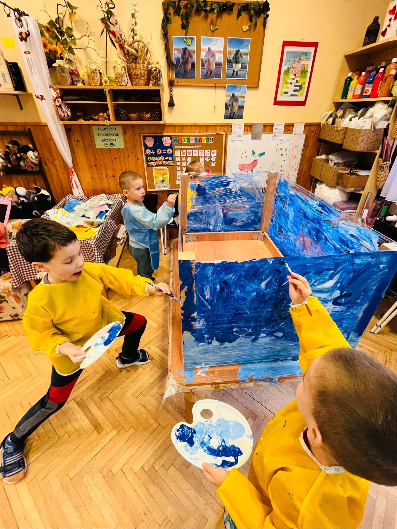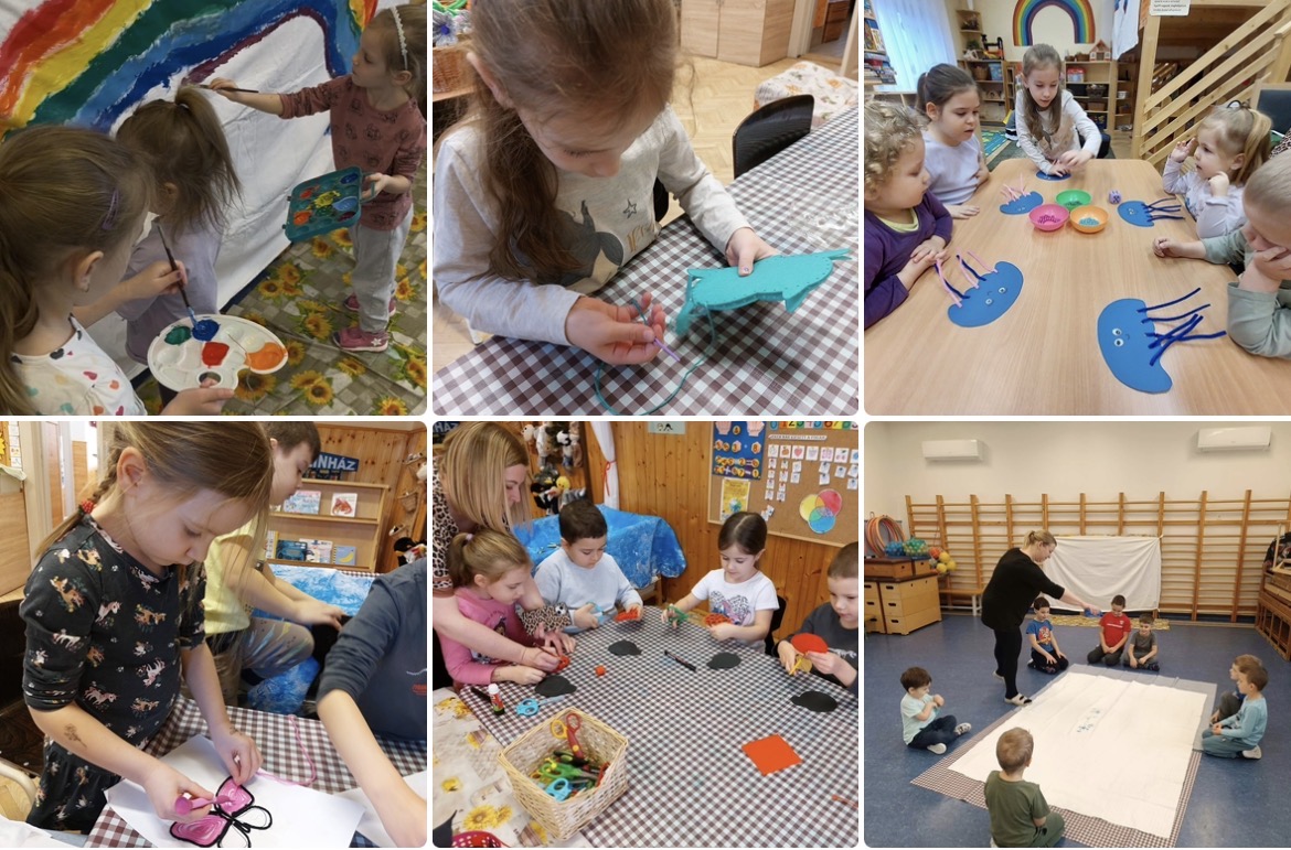 Kolléganőmmel egy egyhónapos projektet indítottunk „Kis kezek, nagy alkotások” címmel. A programsorozat célja az volt, hogy a gyermekek különböző manuális és kreatív tevékenységeken keresztül megtapasztalják a próbálkozás, az erőfeszítés és a siker örömét. Számos új és összetett feladat várt rájuk: Adél néni megismertette őket a varrás alapjaival, fonallal is dolgoztak, én pedig lehetőséget biztosítottam nagy felületen történő festésre, valamint a színekkel kísérleteztünk, ollóval vágtunk különböző anyagokat. Ezek a tevékenységek erősítették a kis Napraforgók türelmét, feladattudatát és problémamegoldó gondolkodását. A kezdeti bizonytalanságot fokozatosan felváltotta a sikerélmény, amely szemmel láthatóan növelte önbizalmukat.