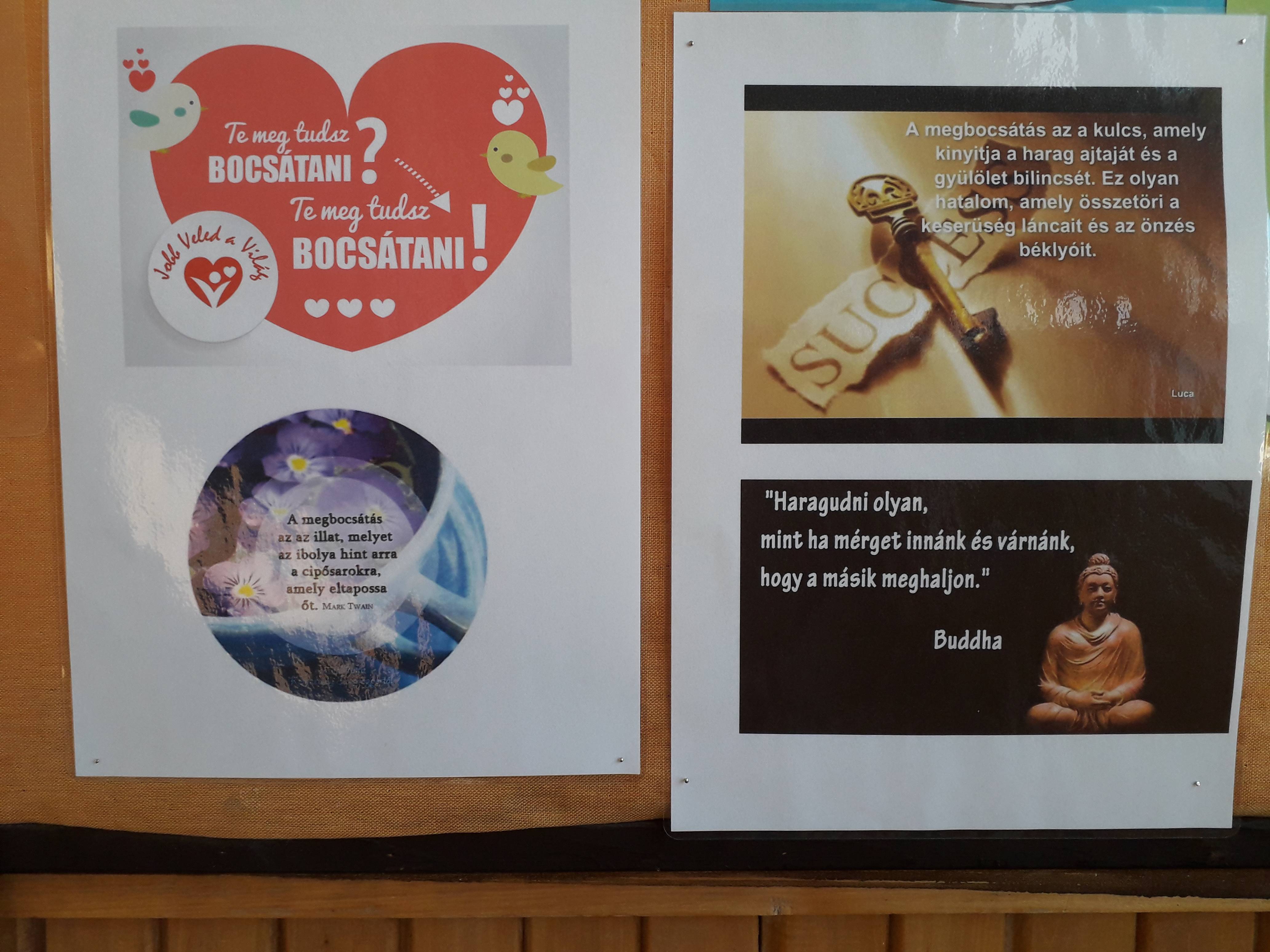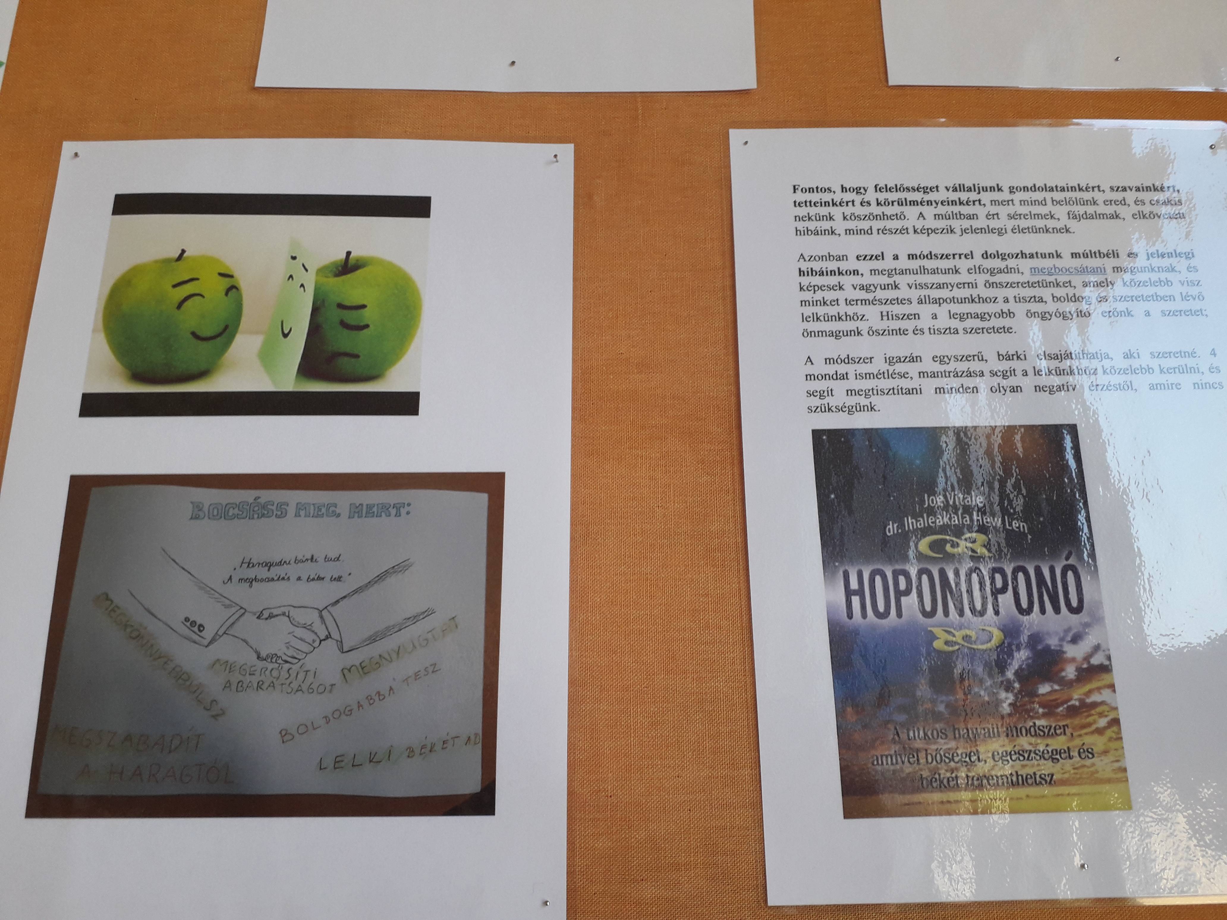 Ebben a hónapban is énekeltük az aktuális dalt: a Hoponoponot és beszélgettünk a megbocsátás fontosságáról, konkrét személyes példák alapján. Értelmeztük a „A megbocsátás jele” című történetet, néztünk videót és írtunk bocsánatkérő levelet. A faliújságunkat a mellékelt anyaggal gazdagítottuk.