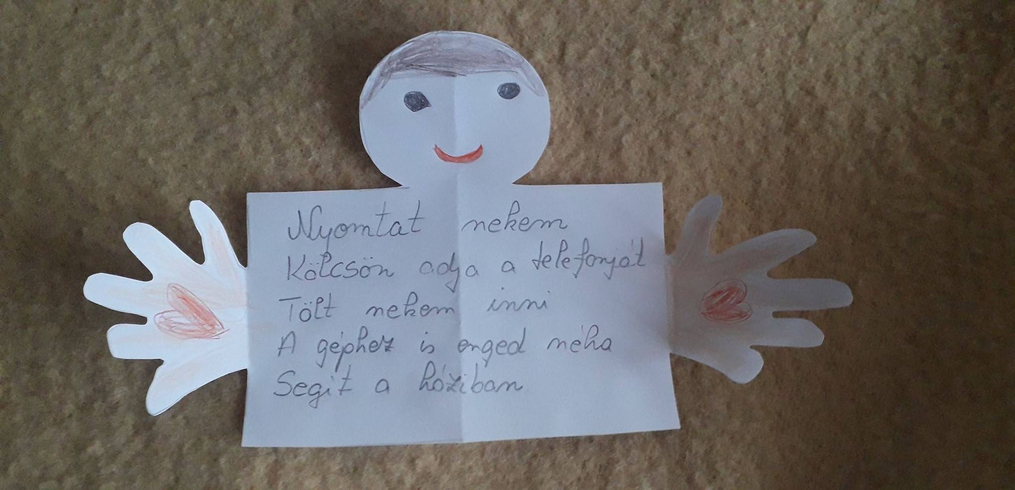 – Kis előkészítős tanítványaim tetszését az Átkarolom feladat ragadta meg leginkább. Többen elkészítették az általuk megbántott személy részére a sok jó tulajdonságra fókuszáló kis átölelő figurát. Ezt látván a szülőknek, nagyszülőknek, testvérnek meglágyult a szíve, de a kis bocsánatkérő is jóleső érzésekkel ölelte át őket.