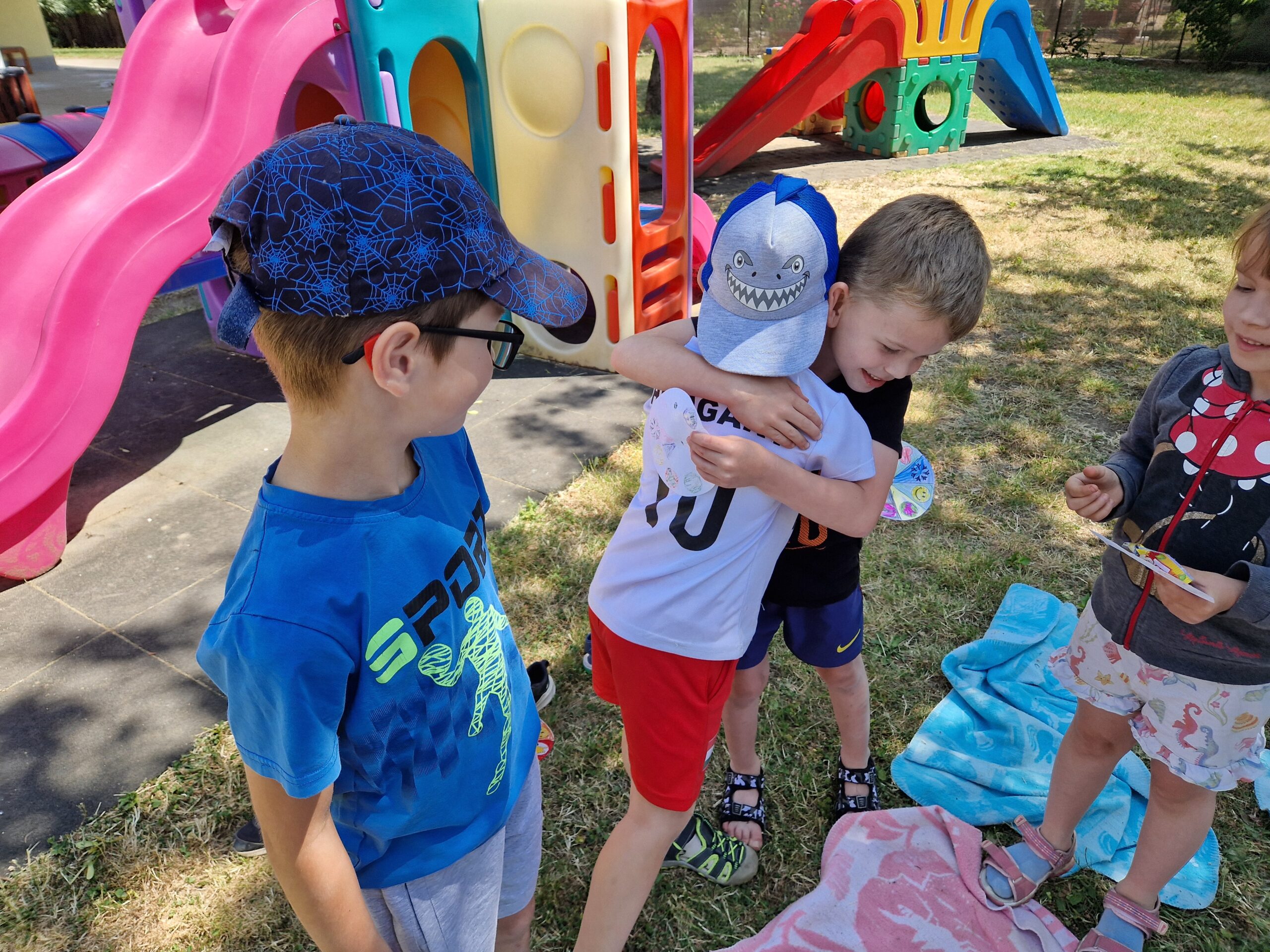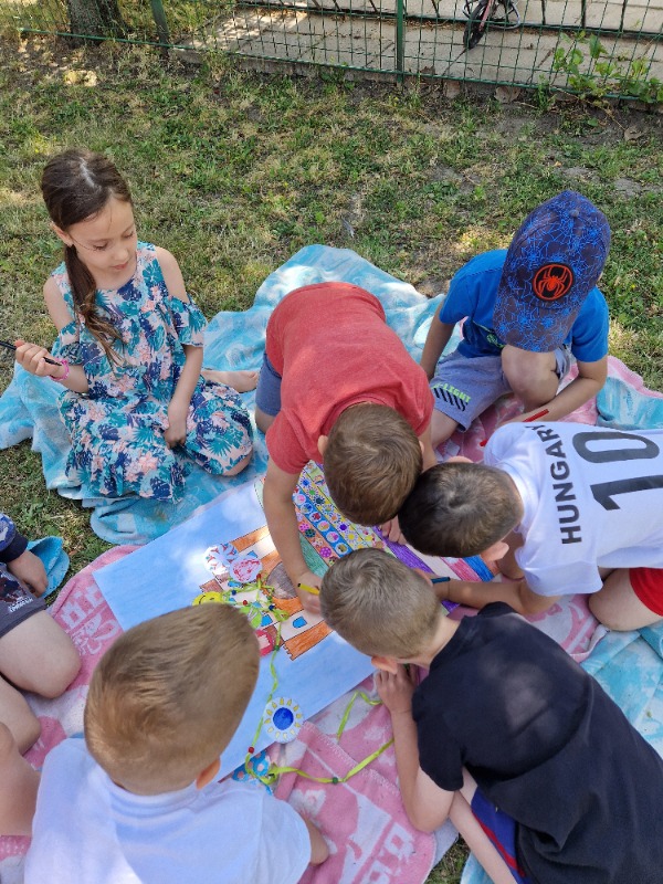 Az utolsó Boldogságóránkat a jó időre való tekintettel kint töltöttük el az udvaron. Picit másabb volt ez, mint a többi. Felidéztük mi minden volt jó a Boldogságórákon, meghallgattuk a kedvenc dalainkat, táncoltunk rájuk. Kis meglepetés piknikezés is volt a végére és mi mással zárulhatott volna, mint egy öleléslánccal.