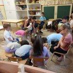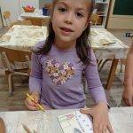 A foglalkozást a Jobb veled a világ című dallal kezdeményeztem, amit kétszer is meghallgattunk. A relaxációs gyakorlat (Totyog a liba, nagy a galiba…) után megérkezett hozzájuk Boldog Dóra. Beszélgetett a gyerekekkel, hogy ő mitől boldog, milyen témákkal foglalkoztunk a Boldogságórákon. A gyerekek sok mindenre emlékeztek („meséket mondtál nekünk”, „Lusta király meséje”, „sportok, mozgásról is beszélgettünk, és bemutattuk a kedvenc sportunkat is”, „mindig felragasztottuk a jelünket a lépcsőre”, „arról is szó volt, hogy hogyan tudunk segíteni és boldoggá tenni a másikat”, „és bocsánatot kérni”). Néhány dolgot nehezen tudták megfogalmazni, nekik rávezetéssel segítettem (hála, kapcsolatok, stb.). Majd a szeretetfolyosón végigmentek a gyerekek. Mindenkinek súgtak valami kedveset. Mivel már iskolába fog menni a csoport, így nem volt nehéz feladat számukra, jól ismerik már egymást, jól összekovácsolódott a csoport. A mese elmesélését (Boldog erdő – Kerekerdő c. mese) interaktív módon valósítottam meg, bevontam őket, apró gesztusokkal, mozdulatokkal fejlesztettem a képzeletüket, tartottam fenn a figyelmüket. Öröm volt látni, hogy teljes mértékig azonosultak a mese szereplőkkel, együtt jártuk be a Kerekerdőt, vették fel a gyöngyöket, adták egymásnak, stb. Majd a mese végén a témáknak a szimbólumait bemutattam, és megbeszéltük, kinek melyik volt a kedvence, ezután lehetőségük volt kiszínezni ezeket. A seprűtánc alkalmas volt a jókedv fenntartására, a gyermekek mozgásának kielégítésére, amely közben jókat nevetgéltek, élvezték a játékot. Aztán leültünk az asztalhoz, és mindenki lerajzolta, hogy a boldogságvárban mi van benn, mit látnak, mit képzelnek el. Sok szép és kreatív rajz készült („Boldog Dóra és Lívia néni vannak a várban”, „Egy korona”, „Csillogó gyémántok”, stb.). A foglalkozás végén „hoztam nekik egy szeretetzsákot”, amiben képzeletbeli „jó dolgok” vannak, pl. ölelés, ezt kellett körbeadni (öleléslánc). Ezután mindenki felragasztotta a jelét az utolsó lépcsőfokra, így beléphetett a boldogságvárba. Aki ezt megtette, a boldogságvárból hazavihetett egy emléket, egy jelképes kis ajándékot (aranymasnit, gyémántvirágot), amit Boldog Dóra hozott nekik a Boldogságvárból. Majd lezárásként megbeszéltük, hogy délután megépítjük a várat a homokozóban, és megmutatjuk a szülőknek is.