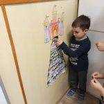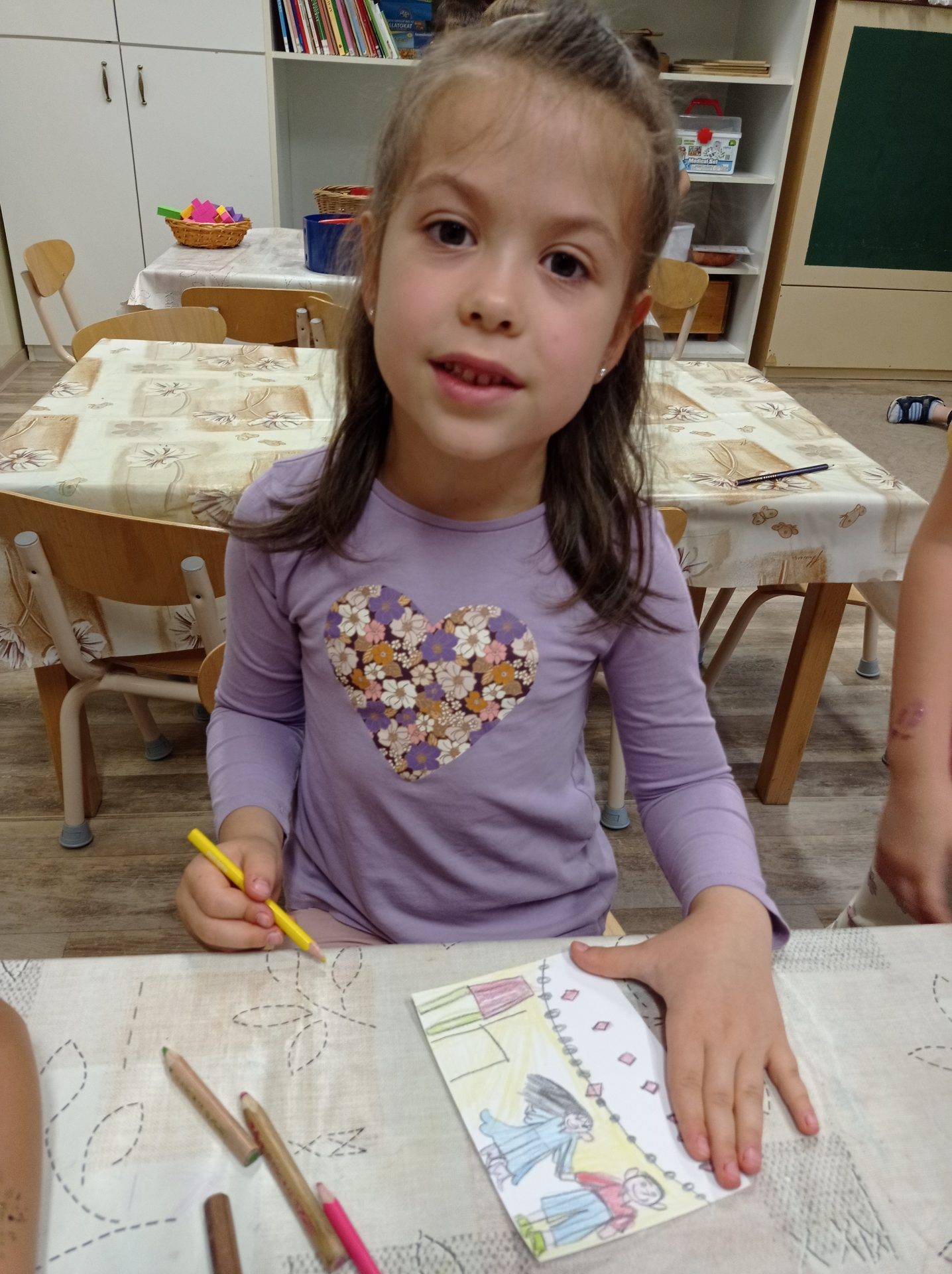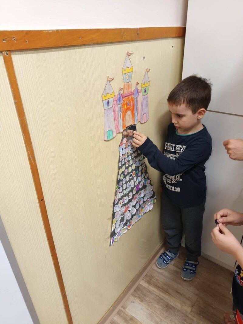 A foglalkozást a Jobb veled a világ című dallal kezdeményeztem, amit kétszer is meghallgattunk. A relaxációs gyakorlat (Totyog a liba, nagy a galiba…) után megérkezett hozzájuk Boldog Dóra. Beszélgetett a gyerekekkel, hogy ő mitől boldog, milyen témákkal foglalkoztunk a Boldogságórákon. A gyerekek sok mindenre emlékeztek („meséket mondtál nekünk”, „Lusta király meséje”, „sportok, mozgásról is beszélgettünk, és bemutattuk a kedvenc sportunkat is”, „mindig felragasztottuk a jelünket a lépcsőre”, „arról is szó volt, hogy hogyan tudunk segíteni és boldoggá tenni a másikat”, „és bocsánatot kérni”). Néhány dolgot nehezen tudták megfogalmazni, nekik rávezetéssel segítettem (hála, kapcsolatok, stb.). Majd a szeretetfolyosón végigmentek a gyerekek. Mindenkinek súgtak valami kedveset. Mivel már iskolába fog menni a csoport, így nem volt nehéz feladat számukra, jól ismerik már egymást, jól összekovácsolódott a csoport. A mese elmesélését (Boldog erdő – Kerekerdő c. mese) interaktív módon valósítottam meg, bevontam őket, apró gesztusokkal, mozdulatokkal fejlesztettem a képzeletüket, tartottam fenn a figyelmüket. Öröm volt látni, hogy teljes mértékig azonosultak a mese szereplőkkel, együtt jártuk be a Kerekerdőt, vették fel a gyöngyöket, adták egymásnak, stb. Majd a mese végén a témáknak a szimbólumait bemutattam, és megbeszéltük, kinek melyik volt a kedvence, ezután lehetőségük volt kiszínezni ezeket. A seprűtánc alkalmas volt a jókedv fenntartására, a gyermekek mozgásának kielégítésére, amely közben jókat nevetgéltek, élvezték a játékot. Aztán leültünk az asztalhoz, és mindenki lerajzolta, hogy a boldogságvárban mi van benn, mit látnak, mit képzelnek el. Sok szép és kreatív rajz készült („Boldog Dóra és Lívia néni vannak a várban”, „Egy korona”, „Csillogó gyémántok”, stb.). A foglalkozás végén „hoztam nekik egy szeretetzsákot”, amiben képzeletbeli „jó dolgok” vannak, pl. ölelés, ezt kellett körbeadni (öleléslánc). Ezután mindenki felragasztotta a jelét az utolsó lépcsőfokra, így beléphetett a boldogságvárba. Aki ezt megtette, a boldogságvárból hazavihetett egy emléket, egy jelképes kis ajándékot (aranymasnit, gyémántvirágot), amit Boldog Dóra hozott nekik a Boldogságvárból. Majd lezárásként megbeszéltük, hogy délután megépítjük a várat a homokozóban, és megmutatjuk a szülőknek is.
