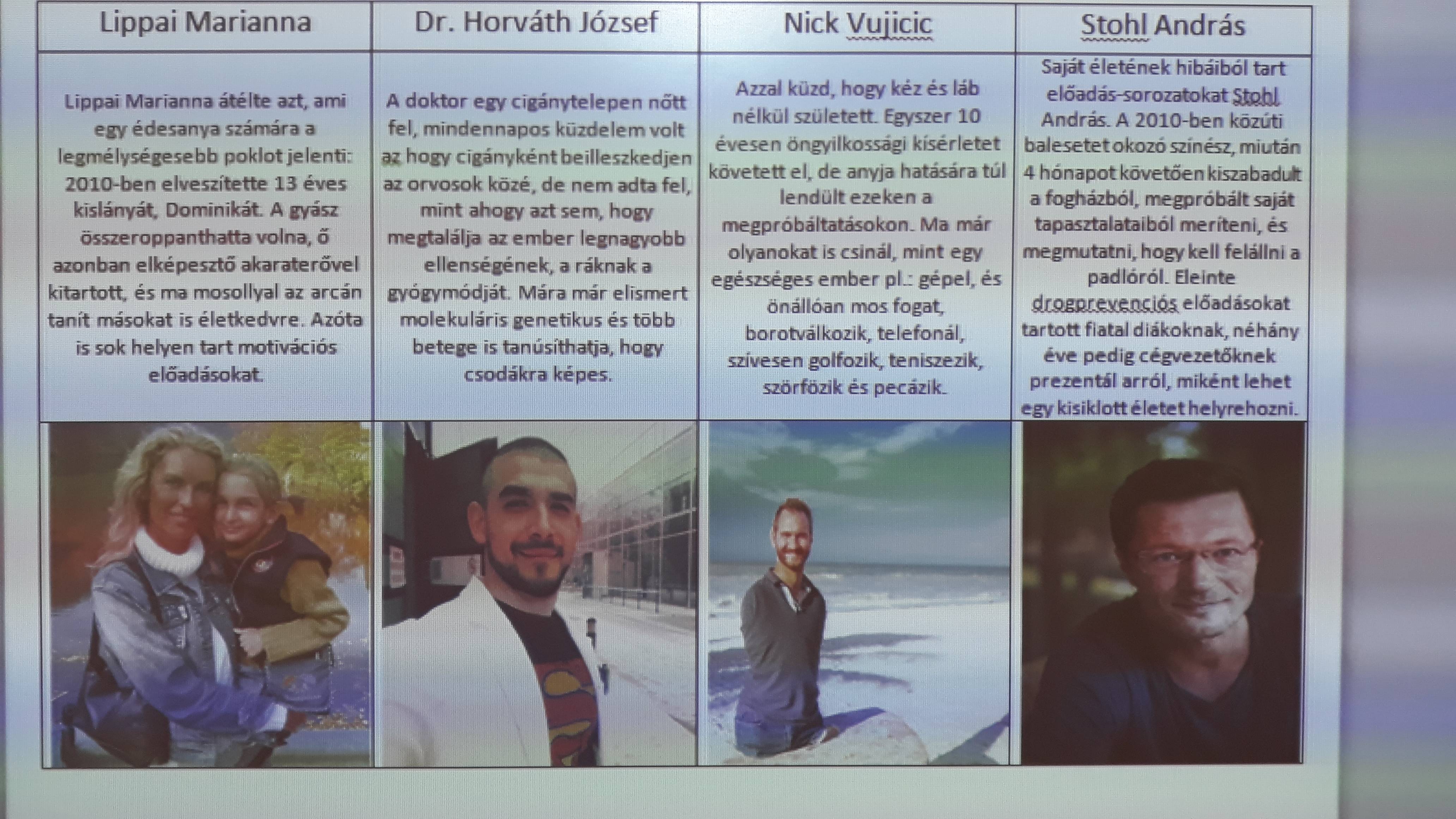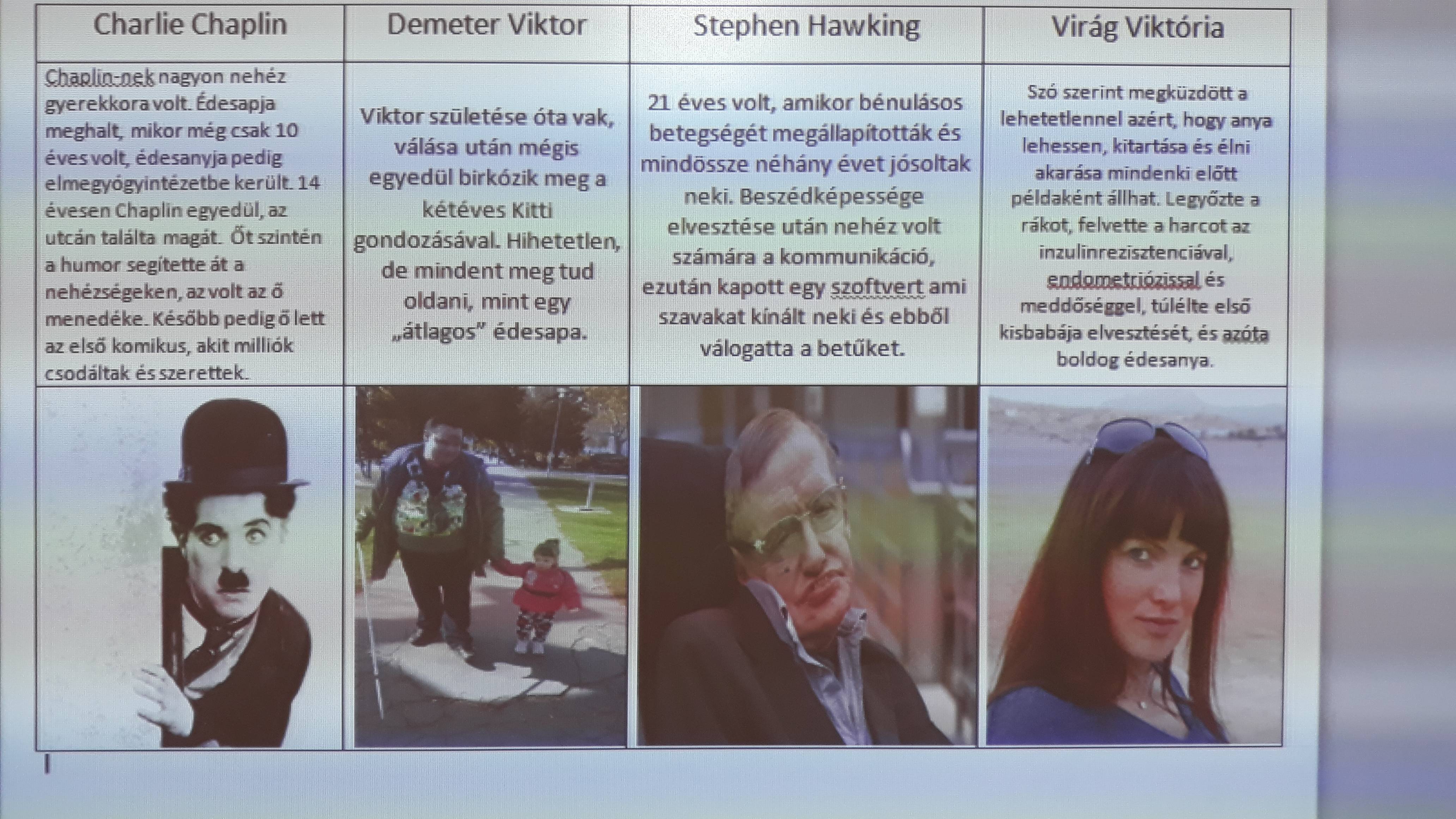 Hál Istennek megállapíthattuk, hogy mi viszonylag szerencsés csoporthoz tartozunk, kevésbé vagyunk ilyen komoly problémákkal való megküzdésben érintettek. Szóba kerültek internetről tudomásukra jutott, ismertebb emberek küzdelmes élettörténetei. Sokan közülük leküzdhetetlennek tűnő akadályokkal birkóztak meg és ma boldog, kiegyensúlyozott életet élnek. A diákok lelkesen beszélgettek róluk, úgy érezték, sok szempontból igazi példaképként állhatnak előttük. Így a megoldandó feladatok közül a tabló készítését választottuk, amelyben a rájuk legnagyobb hatást gyakorló 8 személyről készítettek egy kis válogatást, rövid bemutatásukkal.