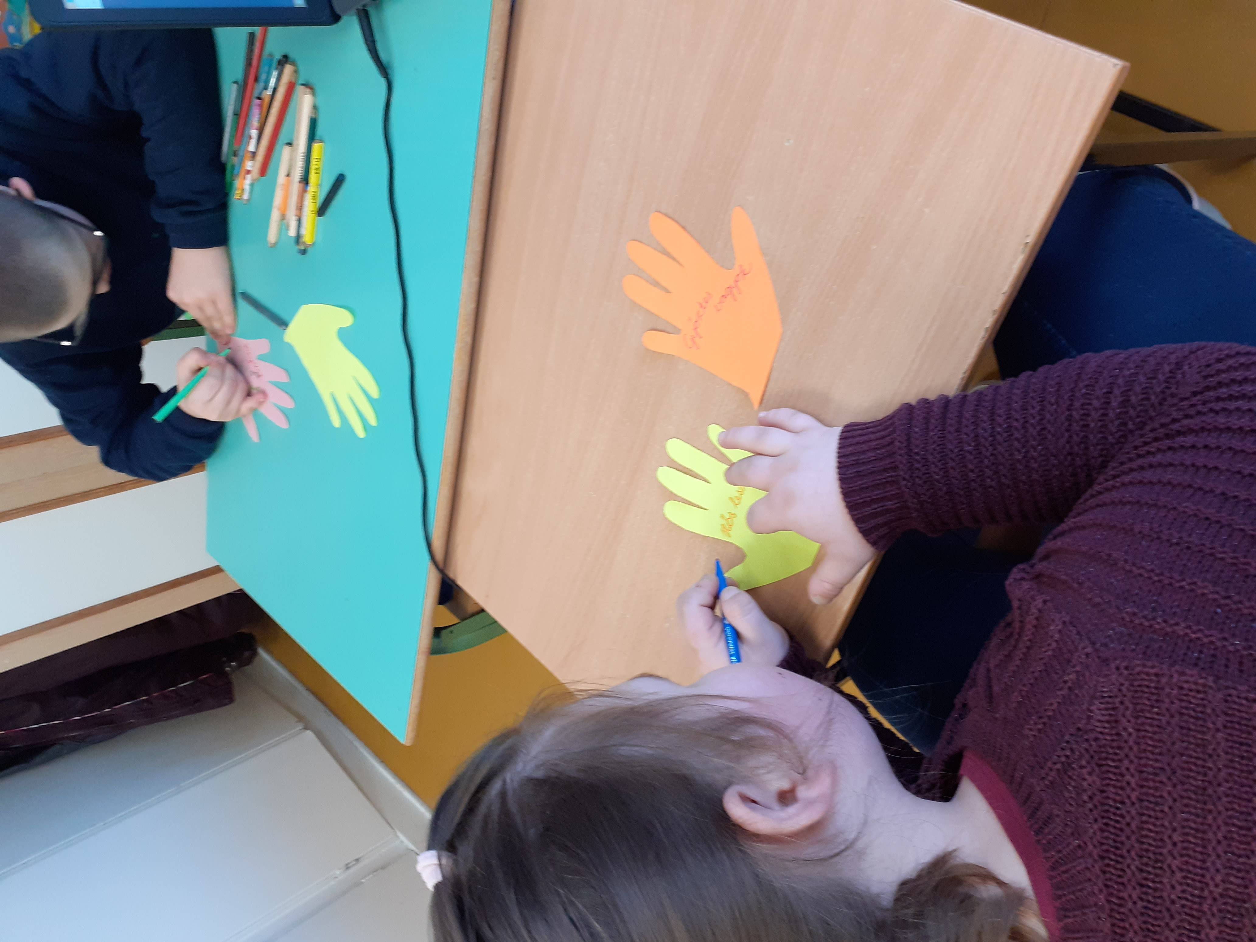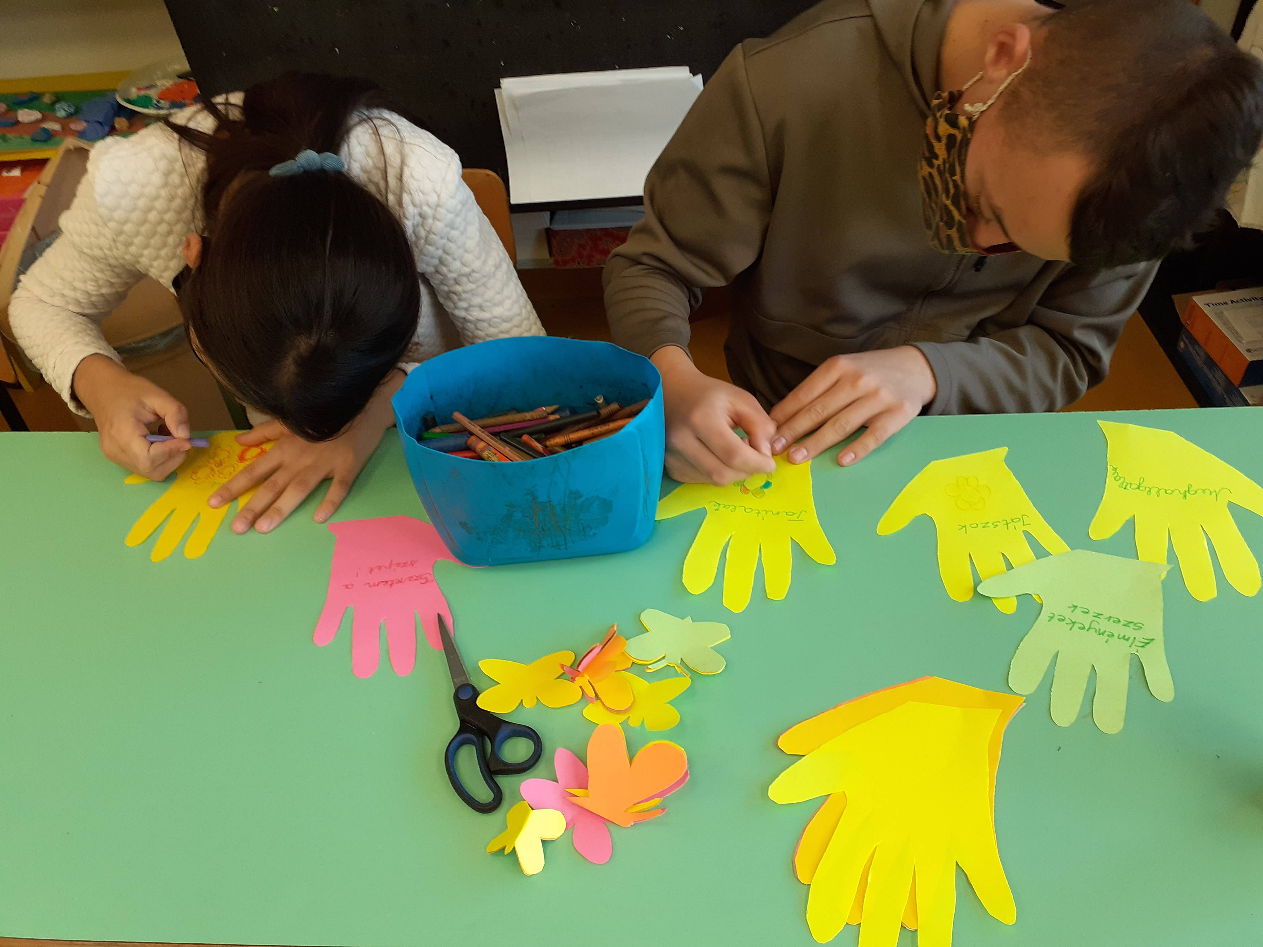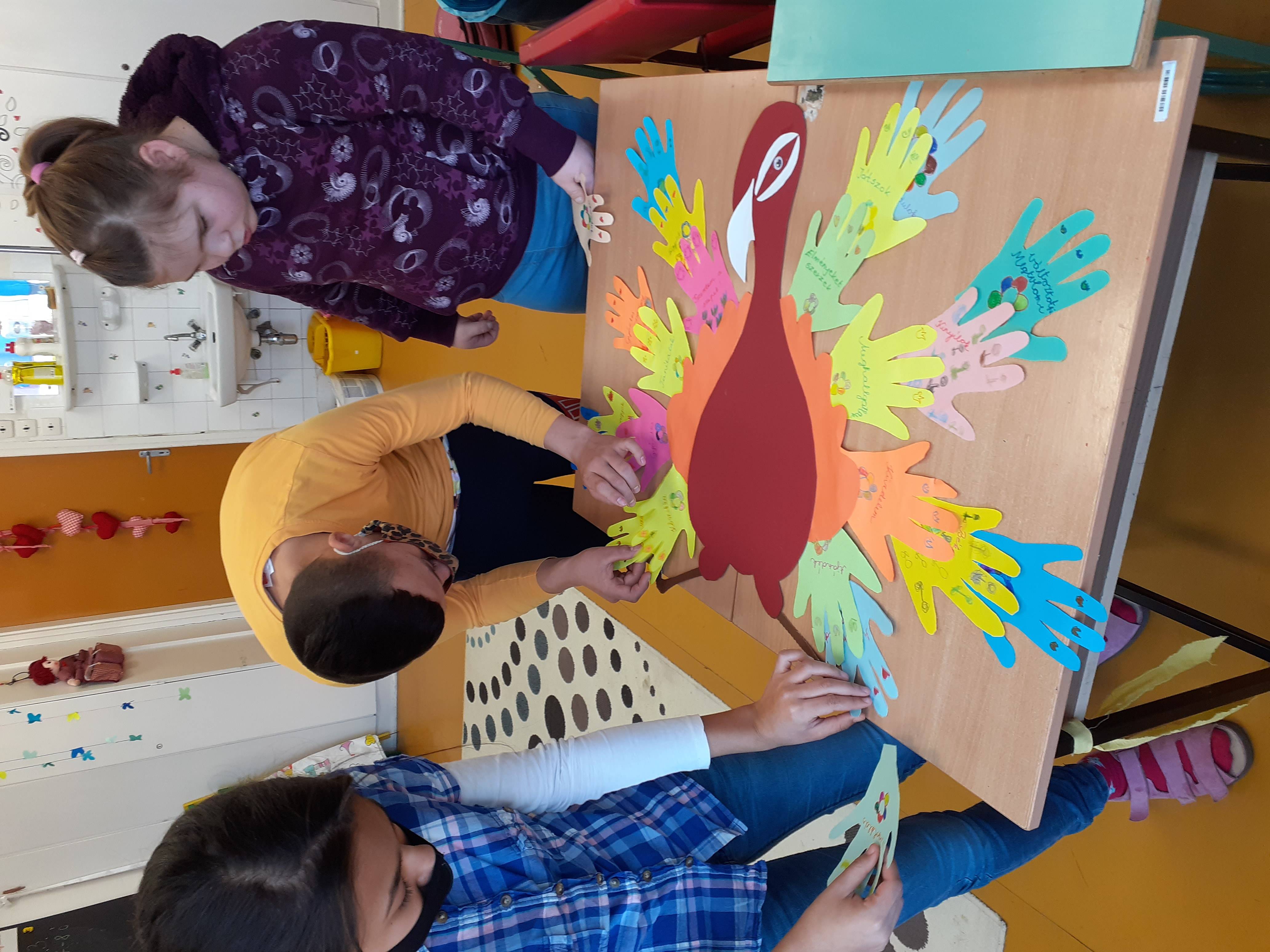 Az állatok világából a pávát választottuk azoknak az érzelmeknek és viselkedésmódoknak a megjelenítéséhez, amit mi a megküzdéseink során fontosnak találtunk. A színes tollakra írták a gyerekek milyen érzelmeket, stratégiákat jelent számukra a fogalom. Ezzel és nevük jelentésével felvértezve lett teljes a hónap témájának a feldolgozása.