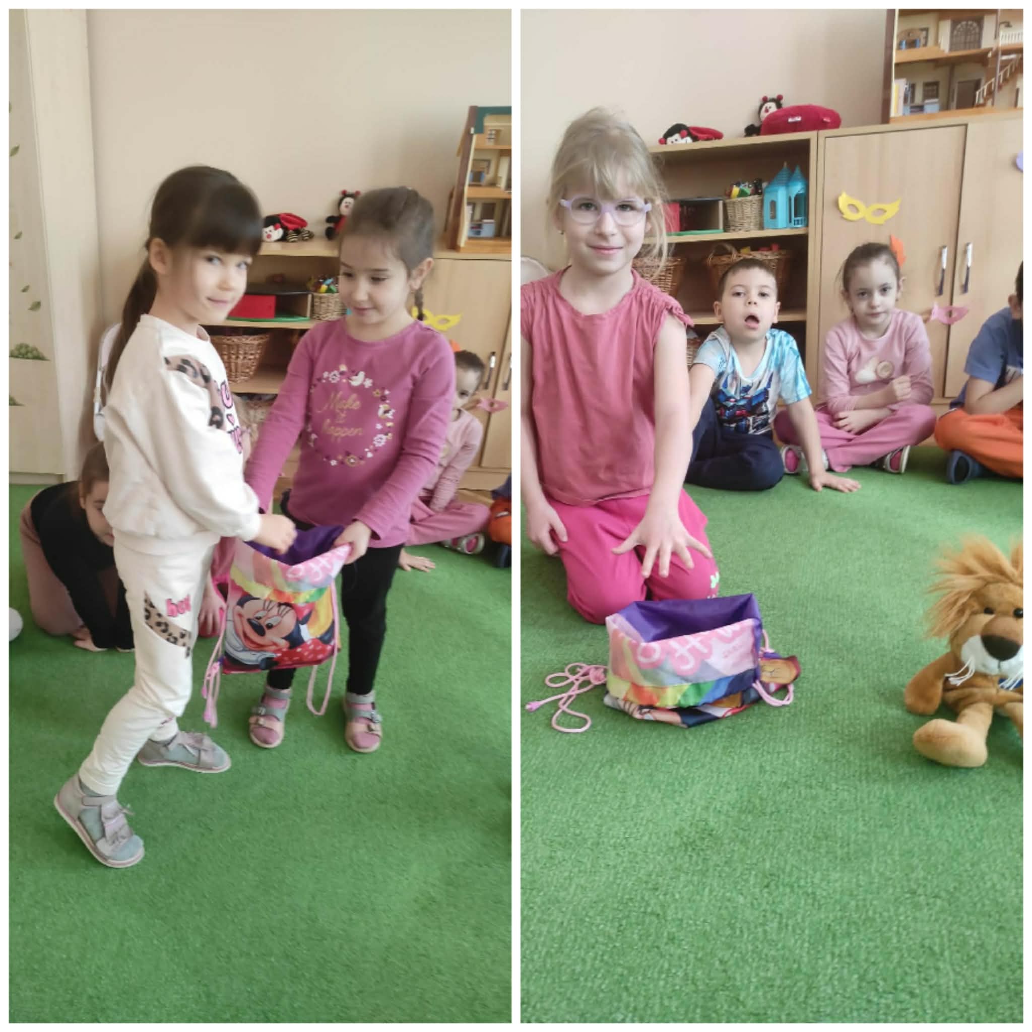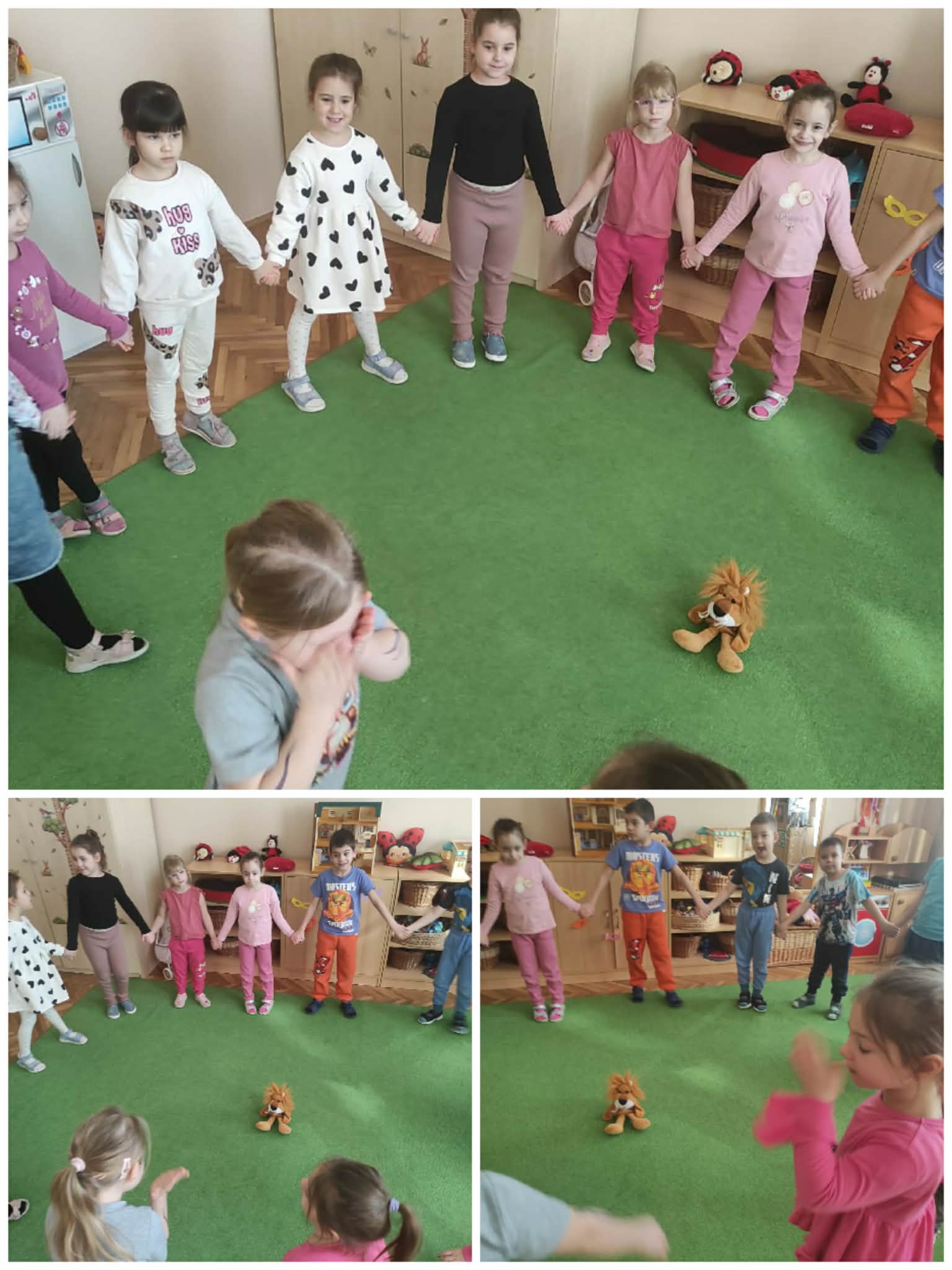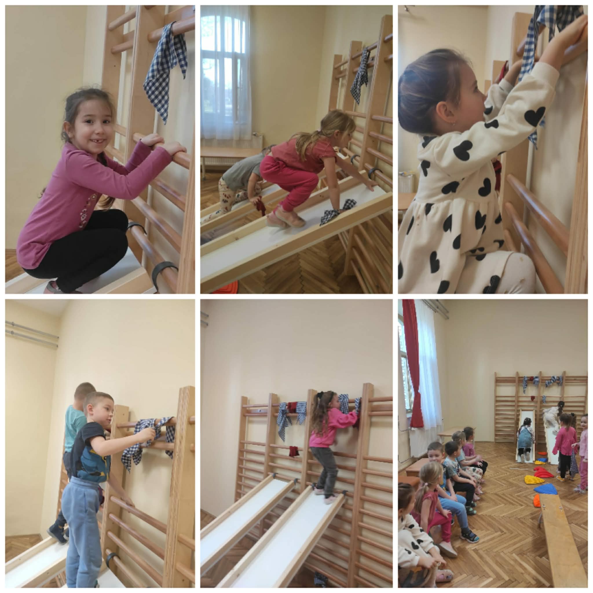 Javasoltam, menjünk át a tornaszobába, ahol jobban elférünk a további foglalkozást tekintve.A kilincsre egy fekete sálat helyeztem (korábban),melyet gyorsan észrevettek a gyerekek. Hamar megfejtettük, hogy a boszorkány hagyta itt, melyre titkos üzenetet írt. ”Felolvastam”, melyből kiderült, hogy akadályokat gördített elénk, amikkel meg kell küzdenünk, végig kell mennünk rajta.-„Mehetünk Katicák?Megcsináljuk?Megküzdünk?”-„Igen!!!”- harsogták a választ. Benyitottunk, s volt ám nagy meglepetés: át kellett bújnunk egy híd alatt (bordás falhoz kapcsolt csúszda), egy alagúton (asztal alatt) át vezetett az utunk, és a zsámolyokra lépve, mint egy gáton lépkedtünk tovább. A bokrok (bólyák) átugrását követően a hosszú egyenes pad gerendáján találtuk magunkat (kidőlt fa, amin egyensúlyozva haladtunk). A folyami köveken óvatosan lépkedve elértük a folyót, ahol úsznunk(rövid pad)kellett. Megcsináltuk, bár nagyon hideg volt a víz,brrr….És azt vettük észre,hogy hernyókká változtunk , (csúsztunk) a következő hosszú padon. -„Jajj,csak nehogy úgy maradjunk!” -mondta aggódva az egyik kislány. De nem, mert amint rátértünk a zöld kanyargós hídra, (hosszú lépegető) azonnal visszaváltoztunk gyerekekké. -”Hű,ezt megcsináltuk,kiálltuk a próbát!Nagyon büszkék lehetünk magunkra!Nagyobb lett az önbizalmunk,bátran nekivágtunk az akadályok teljesítésének!” -„Bár bevallom, kissé féltem,de legyőztem a félelmemet.” -„Ó! Van itt még valami!Csak akkor mehettek ki innen- írta a boszorkány- ha megmásszátok ezt a magas hegyet,és bizonyítékul kitűzitek a zászlót! (torna kendő).” -„Mindenki tud hegyet mászni?”-„Igen!Megpróbáljuk!” Azzal már indultak is a kis Katicák fel a bordás falra, a csúszdáján keresztül mászva. Nagyon ügyesen biztatták egymást,kinek könnyebben,kinek nehezebben ment,de a zászló mindenkié ott lobogott. -„Sikerült!!”- kiáltottunk fel. Büszkén mehettünk vissza, igazi hősként a csoportszobánkba, ahol kicsit pihentünk. Jutalmul meghallgathatták Bagdi Bella :A bátorság erősség dalát.Néhány gondolatban beszéltünk még a bátorságról, hősiességről, annak kapcsán, ami történt velük a tornaszobában.Kincső elmesélte, hogy ő már mászott igaziból hegyet, és eléggé félelmetes volt, de egy másik alkalommal már ügyesebbnek, bátrabbnak érezte magát. Néhányan megosztották még a félelmeiket,de javasoltam,hogy legyen mindenkinek otthon egy kis kavicsa,amit a markába tehet,megszorongatva erőt ad majd nekik.Elfogadták az ötletem.Még egy színes,vidám „félelem evő” zsákot is hoztam elő,amibe virtuálisan beledobták a saját félelmeiket .Tetszett a gyerekeknek, mindenki igyekezett kigondolni valamit. Már éppen össze akartuk csukni a zsákot,mikor egy oroszlán hangja hallaccódott ki belőle. Kiderült, ő azért érkezett a csoportunkba(oroszlán báb),hogy bármikor érez valaki félelmet valamiért,odamehet majd hozzá,és megölelheti, mivel itt marad nálunk. Gyorsan nevet is kapott új kis barátunk, Szimba névre hallgat.Végül kértem a gyerekeket, ha bármikor segítség kell számukra,vagy egy jó tanács, forduljanak hozzánk bizalommal, mert tudjuk milyen rossz,ha valami miatt idegeskedünk,félünk…Sokkal jobb ,ha magabiztosak vagyunk.Végezetül kértem,mutassák meg ,hogy néznek ki az ilyen kisgyerekek(egyenes testtartás,mosolygás).A foglalkozás zárásaként meghallgattuk Bagdi Bella Ellazulni jaj,de jó! című zenéjét,egy kis relaxáció kíséretében.
