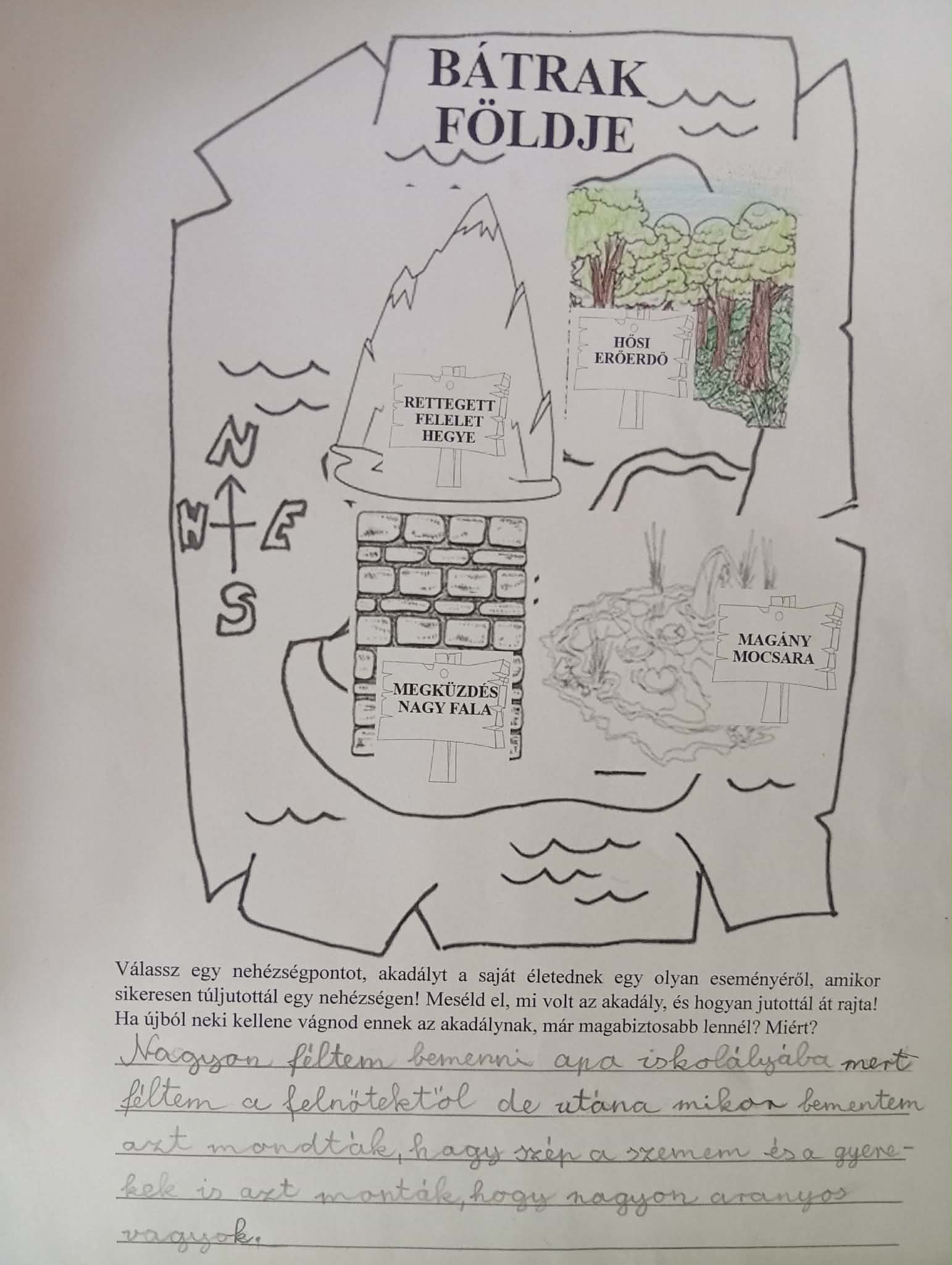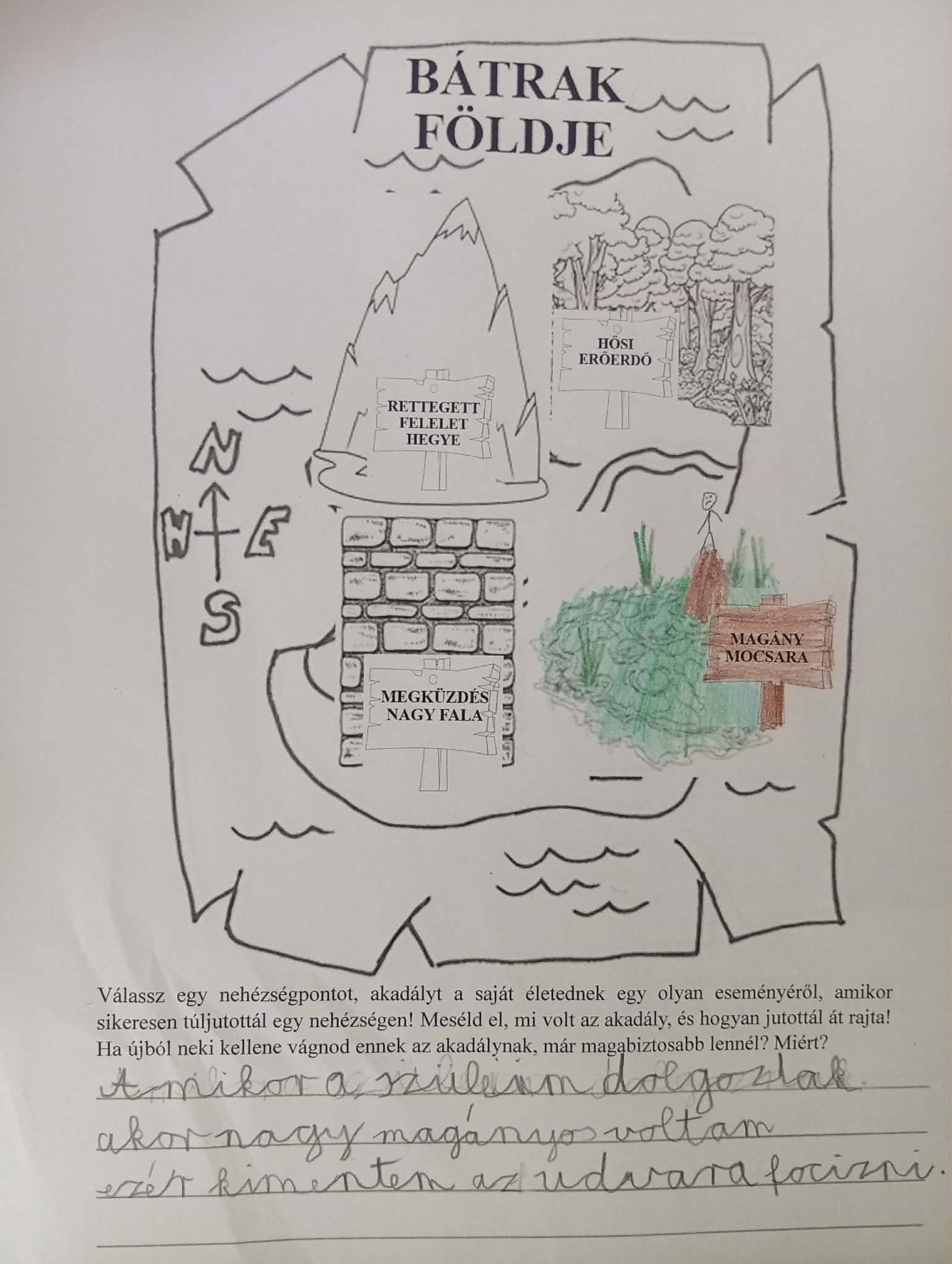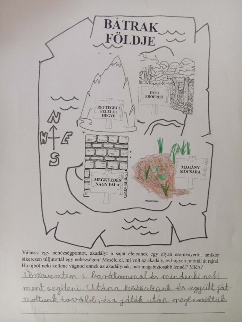2. A pihenés után fedezd fel a Bátrak földjét! A térképen válassz egy nehézségpontot, akadályt a saját életednek egy olyan eseményéről, amikor sikeresen túljutottál egy nehézségen! Meséld el, mi volt az akadály, és hogyan jutottál át rajta! Ha újból neki kellene vágnod ennek az akadálynak, már magabiztosabb lennél? Miért?