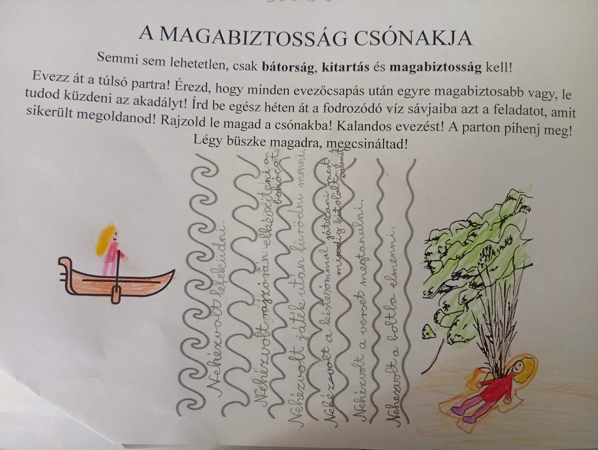 Evezz át a túlsó partra! Érezd, hogy minden evezőcsapás után egyre magabiztosabb vagy, le tudod küzdeni az akadályt! Írd be egész héten át a fodrozódó víz sávjaiba azt a feladatot, amit sikerült megoldanod! Rajzold le magad a csónakba! Kalandos evezést! A parton pihenj meg! Légy büszke magadra, megcsináltad!