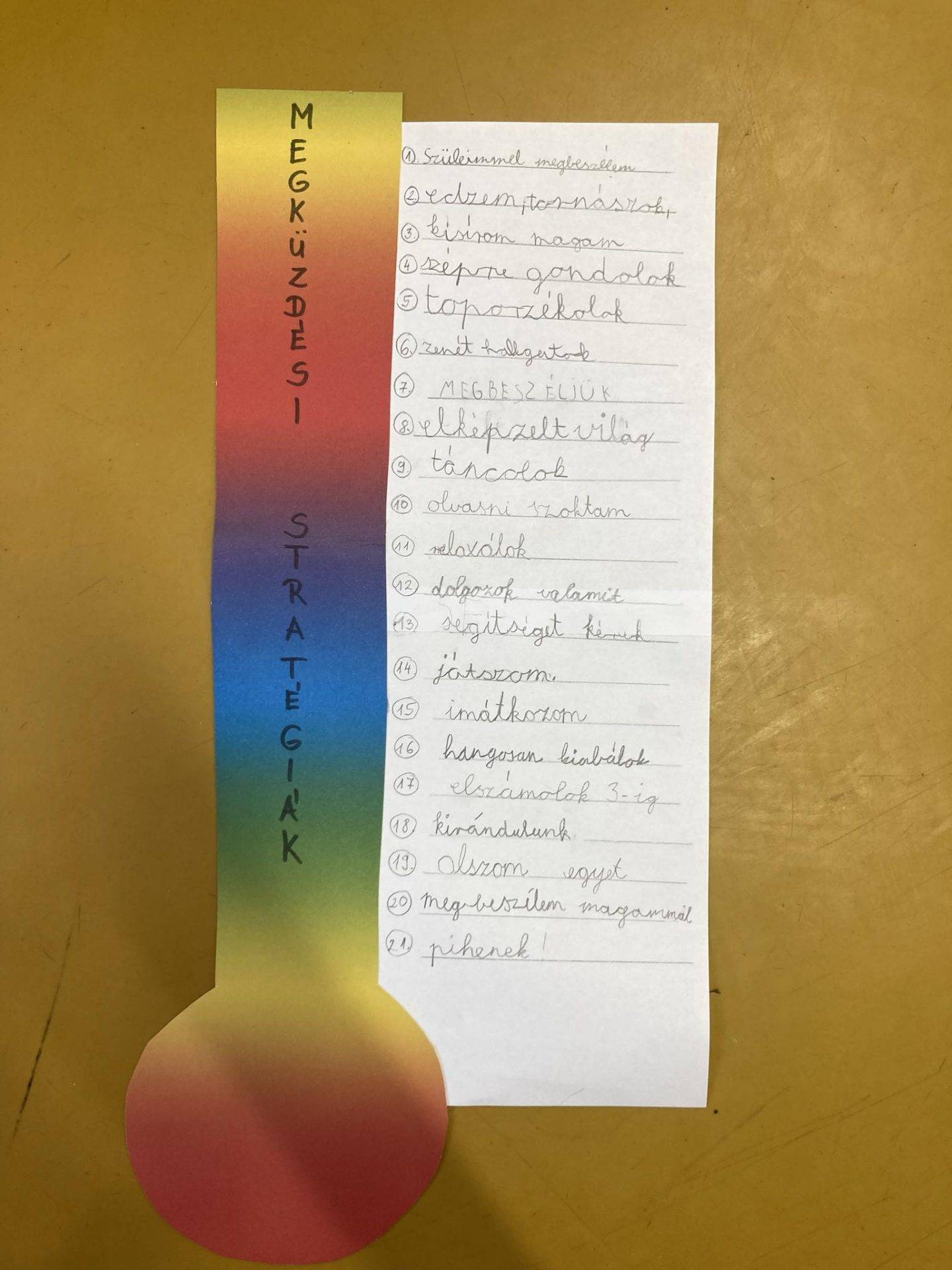 A gyerekekkel arról beszélgettünk, ha valamilyen problémával szemben tatlálják magukat, milyen megoldási módokat alkalmaznak. Ezt színekben a hőmérőn is kifejezték.