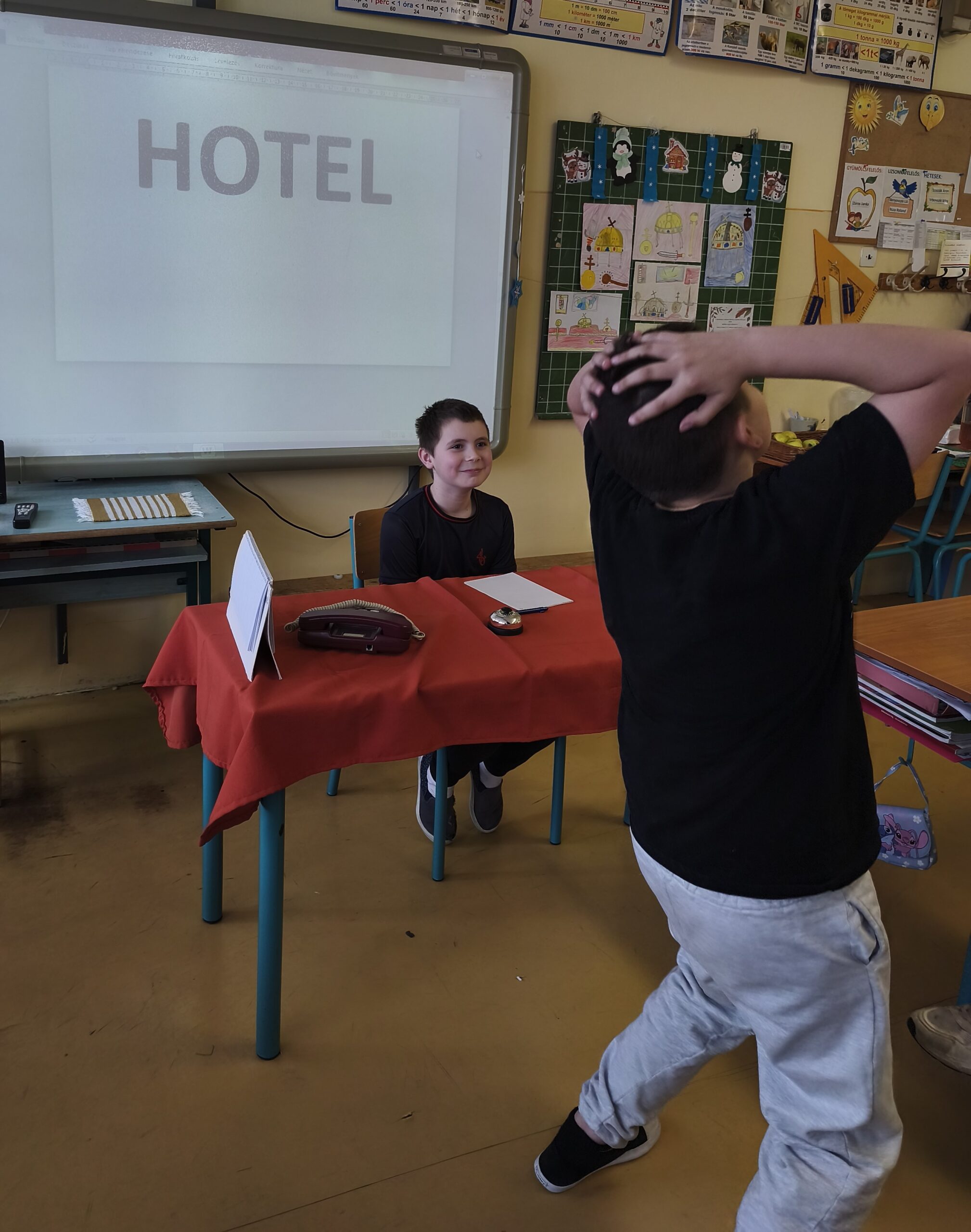 A témakör feldolgozása után a Hotelportás játékkal szereztünk újabb vidám perceket egymásnak. A Hotelben lakó vendég hang nélkül, csak mimikával és gesztusokkal fejezhette ki kérését a portás felé, akinek így kellett a problémára megoldást találni. Nagyon ügyesen, még egymást is meglepve játszották el a szerepeket.