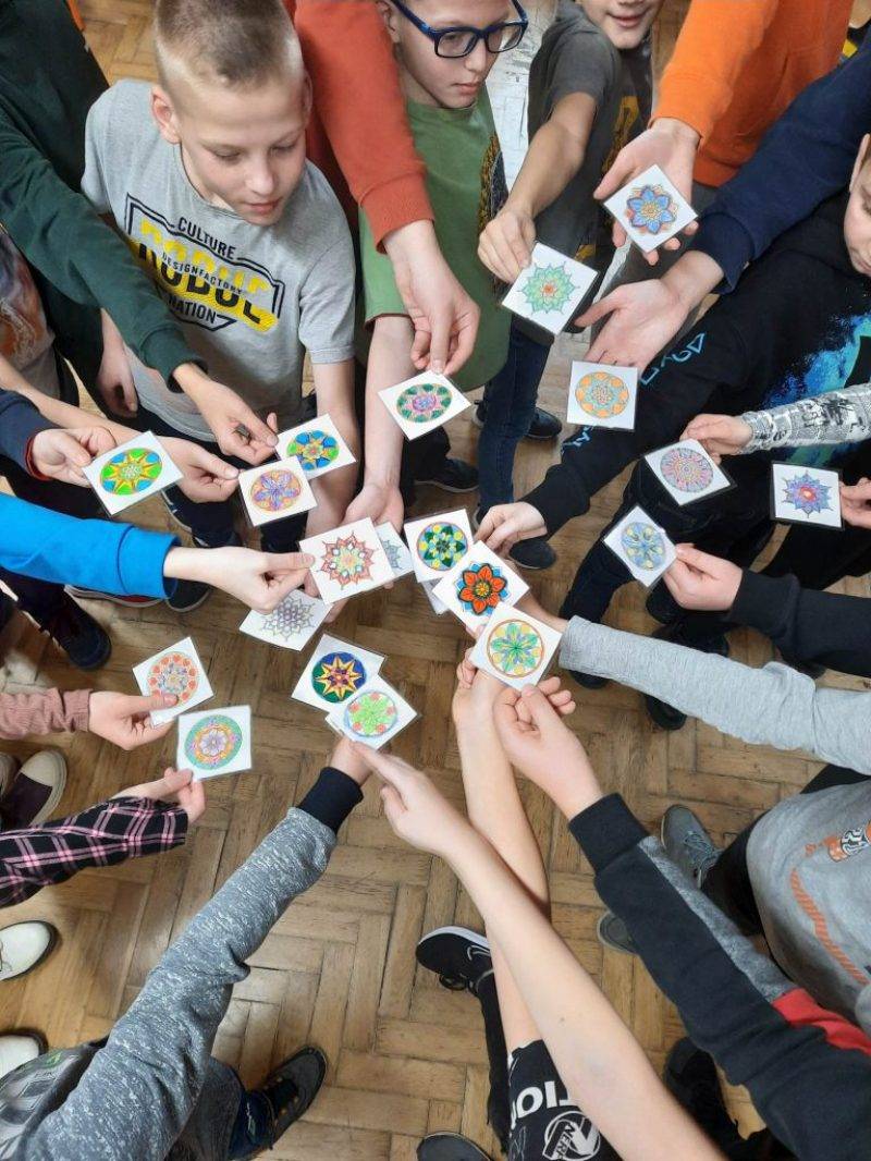 Megnéztük Emoto a vízkristályok üzeneteiről szóló rövidfilmjét, megbeszéltük a film tartalmát, majd mini mandalákat színeztek és ppt-ről kivetített pozitív mondatok közül választottak egyet, ráírták a lap hátuljára, majd lelamináltuk, óra végén kiosztottuk.