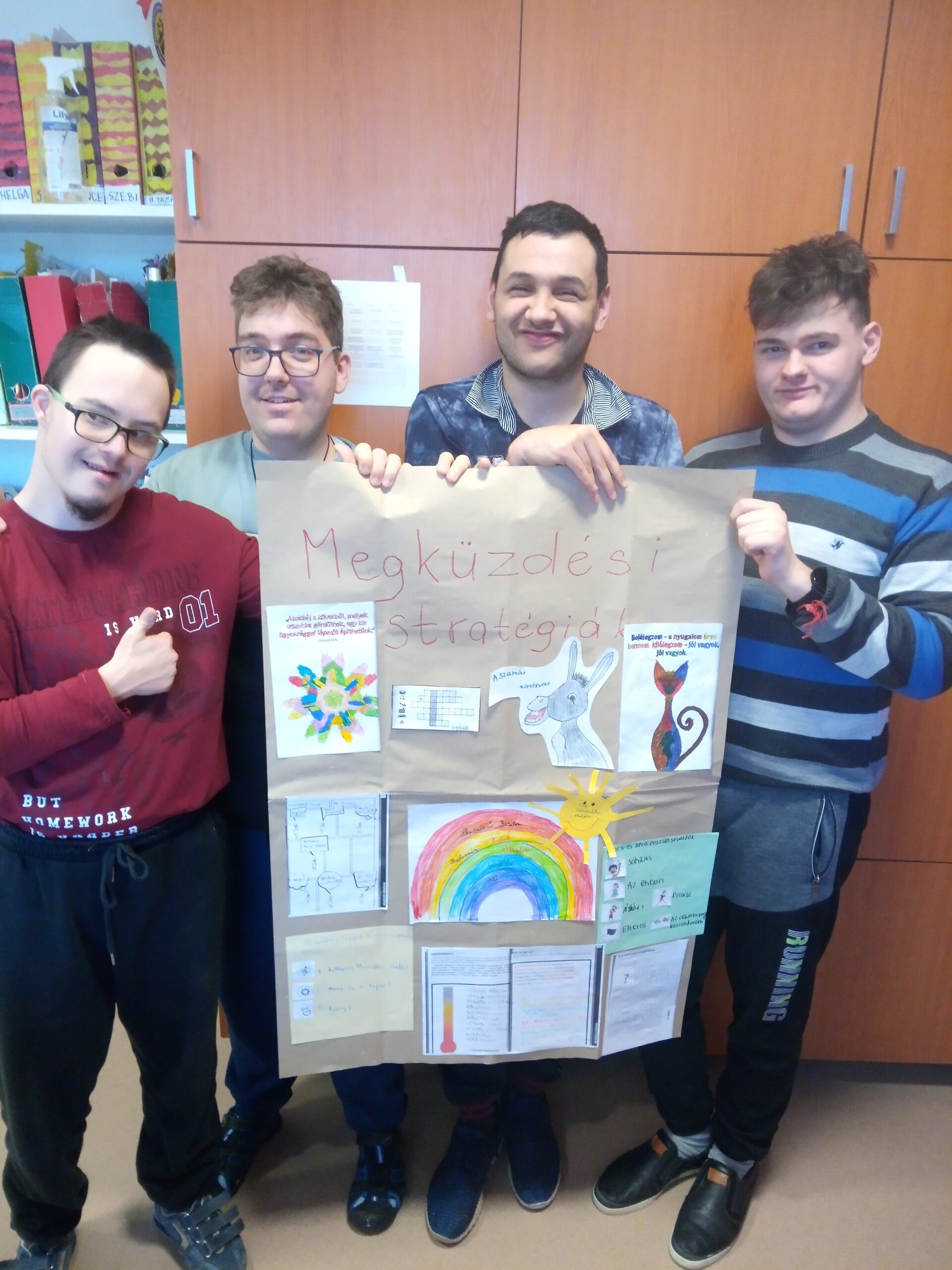Megismerkedtünk A szamár történetével, beszélgettünk a mese tanulságáról, a megküzdésről és a megküzdési formákról. Elkészítettük a megküzdés szivárványát, készítettünk indulathőmérőt és képregényt is. Átnéztük a negyedórás tippeket a stressz leküzdésére, és a gyors és apró feszültségoldókat is. Megkeresetük az utat „A problémától a megoldásig.” Az óra összefoglalására plakátot készítettünk.