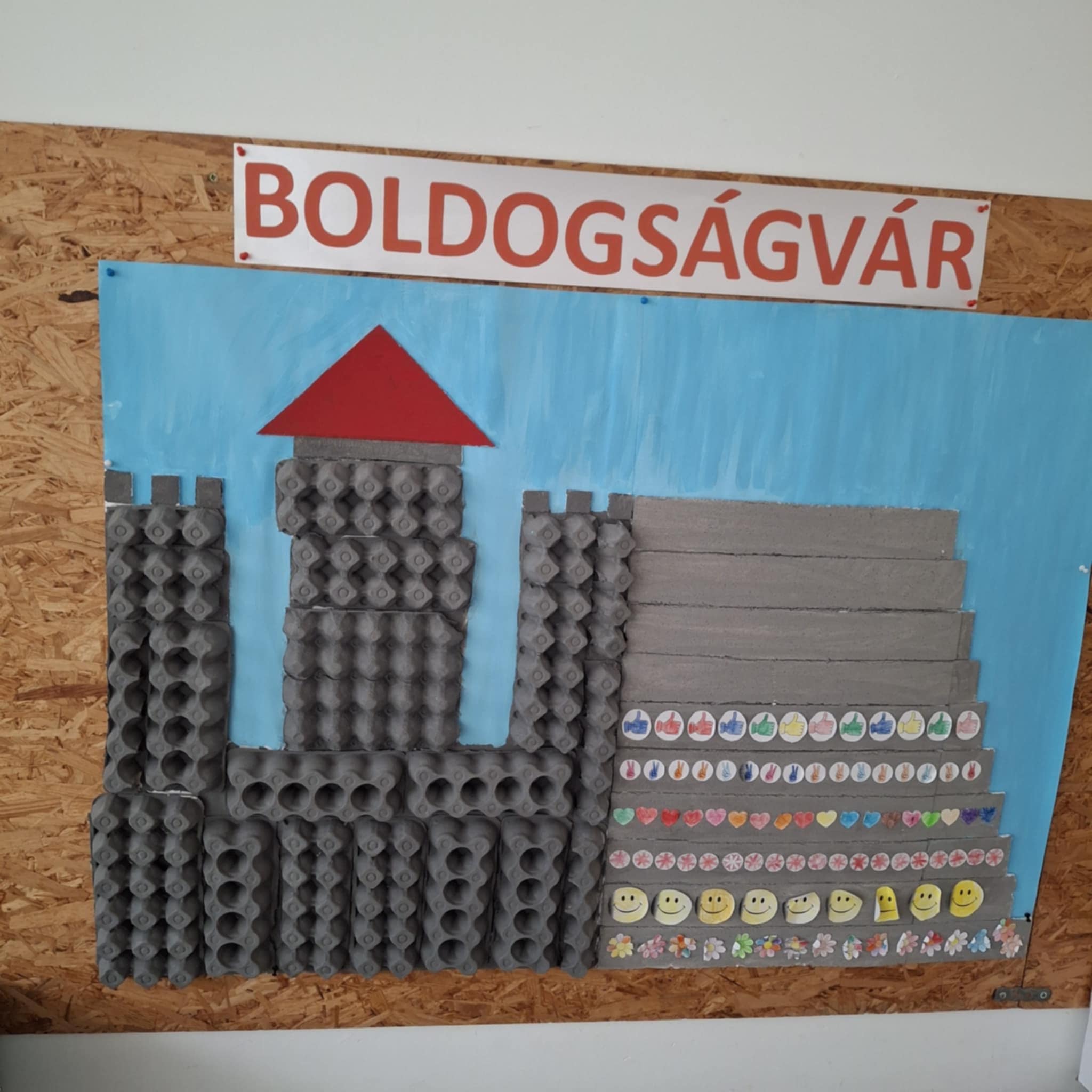 A foglalkozás zárásaként kiszinezik az apró örömök jelét, melyet felrakunk a BOLDOGSÁGVÁR 6.. lépcsöfokára.