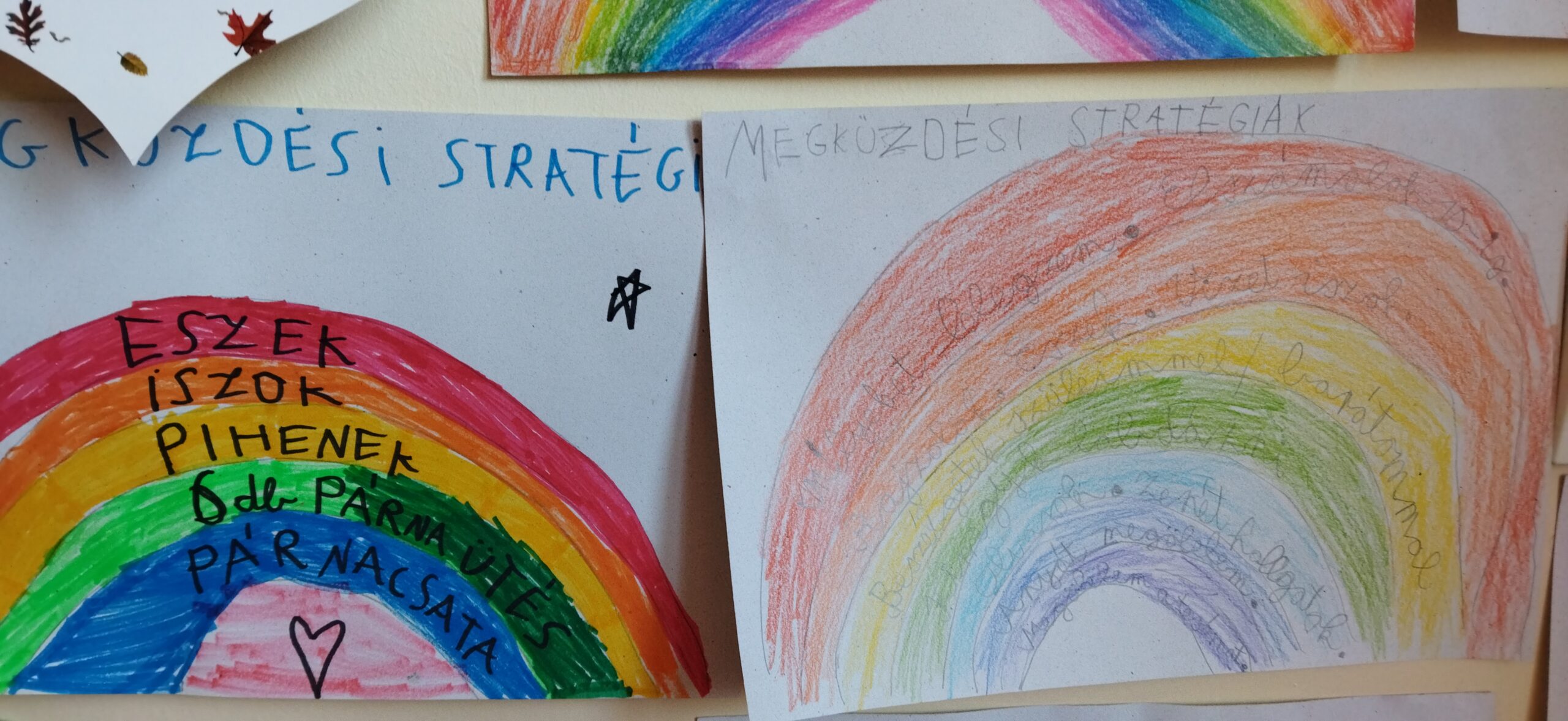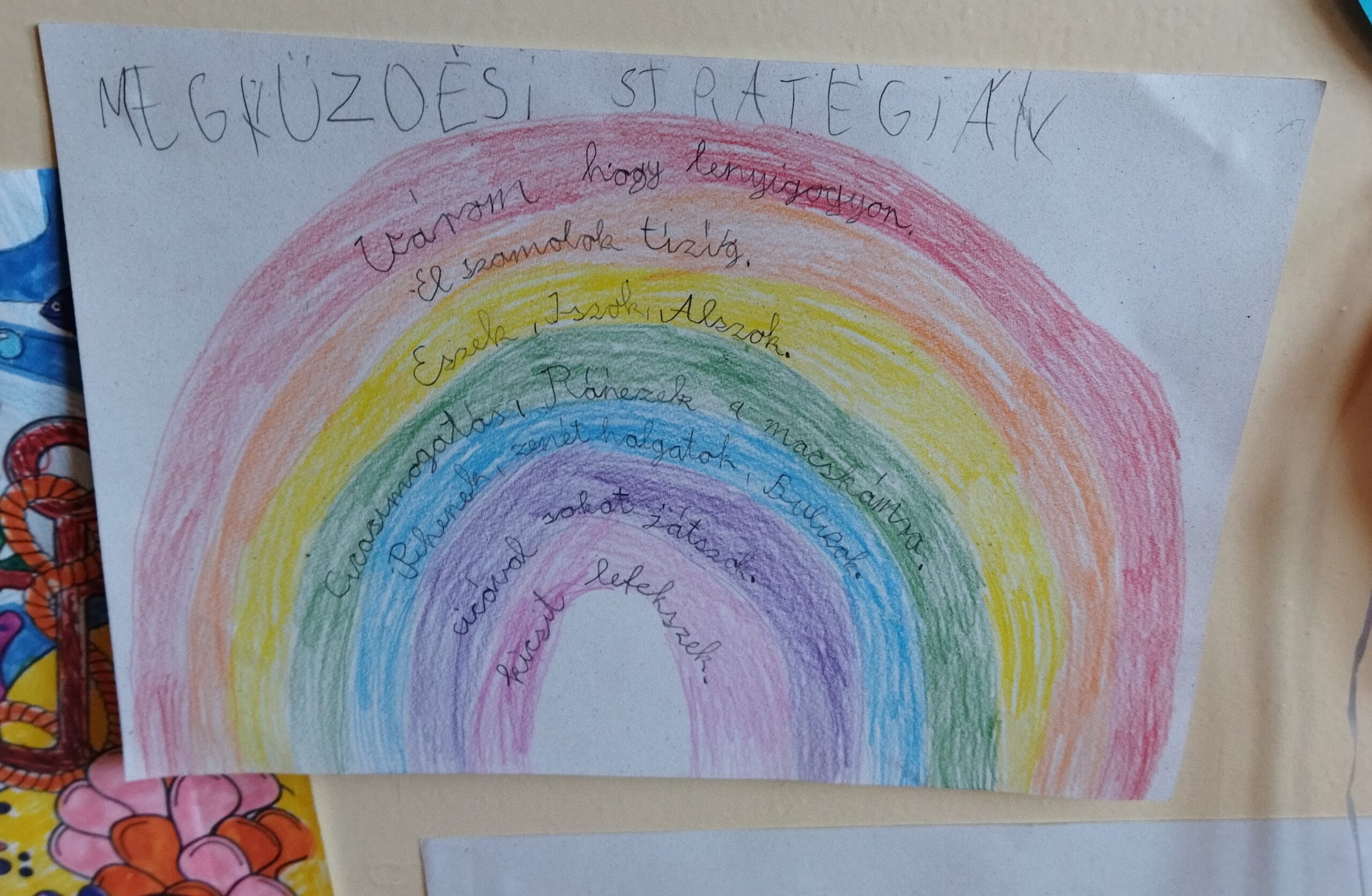 Zenehallgatás után (Bagdi Bella: Ellazulni jaj, de jó!) visszaemlékeztünk a januári fogadalmakra. Megbeszéltük, hogy milyen módszereket alkalmazhatunk megvalósításukra. Az ötletbörze után mindenki megalkotta saját szivárványát, melybe feljegyezte azokat a módszereket, melyeket használni fog a nehézségek leküzdésére. A megküzdés szivárványát hazaviszik , hogy mindig szemelőtt legyen a segítség.