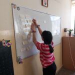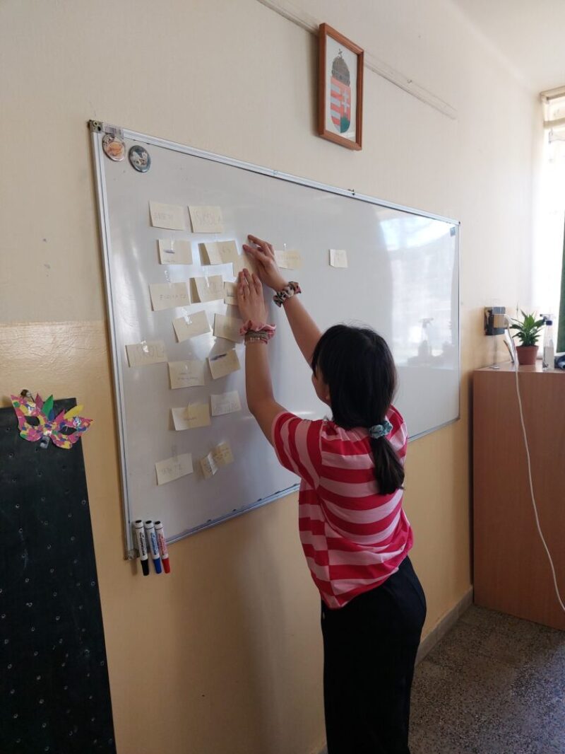 Ezt követően minden diák kapott egy kis cetlit, amire név nélkül felírtak egy-egy dolgot, ami az ő életükben a fő stressz forrás. Ezeket a cetliket utána felragasztgattuk a táblára és csoportosítottuk. Ez alapján arra jutottunk, hogy jelenleg az iskolai elvárások és megfelelési késztetés okozza a legtöbbeknek a legnagyobb stresszt. Ezen kívül felmerültek társadalmi elvárások és családi gondok is. Megnéztünk egy videót is, ami a stresszt és a függést hozta párhuzamba egymással. A foglalkozás zárásaként mindenki rajzolt egy táskát, amibe beleírt néhány ötletet arra, hogy hogyan lehet megküzdeni a stresszel. Ezt a „pakkot” vihette haza magával mindenki erről az alkalomról.
