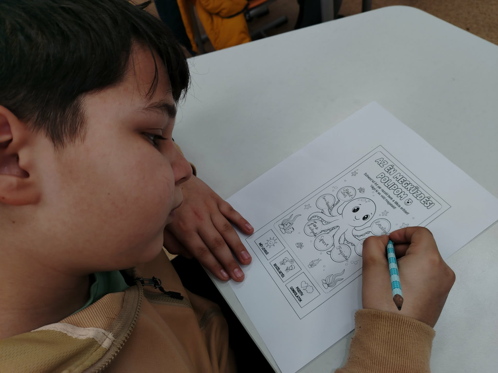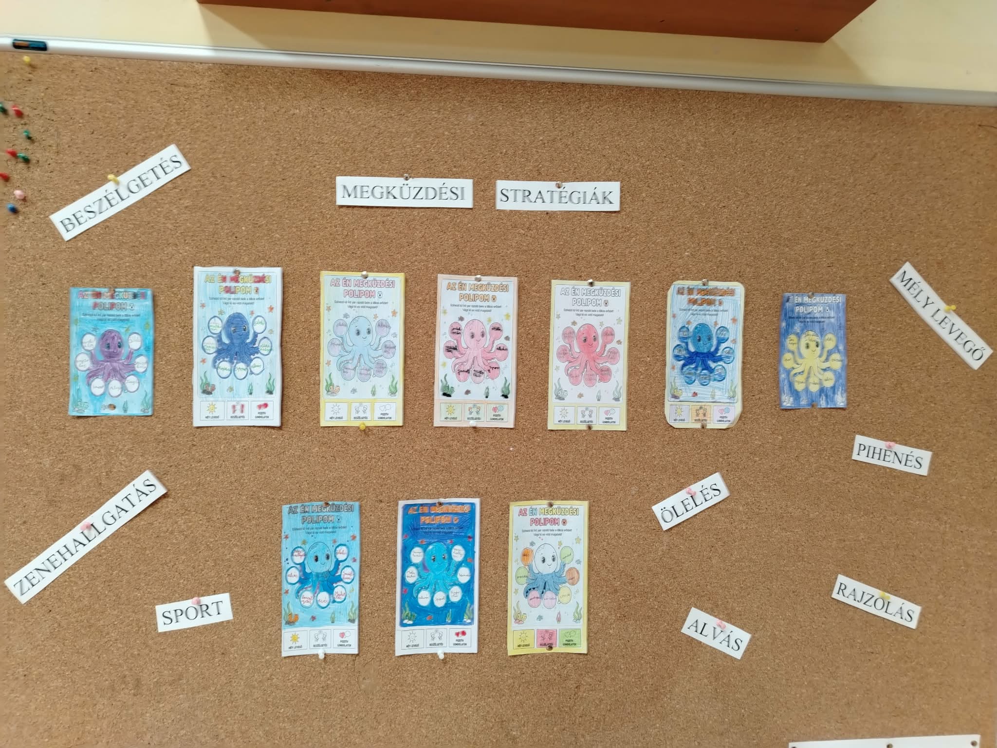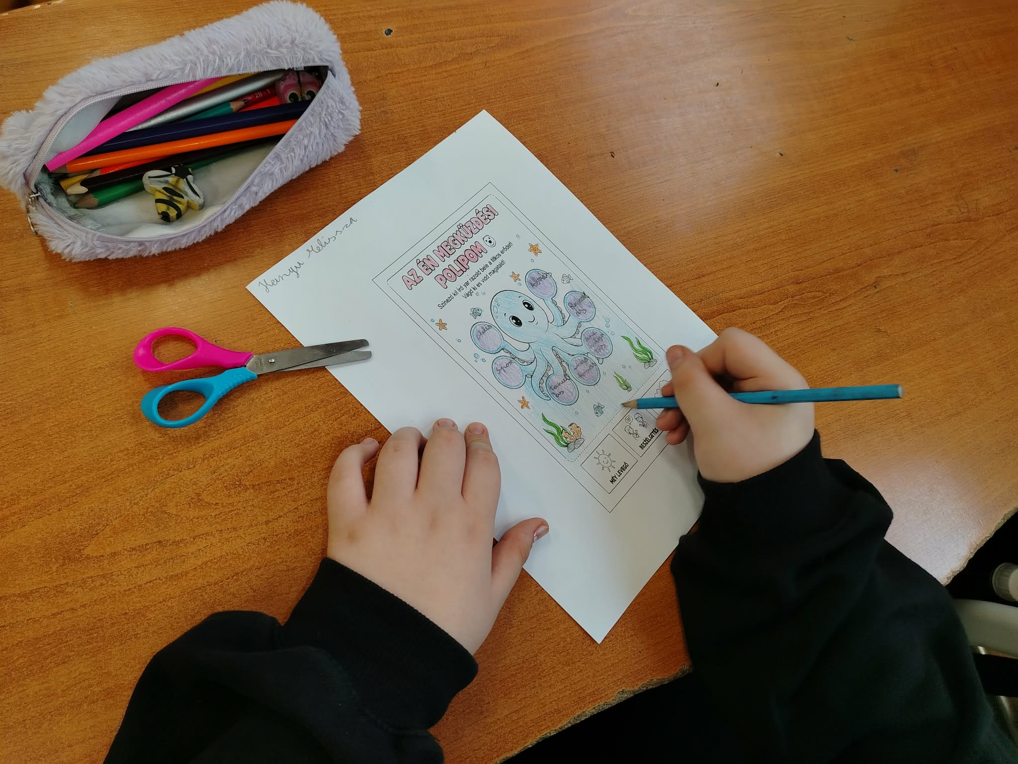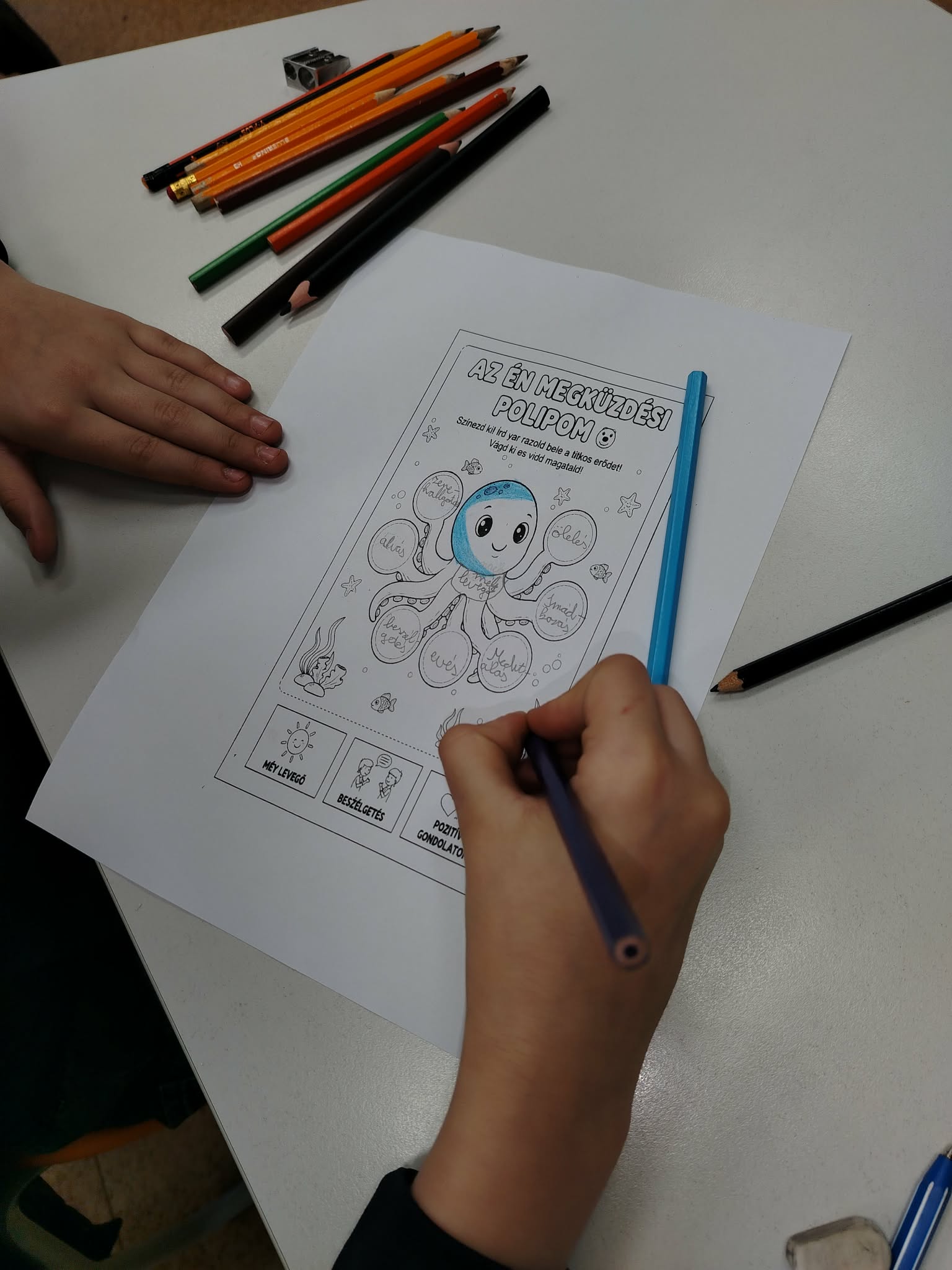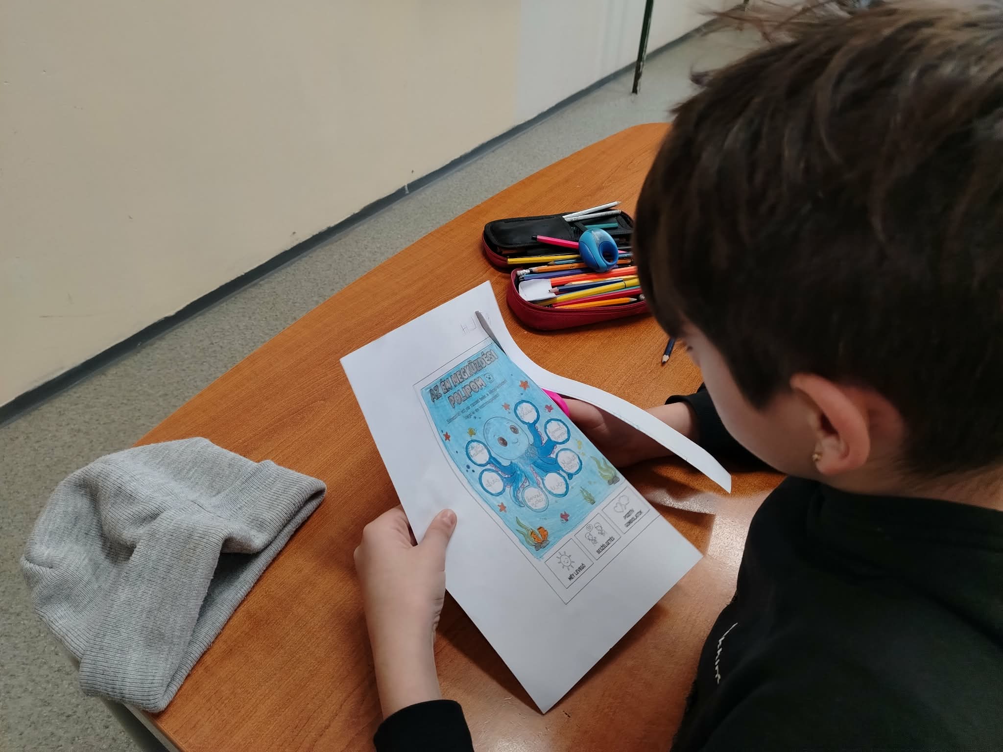 Februári boldogságóránk központi témája a megküzdés képességének fejlesztése volt. A foglalkozást beszélgetéssel indítottuk, ahol a gyerekek megosztották saját tapasztalataikat arról, mi segít nekik megnyugodni és visszanyerni az erejüket a nehéz pillanatokban. Megnyugtató volt látni, hogy a diákok mennyire nyitottak és támogatóak voltak egymással, miközben felismerték: a problémák elől nem elmenekülni kell, hanem eszközöket találni a legyőzésükhöz. Összegyűjtöttük azokat a „szupererőket”, amelyek segítenek átvészelni a nehéz napokat. Hamar kiderült, hogy az osztályközösségünk tagjai már most is sok ügyes technikát ismernek: ölelés, a zenehallgatás és a baráti beszélgetések mind-mind felkerültek a képzeletbeli listánkra. Ezután az órát kézműves foglalkozással folytattuk. Mindenki kapott egy saját papír alapú polipot. Az volt a feladatuk, hogy a karikákba írják bele azokat a dolgokat, amelyek segítik őket, ha szomorúak, ha izgulnak valami miatt. Majd tetszés szerint kiszínezték a polipokat és kivágták. Az elkészült rajzot kitettük a faliújságra.