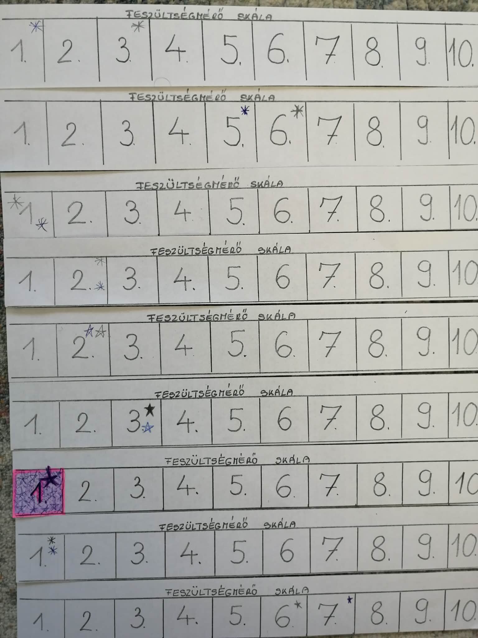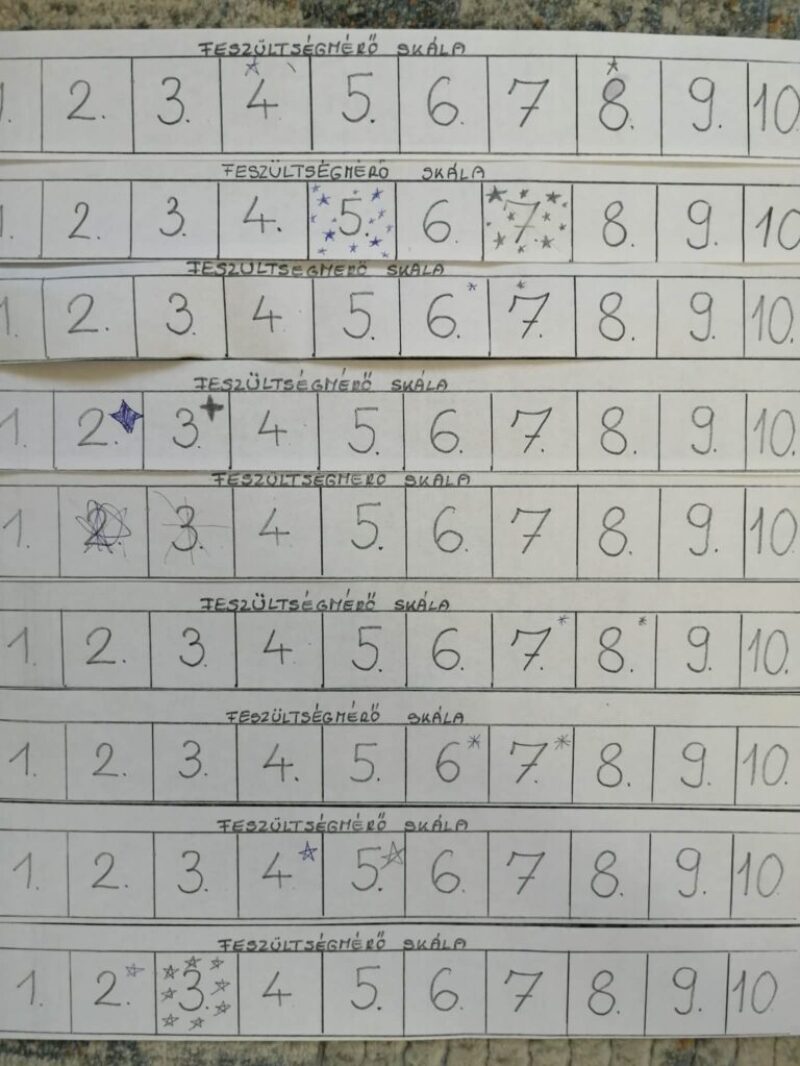 A megküzdési stratégiák órához és egyéb órák kezdésekor gyakran használunk légzőgyakorlatokat, jobb-bal agyfélteke összehangoló, feszítő- lazító gyakorlatokat. Ezeket már megszokták a gyerekek. Valamint meditációt is alkalmazunk, amely többnyire átírt formája az ajánlottnak. Most feszültségmérő skála segítségével megnéztük éreznek-e valamilyen változást? Természetesen tizennégy éveseknél elkerülhetetlen, hogy ne lássa át az ok-okozatot, így ezt a mérést nem lehet, csak tájékoztatónak értékelni. Vagy a várható eredményt produkálták, vagy szándékoltan kisebb javulást. Így 18 jelenlevőnél, egy négy értéket, kettő kettő értéket, nyolc, egyet javult. Hat nem változott, egy eggyel romlott.