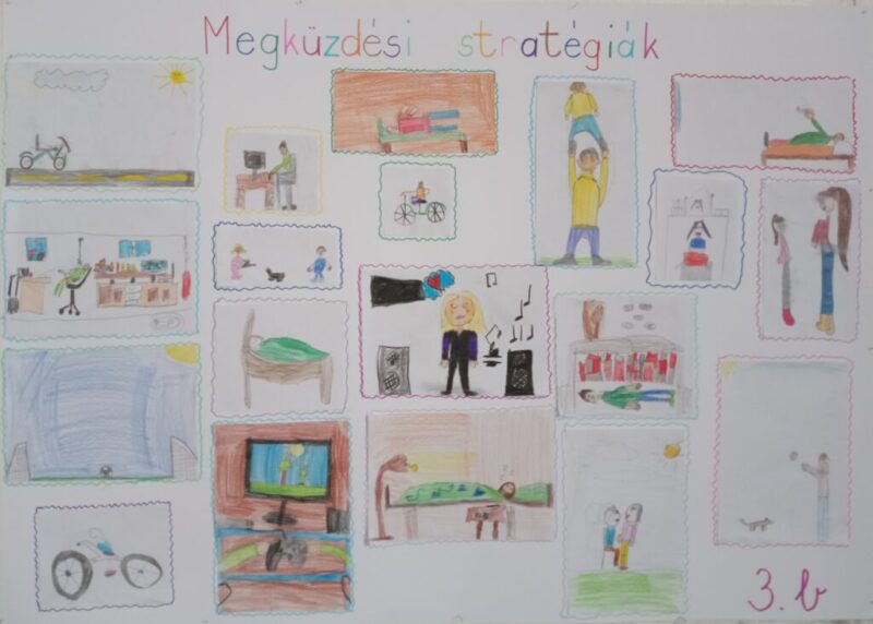 Beszélgettünk a különböző stratégiákról, módszerekről, ki hogyan bírkózik meg a problémával. Ezeket lerajzolták, majd plakátot készítettünk belőle. Kitettük a tanterembe, hogy emlékeztesse őket arra, hogy mindig van megoldás, keresni kell, nem adjuk fel.