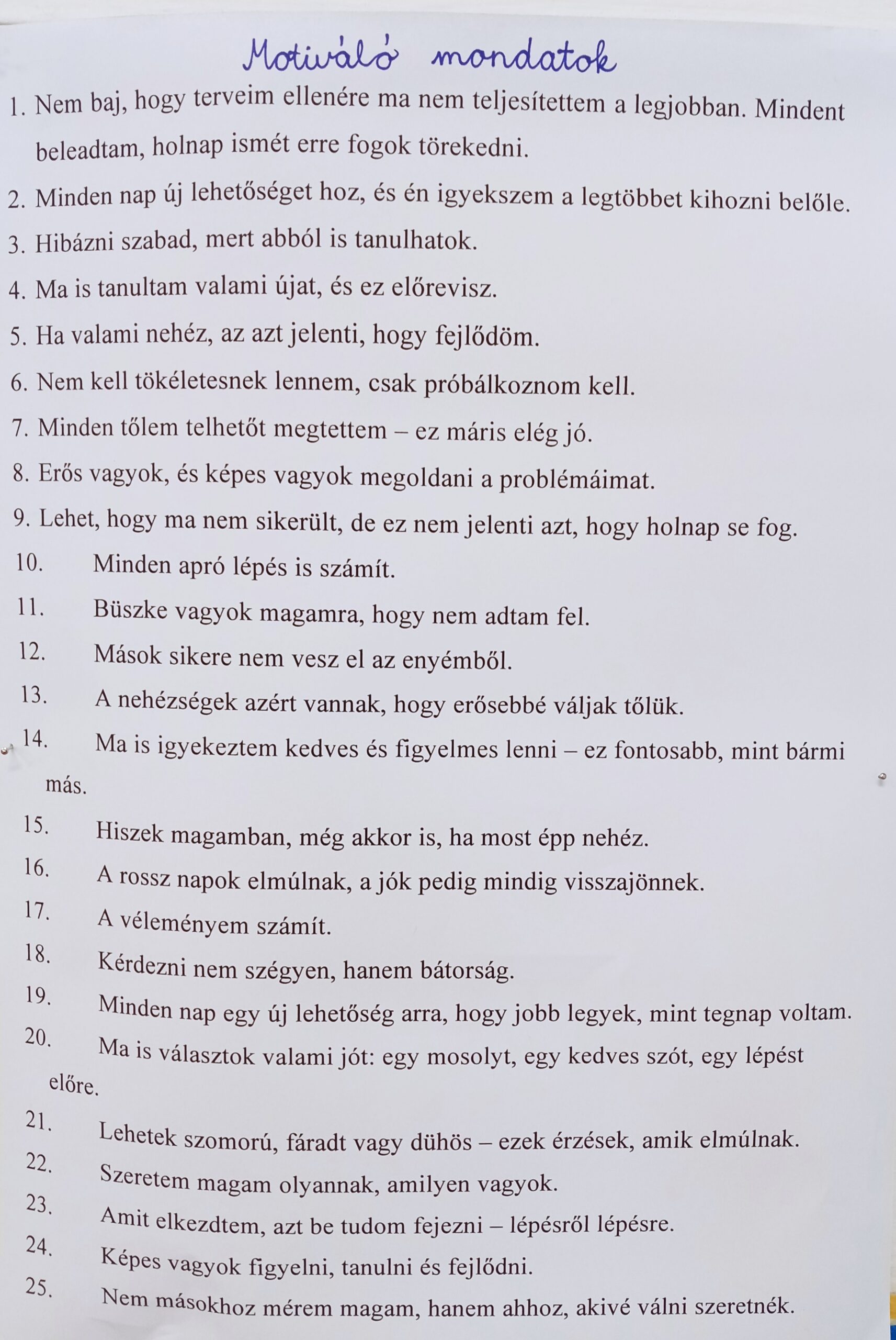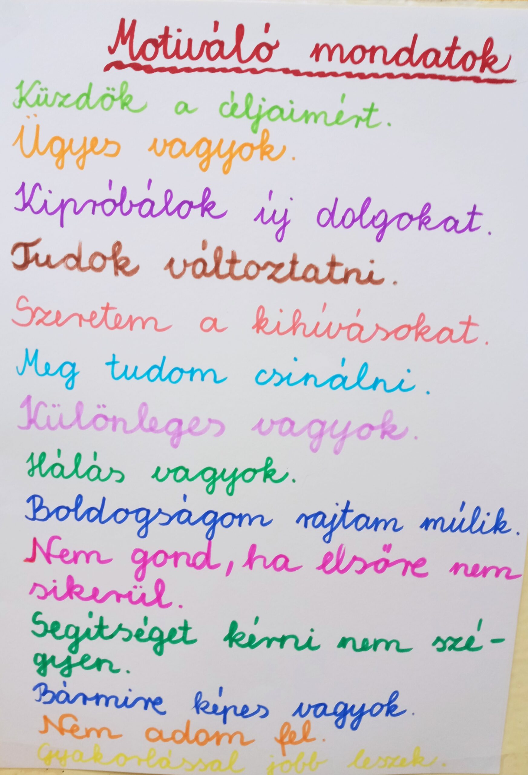 „Ne keseregj!” – Gyűjtöttünk olyan mondatokat, amelyek segíteni szoktak nekik, ha problémába ütköznek. Ezeket ki is tettük a teremben.