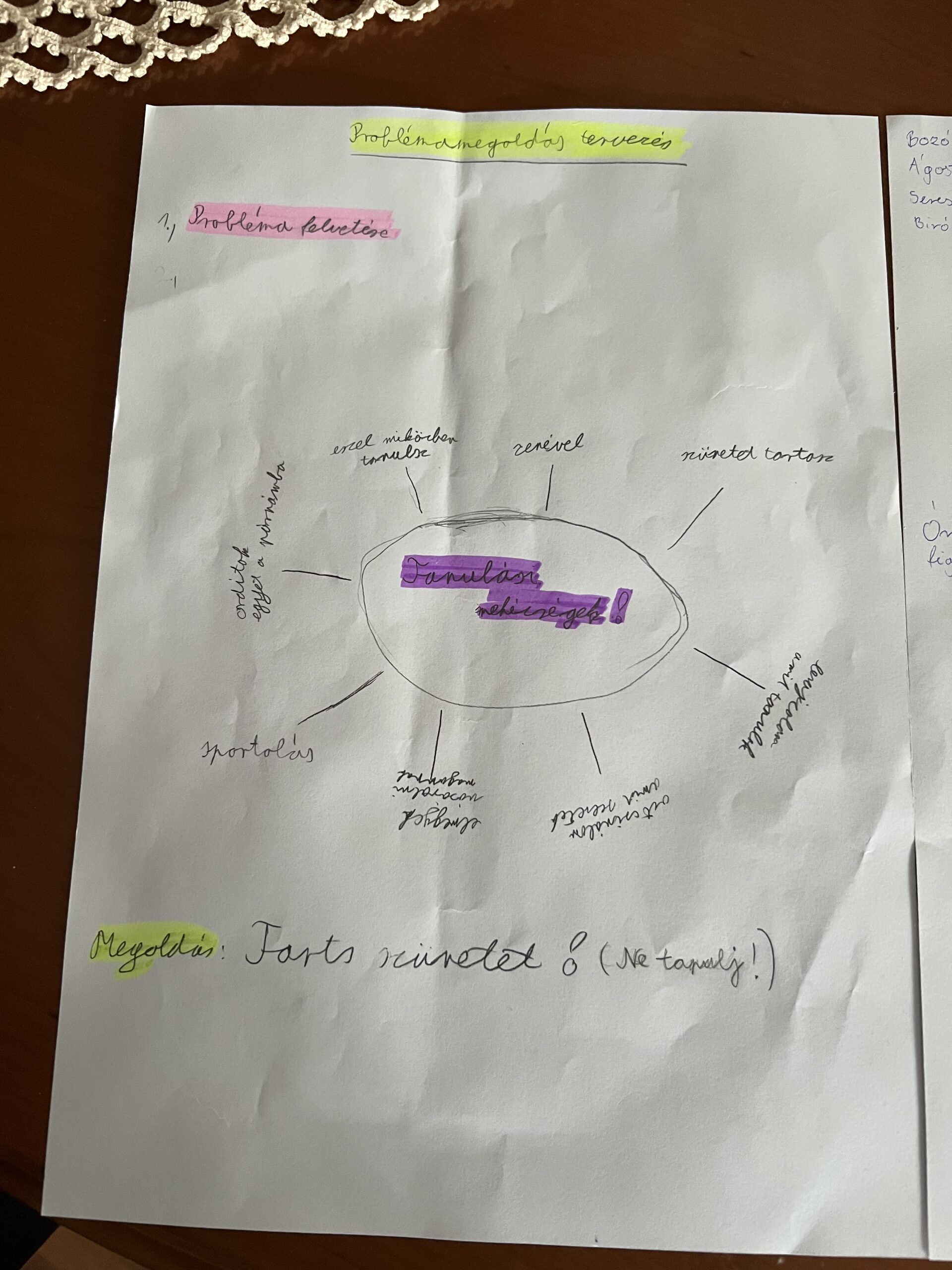 Problémaközpontú megküzdéshez: Probléma meghatározása/ Ötletbörze tartása/ Megoldás meghatározása/ Kivitelezése csoportmunkában (3., 4. és 5. sz. melléklet)