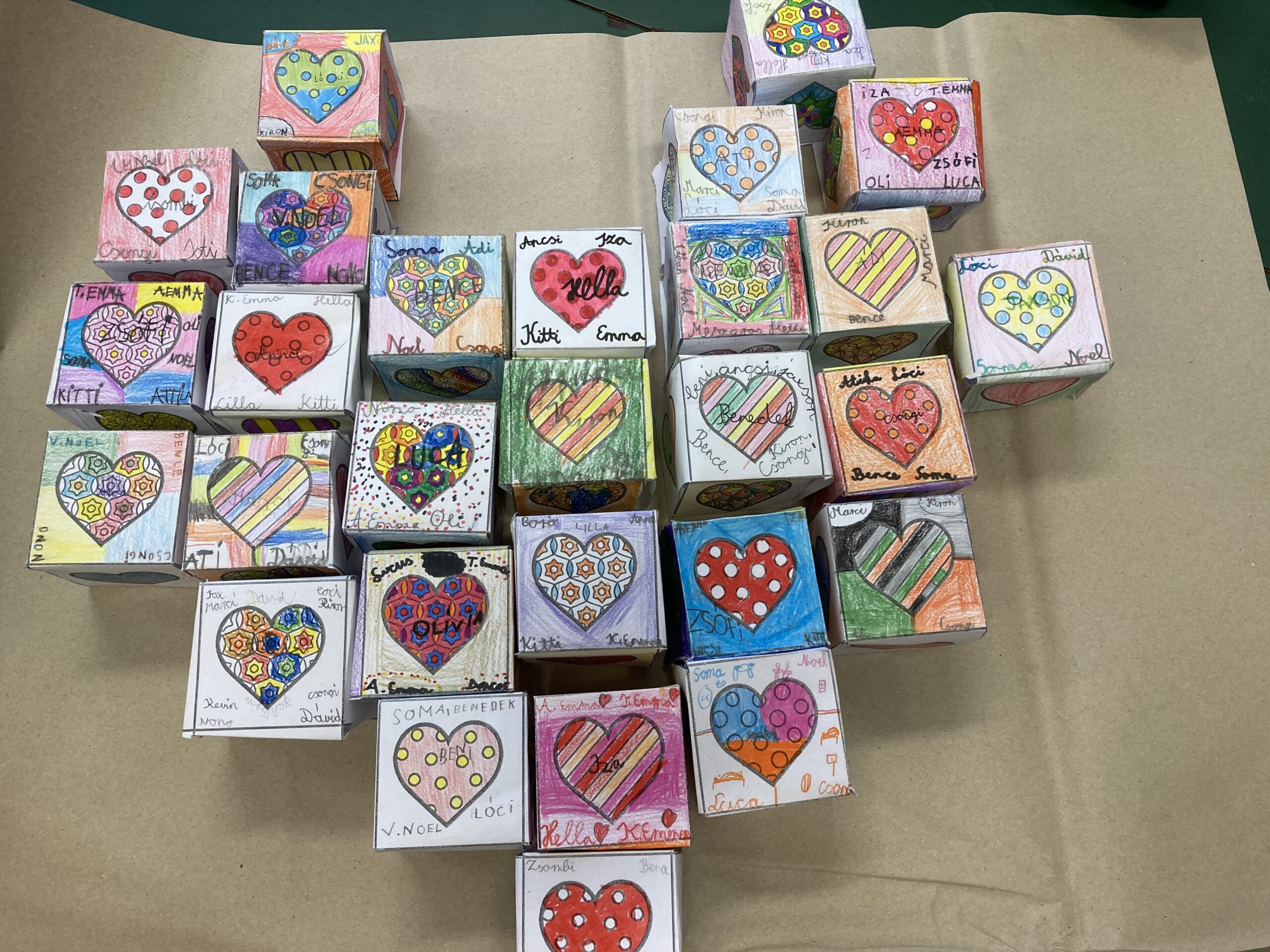 Valentin nap alkalmából életkoruknak megfelelően a baráti kapcsolatokra helyeztük a hangsúlyt, térbeli bátorság szíveket készítettünk, melybe beleírták a barátaik nevét. Egy szív formába összeragasztottuk és termünk ékes dísze lett.
