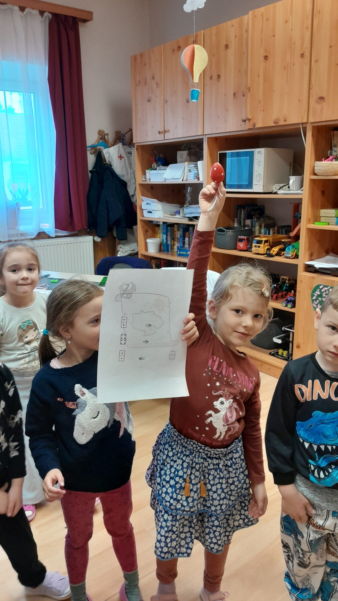 A héten Igyártó Zita Az erdő ajándéka című meséből indítottuk a boldogságóra témánkat: a megkűzdési stratégiákat. Megbeszéltük, hogy a nyulaknak hogyan sikerült megtalálnia a tojásokat, festékeket, és hogyan lehetett megoldani a lehetetlennek tűnő feladatot. A gyerekekkel tojáskeresést játszottunk, ahol különbözőképpen kellett megtalálniuk az elveszett tojásokat. Nagyon élvezték a játékot a gyerekek, közben ügyesedett a térbeli tájékozódásuk is.