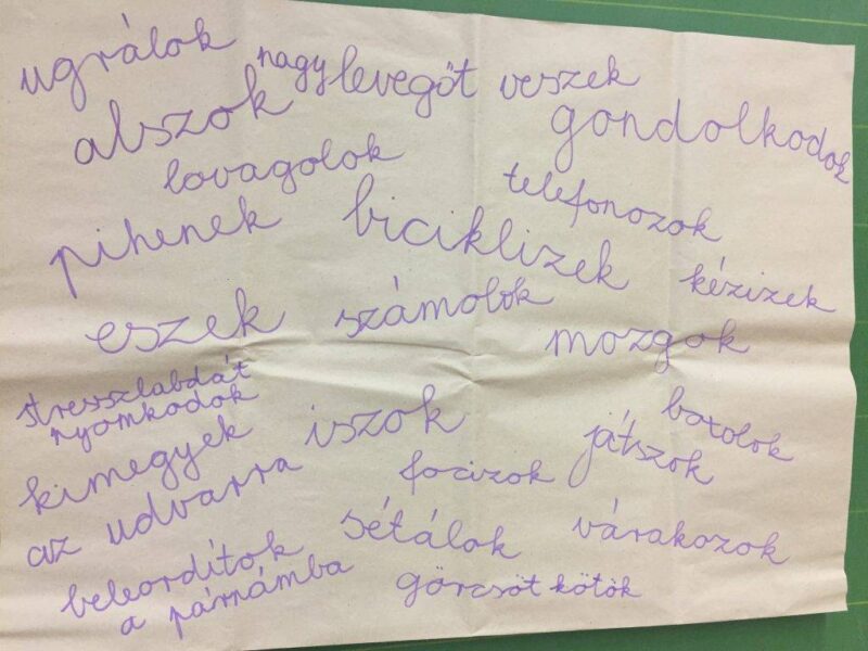 Irányítottan mindenki lerajzolta a saját megküzdési szivárványát, mely segítségével légzőgyakorlatot végeztünk. Ezután csoportokban dolgoztak a gyerekek. Minden csapat kapott egy abc-t, ahova be kellett írni, hogy mit csinálnak, ha nehézségeik vannak. Ezt össze is gyűjtöttük a végén. A foglalkozás végét most is meditációval zártuk.