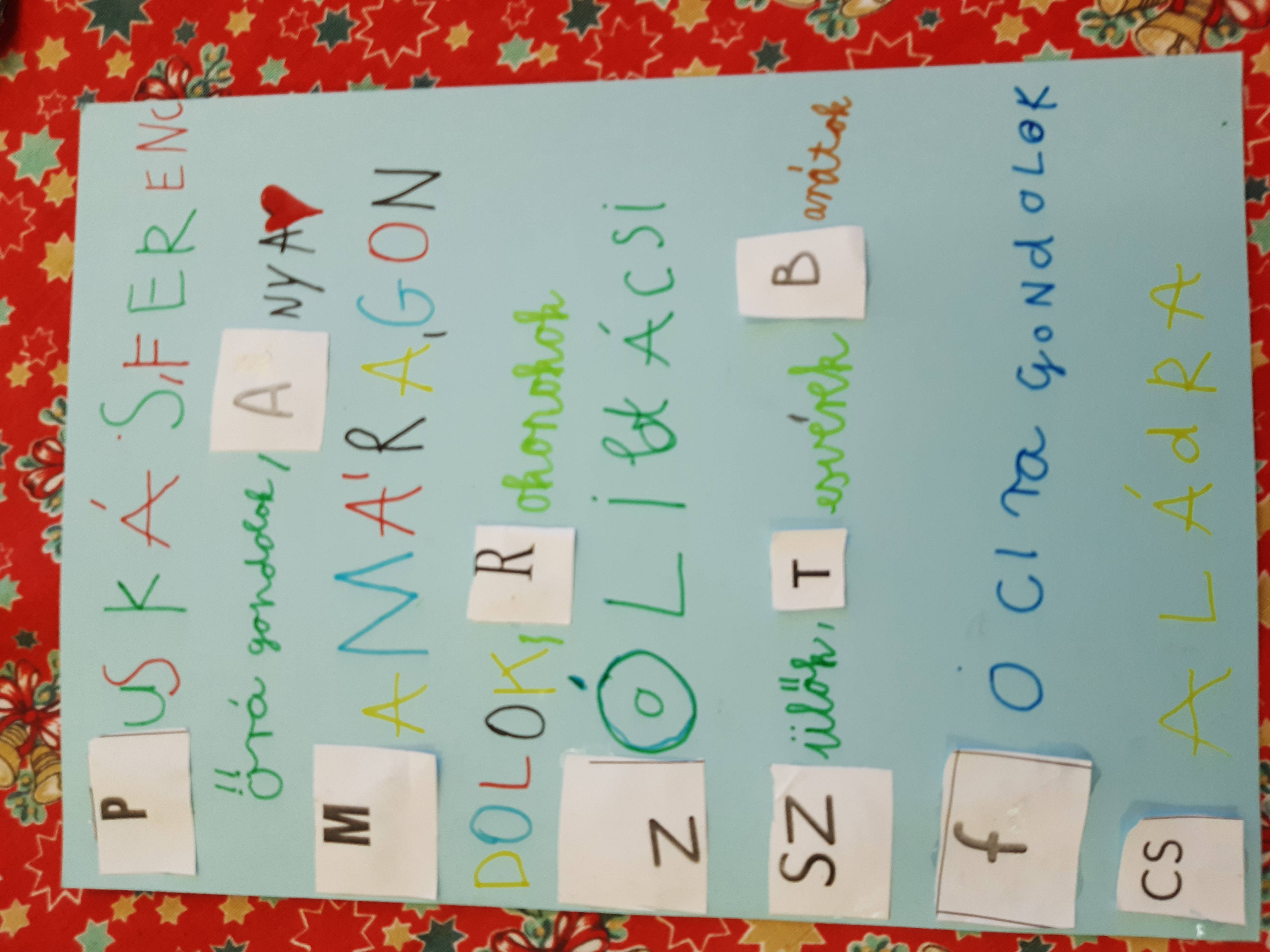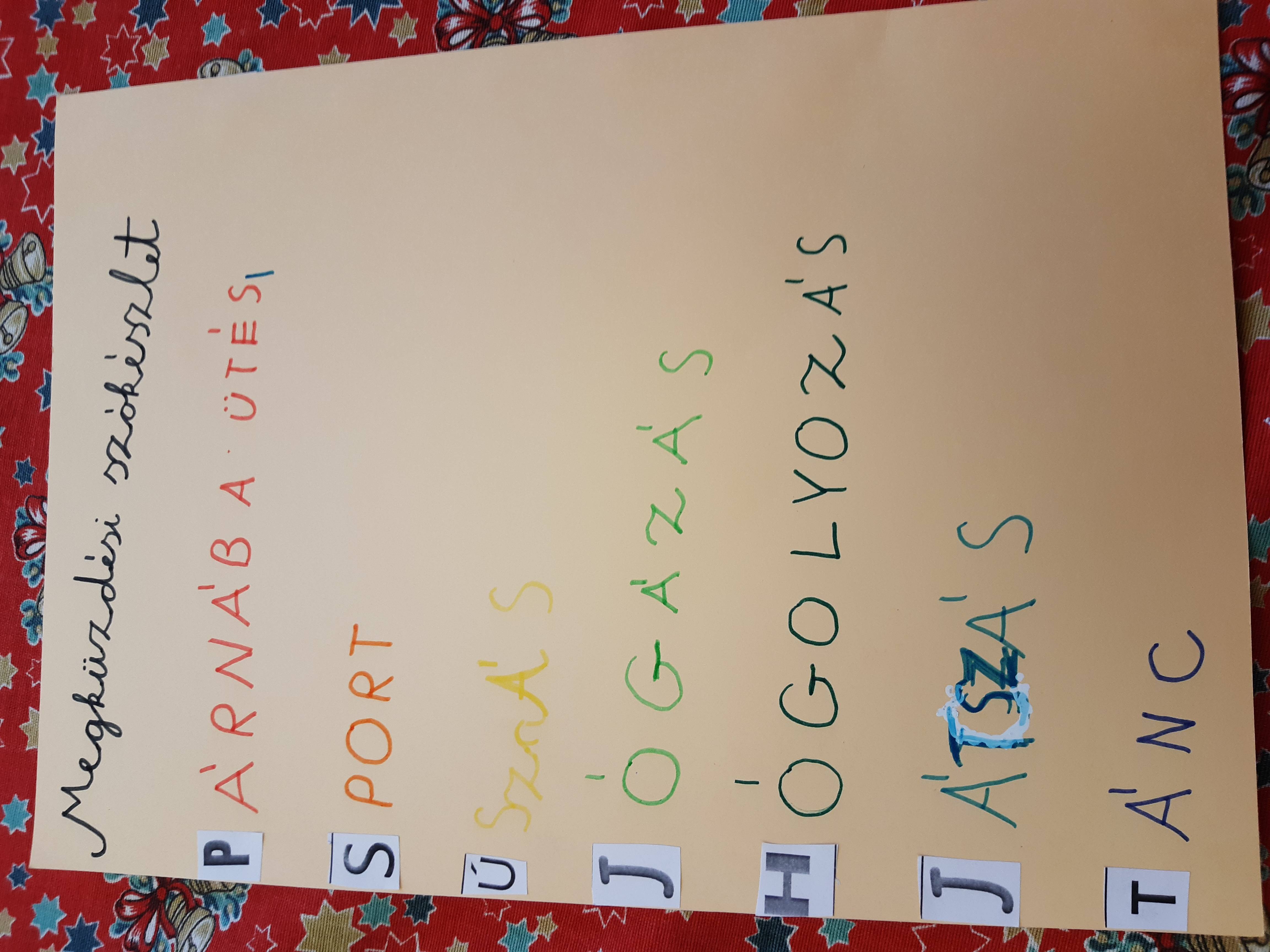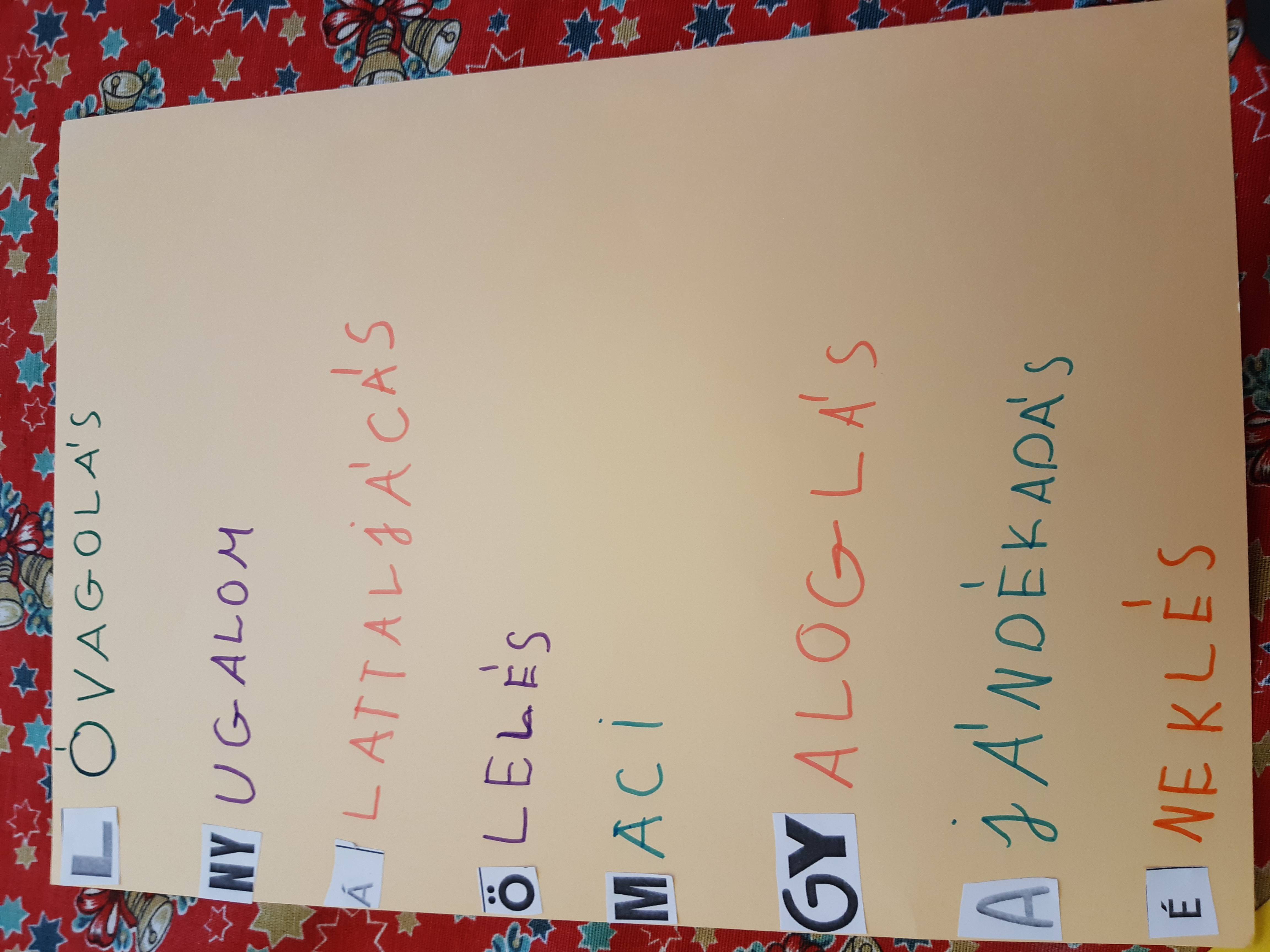 a szőnyegen, ki a pad tetején érezte jól magát a relaxáció közben.A választható feladatok közül kettőt is megcsináltunk. Felolvastam a Kecskekatonaság című magyar népmesét. Készítettünk technika órán kecskeálarcot, s el is játszottuk a mesét. Nagyon kreatívak voltak a „katonai kiképzés ” során. A szókészlet gyűjtését 3 csoportban végezték. Egészséges verseny alakult ki a csapatok között. A szavak megbeszélésekor néhámy gyermekről olyan információt tudtam meg, amit eddig nem is gondoltam volna. Új oldaláról ismerhettem meg néhányukat, s ez jó érzés volt számomra.
