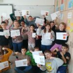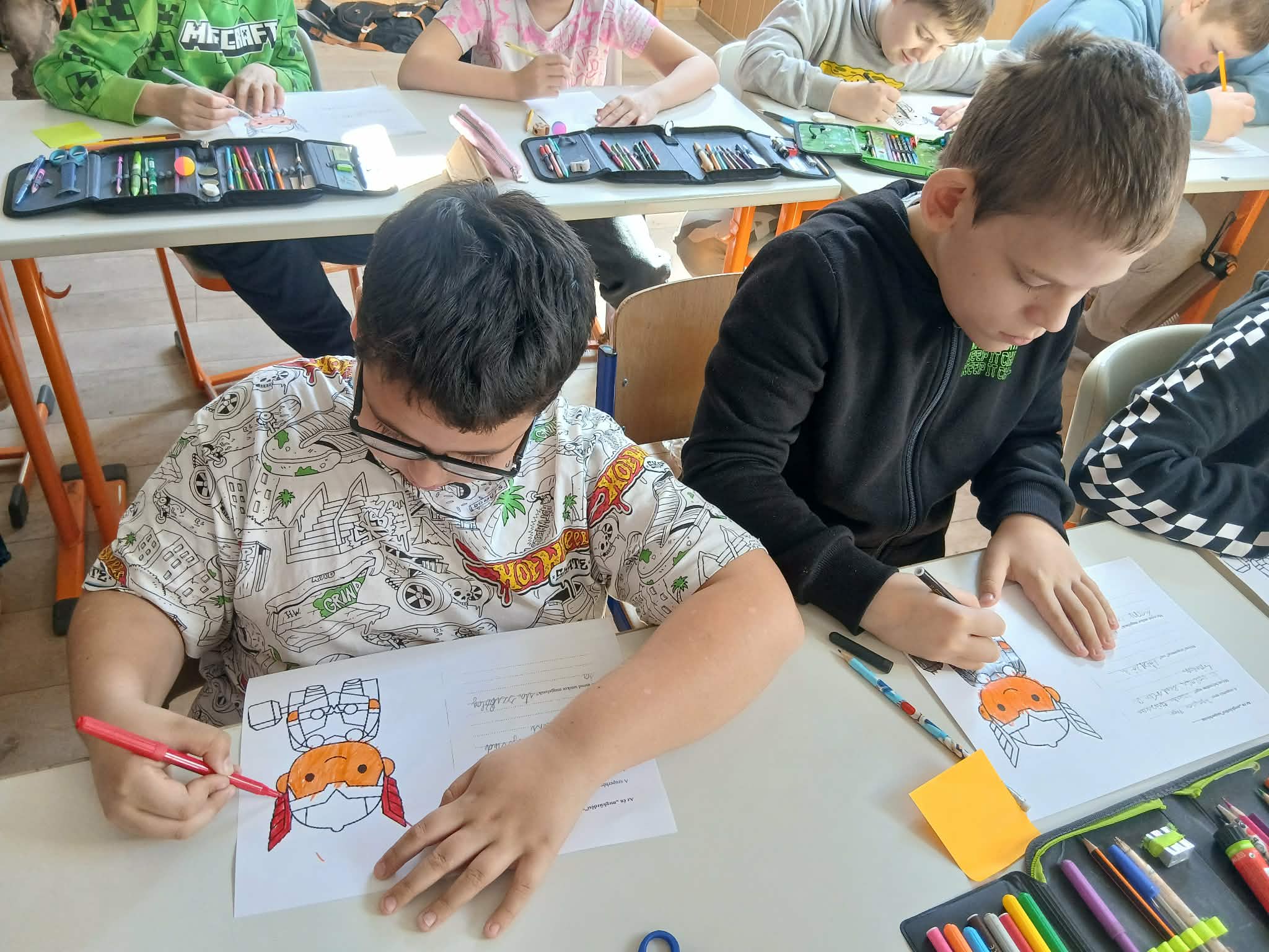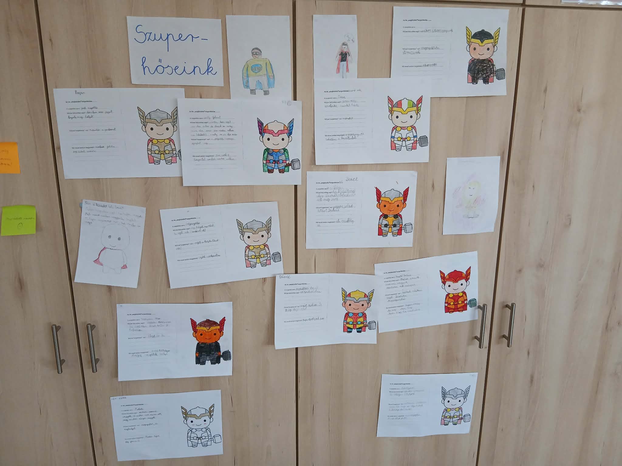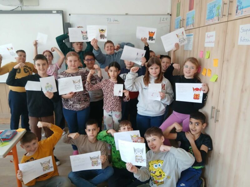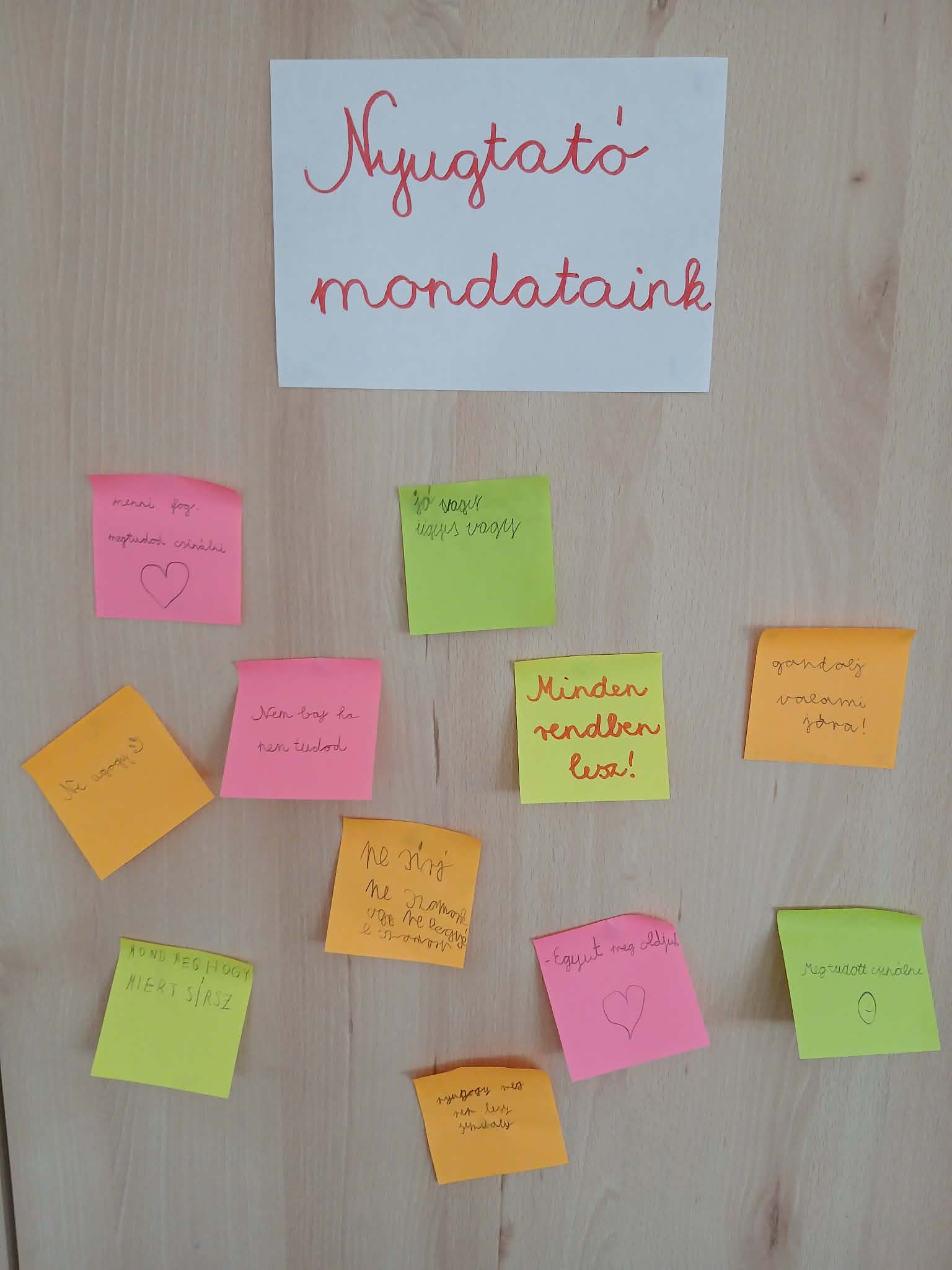 A hónap boldogságórájára úgy hangolódtunk rá, hogy mondatokat kellett befejezni a gyerekeknek, amelyek így kezdődtek: Mit tennél, ha…(Összevesznél a brátoddal, rossz jegyet kapnál, kinevetnének, ha izgulnál felelés előtt). Nagyon érdekes dolgok hangzottak el ebben a feladatban. Ezt követően beszélgettünk a megküzdési stratégiáról, illetve annak fő típusairól. Példákat is gyűjtöttünk rájuk. Ezt egy kreatív feladat követte: „Az én megküzdési szuperhősöm” címmel. Ebben a feladatban tervezniük kellett egy „megküzdési szuperhőst”. El kellett nevezni. Le kellett írni, hogy milyen helyzetben segít, milyen szuperereje van, mit mond amikor megjelenik. A kreatív feladatot mozgásos minigyakorlat követte: A „lélegző lufi”. Kezek a hason, belégzéskor felfújják a lufit, kilégzéskor lassan kiengedjük. Megbeszéltük, hogy mikor tudnánk ezt használni? Befejezésként színes papírokra olyan nyugtató mondatokat írtak a tanulók, amit barátjuknak mondanának, ha bajban lenne.