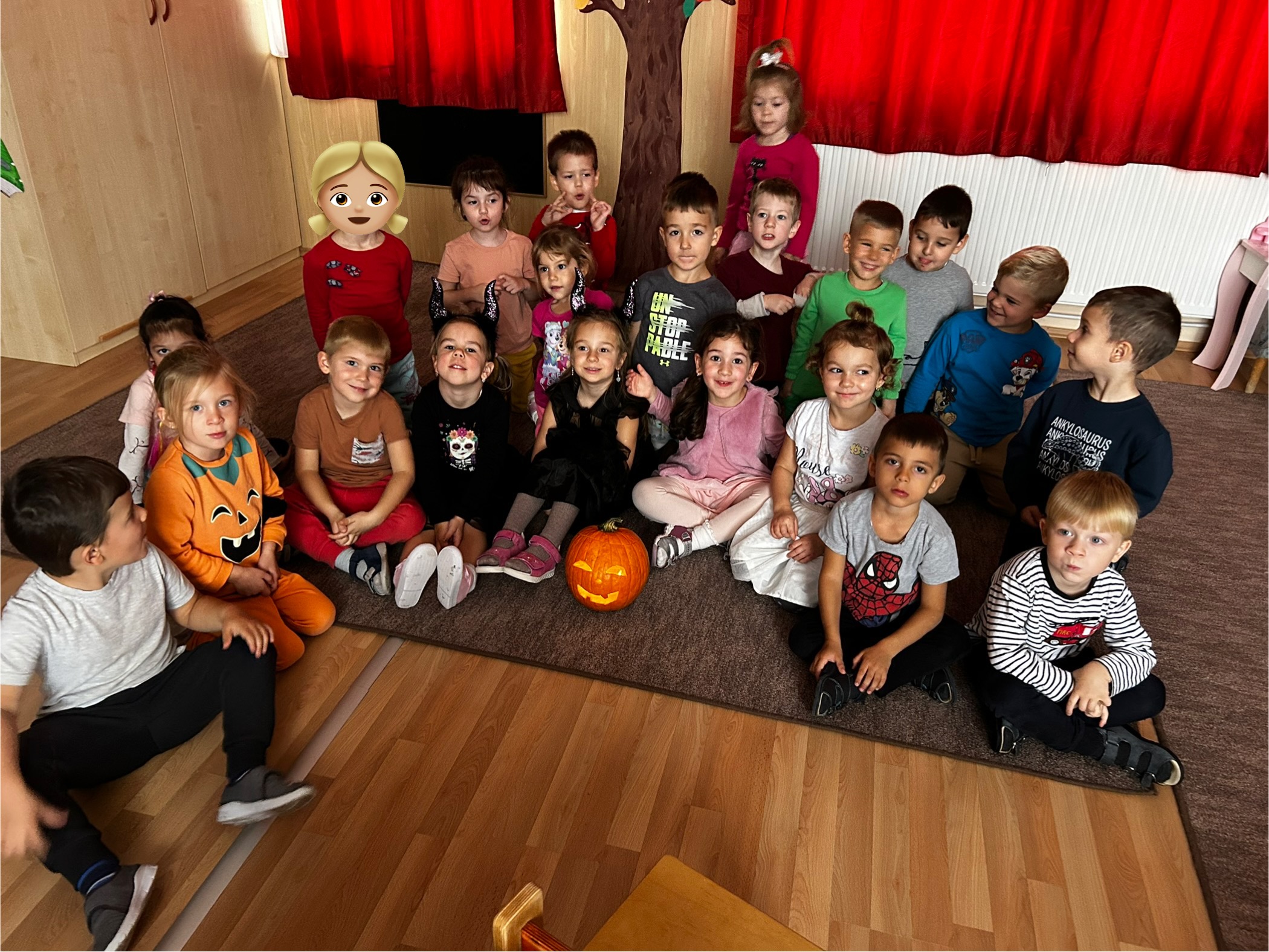 Közösen „boldog tököt” faragtunk, ami igazi csapatmunka volt. A gyerekek közösen döntöttek arról, milyen legyen a tök arca – természetesen mosolygós lett! A közös alkotás során megtapasztalták az együttműködés örömét és azt, milyen jó érzés, ha valamit közösen hozunk létre. A „boldog tök” a csoportszoba dísze lett, és minden nap emlékeztet minket arra, hogy egy kis nevetés mindig segít.