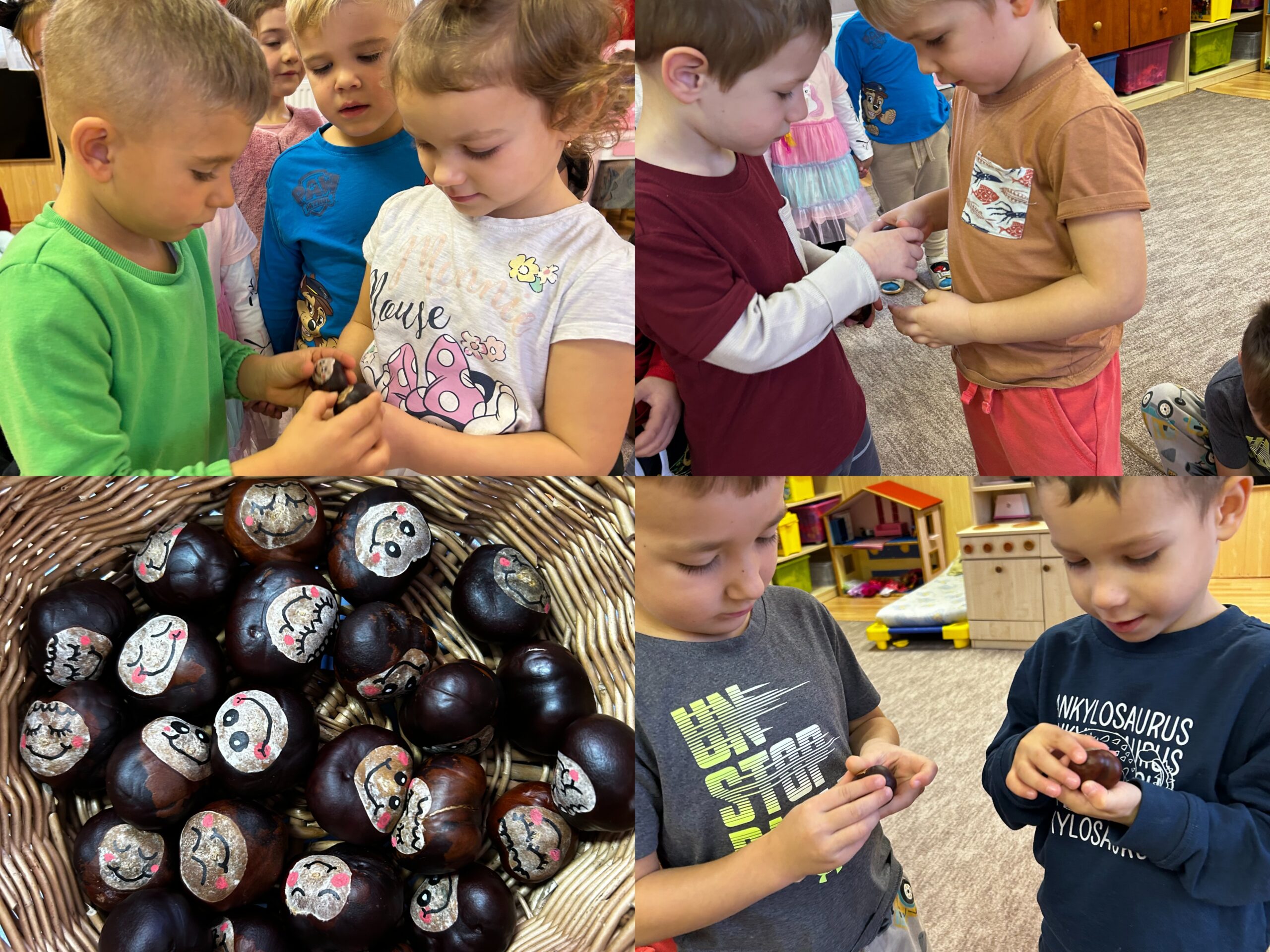 A következő tevékenységünk a „mosolygó gesztenyék keresése” volt. A csoportszobában elrejtettünk vidám arcú gesztenyéket, és a gyerekek izgatottan keresték őket. Amikor mindenki megtalálta a saját „mosolygó gesztenyéjét”, elmondtuk, miért pont azt választottuk, mitől lett az „boldog gesztenye”. Ezután mindenki kiválasztott egy társát, akinek ajándékba adta a gesztenyéjét, ezzel is gyakorolva az önzetlenséget, az odafigyelést és az örömszerzést másoknak.