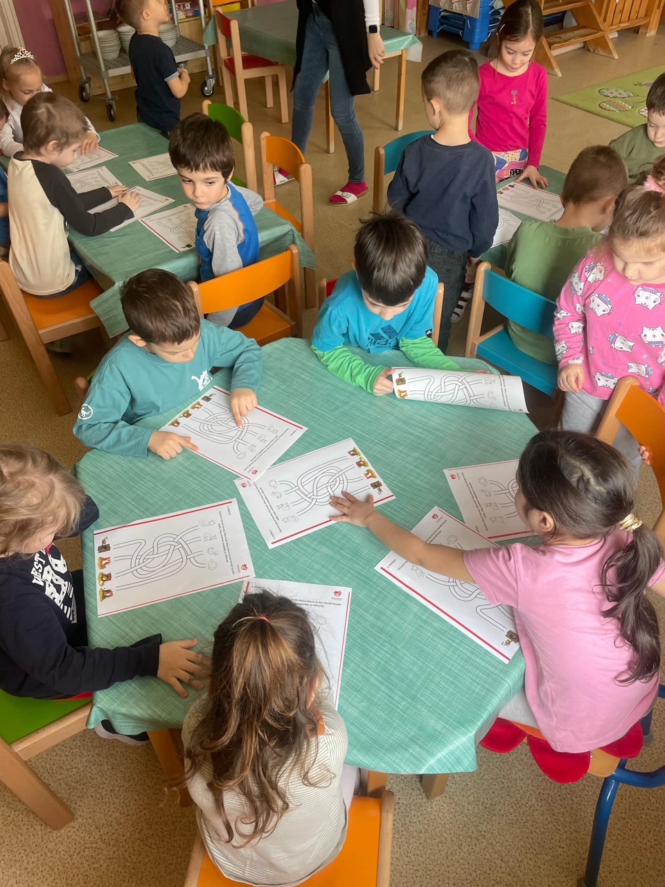 Csupaszívvel indult a mese- és beszélgetőkör, majd Az erdei tisztás című történetet meséltem el a gyerekeknek, aminek a tanulsága az, hogy bármilyen probléma, akadály kerül elénk, azt valamilyen módon le tudjuk küzdeni. A történet szereplői Sün Soma, Róka Rudi, Nyuszi Panna és Mókus Marci. Ők is kitalálták azt, hogy a pocsolyával, ami az erdei tisztáson keletkezett, mit tudnak kezdeni, hogyan tudják a javukra fordítani a kialakult helyzetet. A mese végén a történethez kapcsolódó útkeresőt kapott minden gyermek, ezen a 4 szereplőt színezhették ki, illetve mind a 4 állatot el kellett vezetni a társához, különféle kanyargós utakon. Ehhez kapcsolódóan egy társasjátékot is kipróbálhattak.