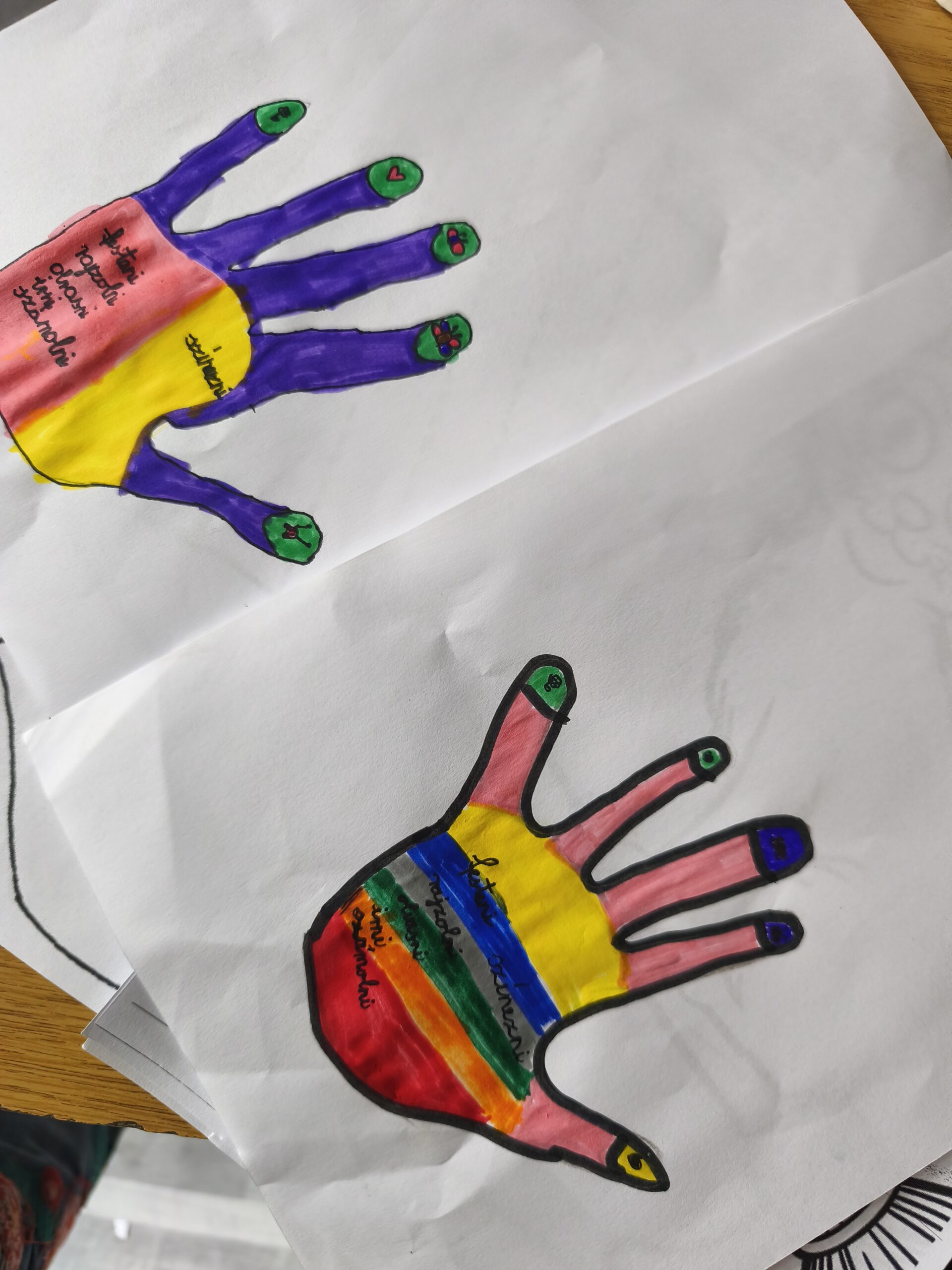 A gyerekek körberajzoltàk a tenyerüket,kidíszítettèk a felületet ès minden ujjuk mellè odaírtak apró dolgokat,amiket a tavalyi èv soràn tanultak,majd olyanokat is,amiket meg szeretnènek tanulni.
